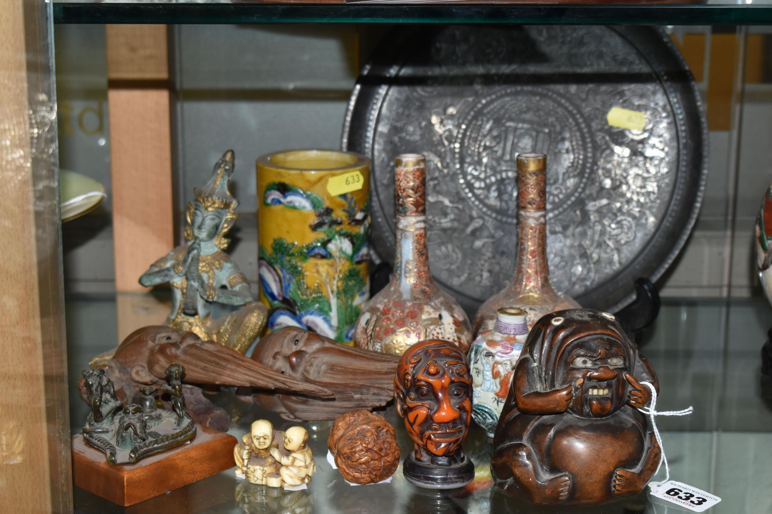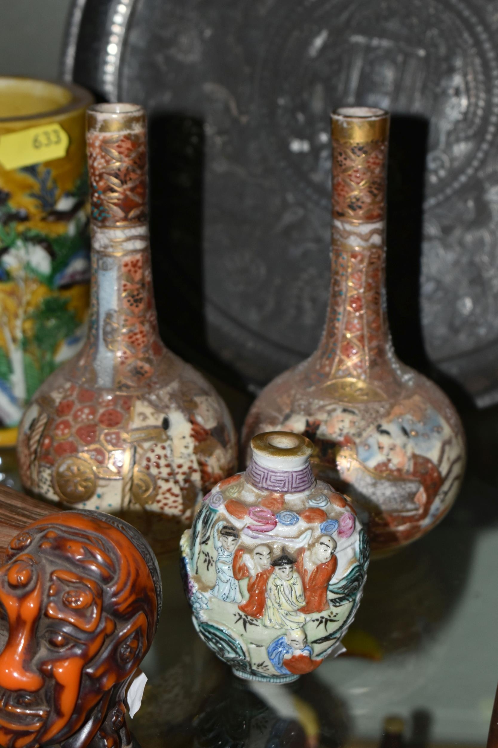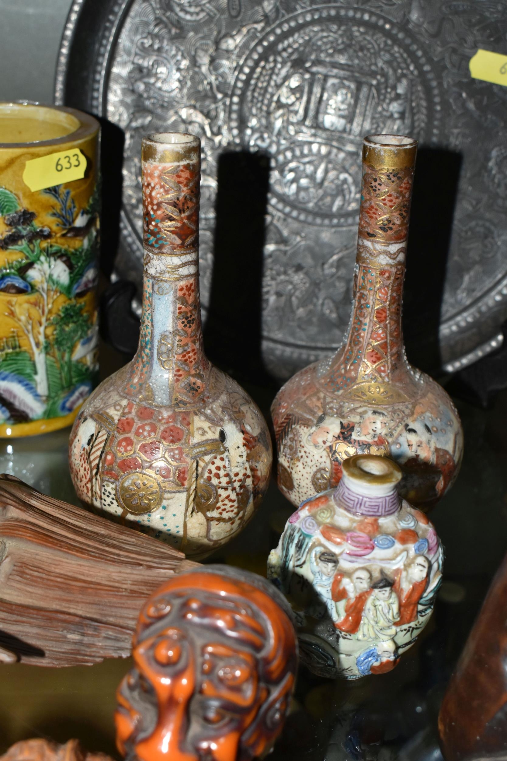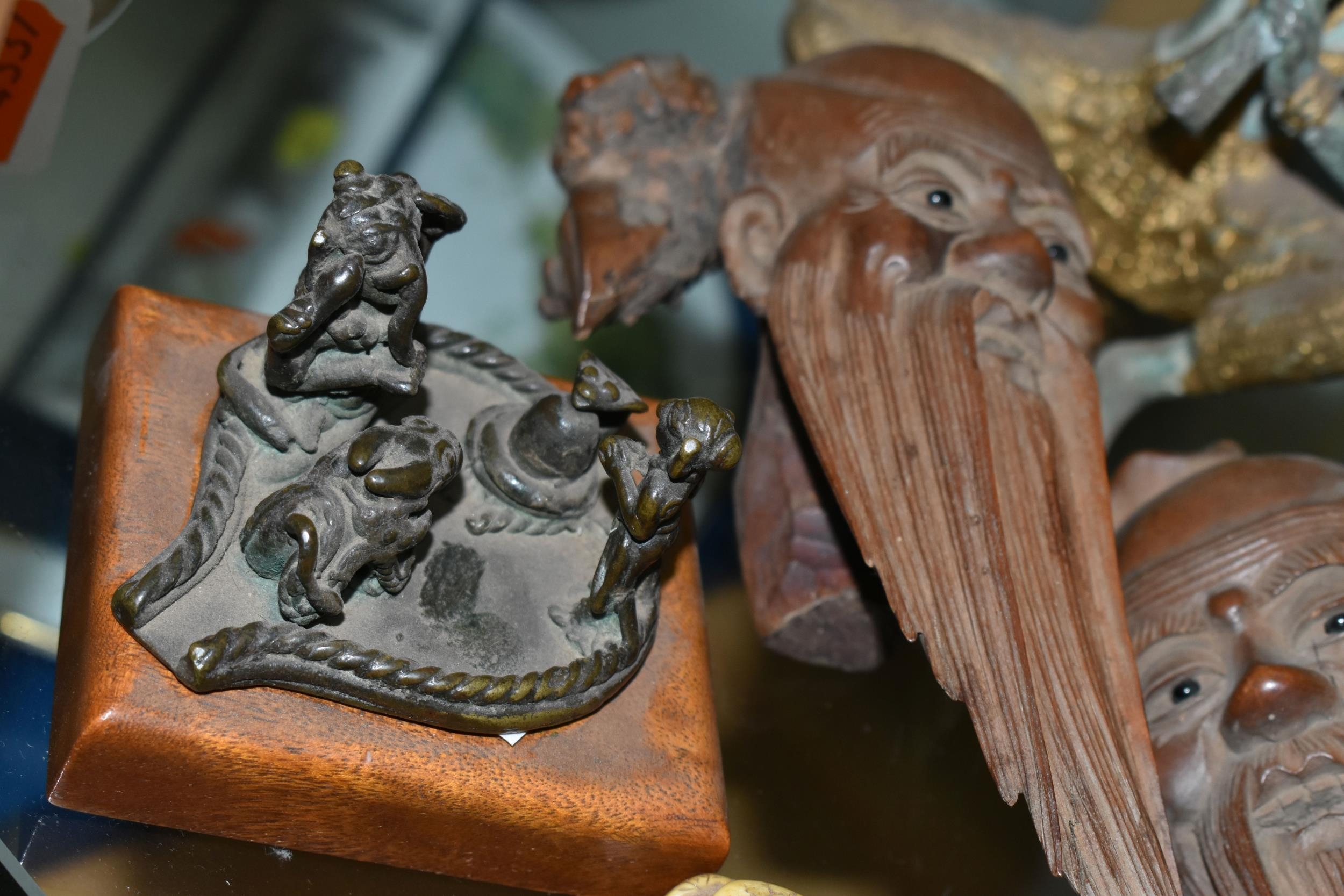 A GROUP OF ORIENTAL AND ASIAN CERAMICS, TREEN, METALWARE, ETC, including a late 19th century Japanese treen tobacco box /tonkotsu, with mother of pearl eyes, lacks back and base, height 9.5cm, a porcelain snuff bottle with relief decoration, height 7.5cm, a bone netsuke of two figures, two carved bearded male faces, two Satsuma pottery onion shaped vases, a resin and metal mounted erotic seal, small bronze group on a wooden plinth, etc (12)