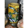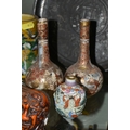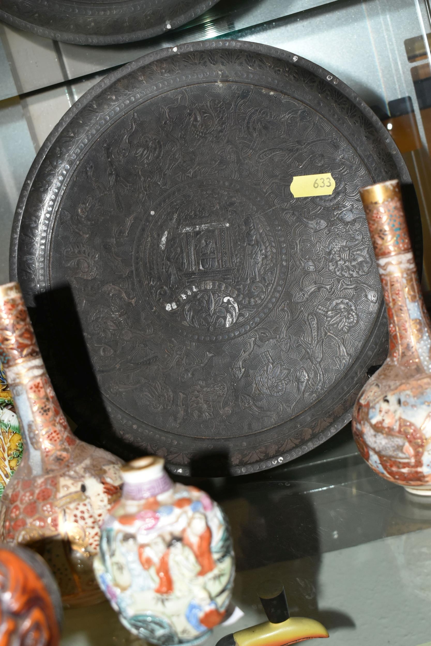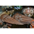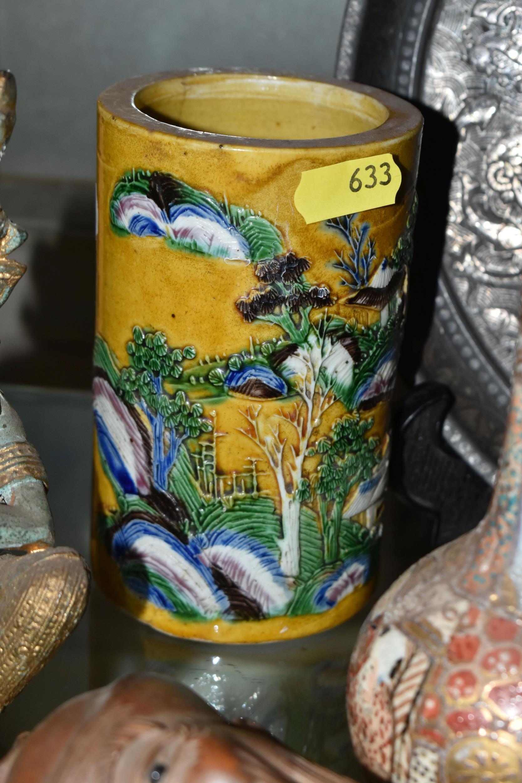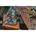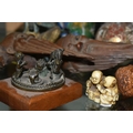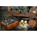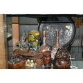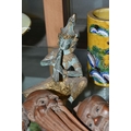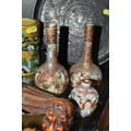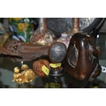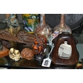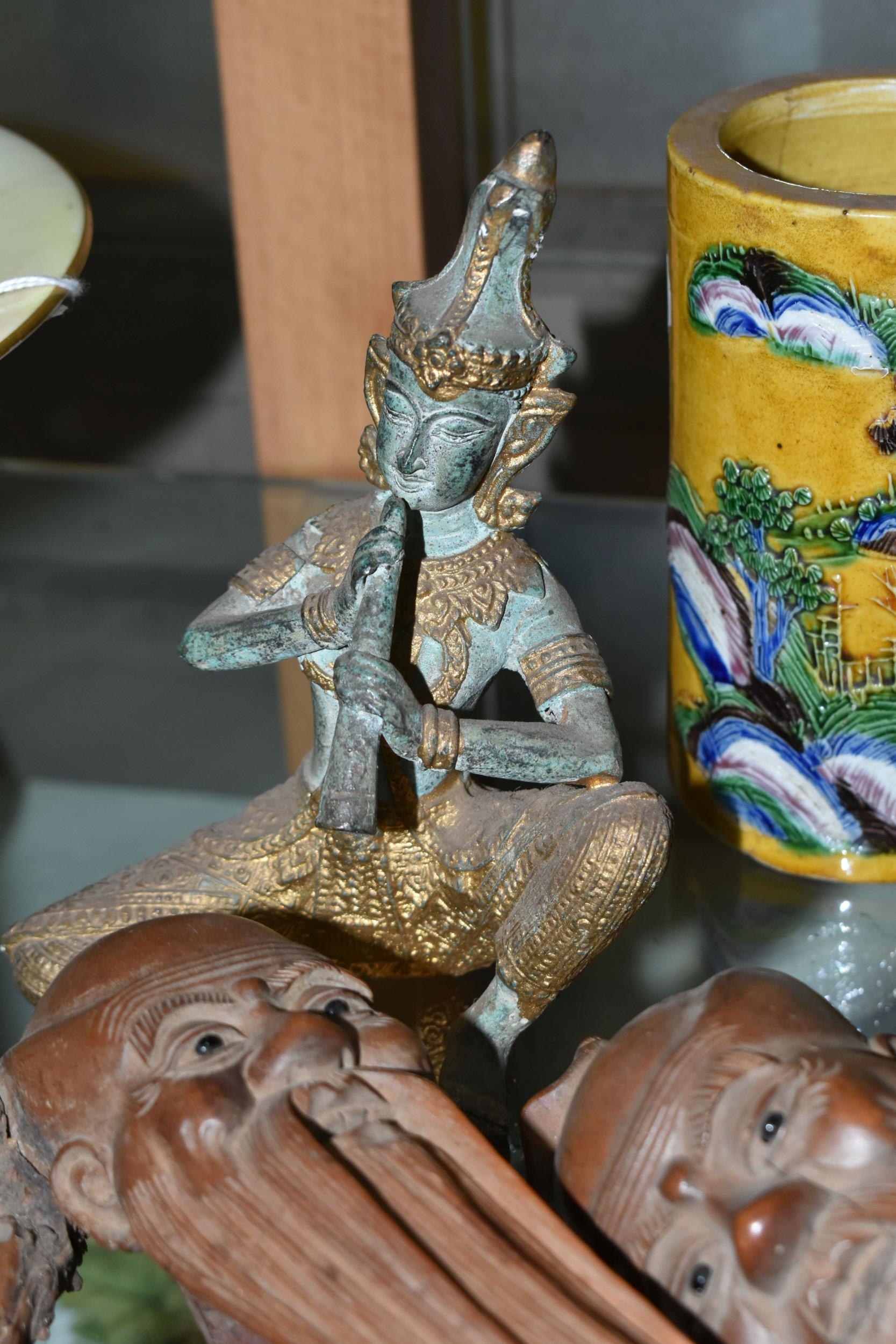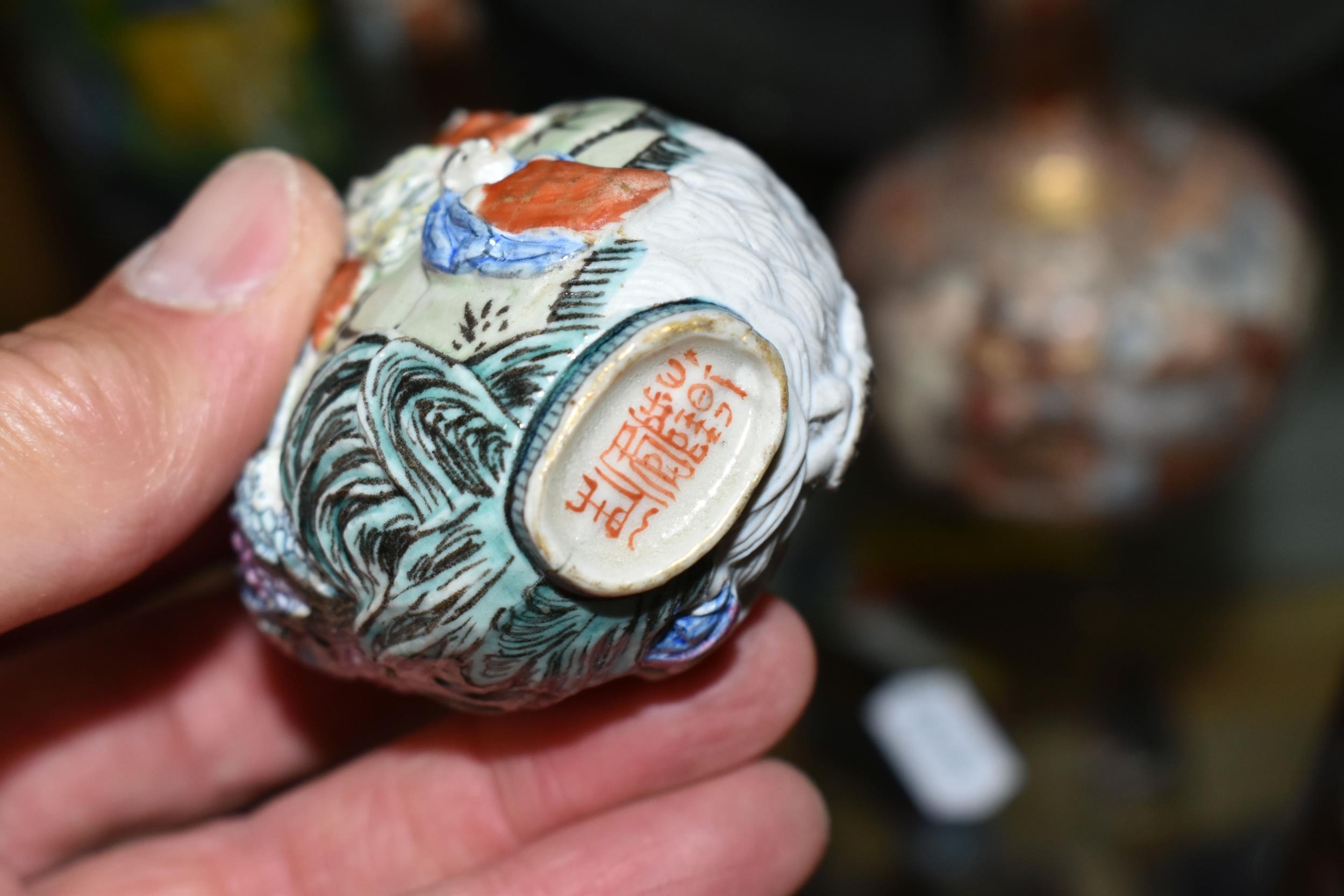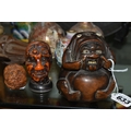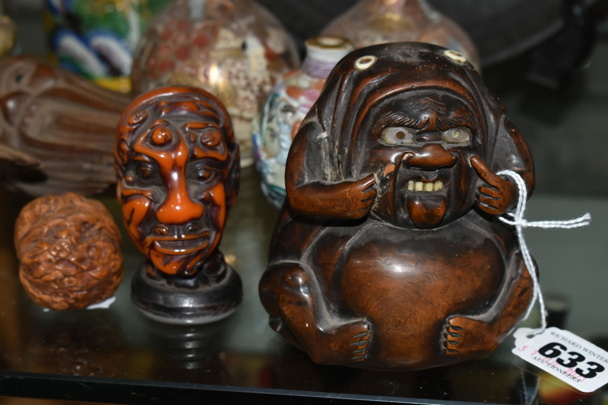 A GROUP OF ORIENTAL AND ASIAN CERAMICS, TREEN, METALWARE, ETC, including a late 19th century Japanese treen tobacco box /tonkotsu, with mother of pearl eyes, lacks back and base, height 9.5cm, a porcelain snuff bottle with relief decoration, height 7.5cm, a bone netsuke of two figures, two carved bearded male faces, two Satsuma pottery onion shaped vases, a resin and metal mounted erotic seal, small bronze group on a wooden plinth, etc (12)