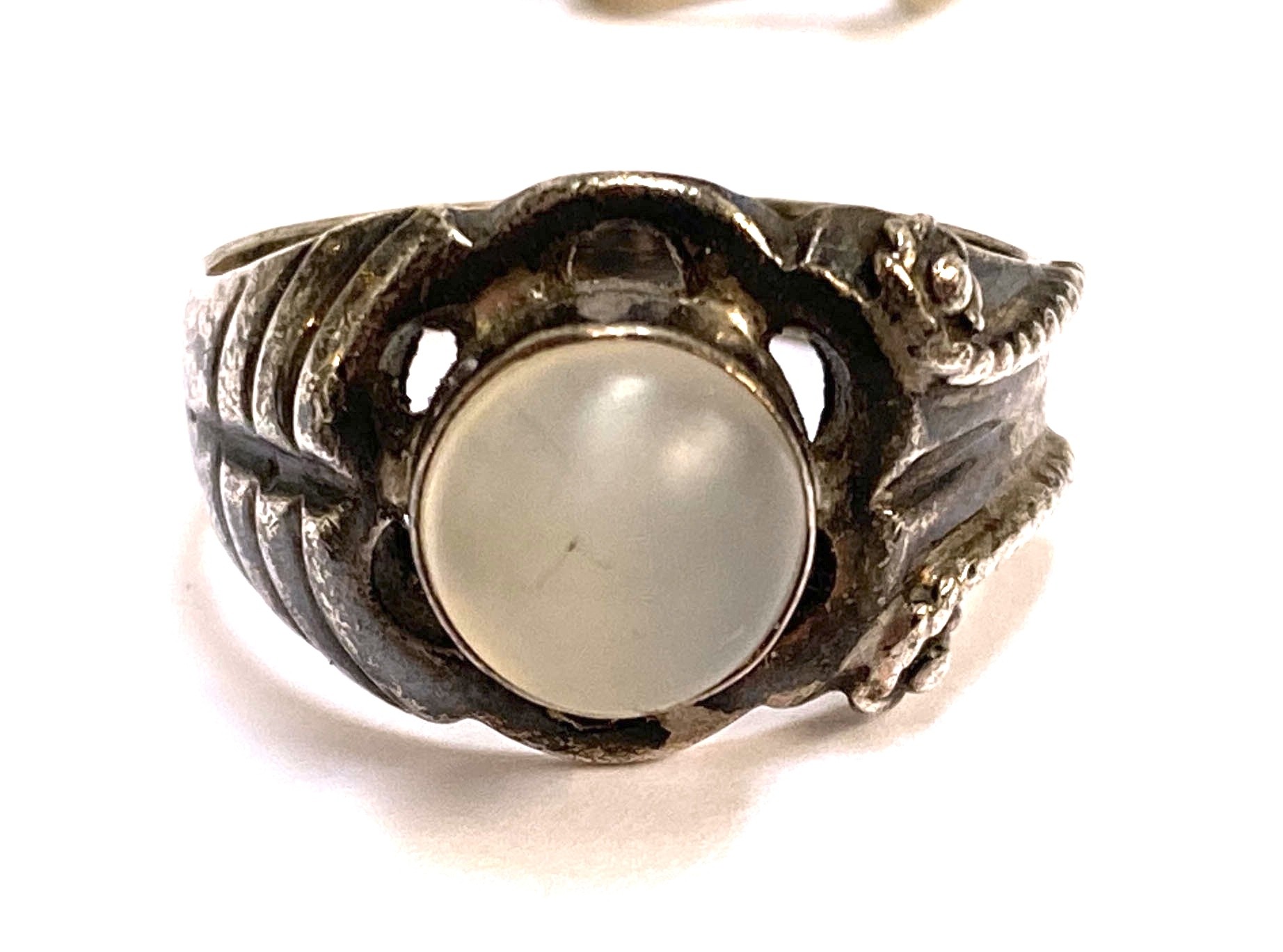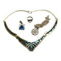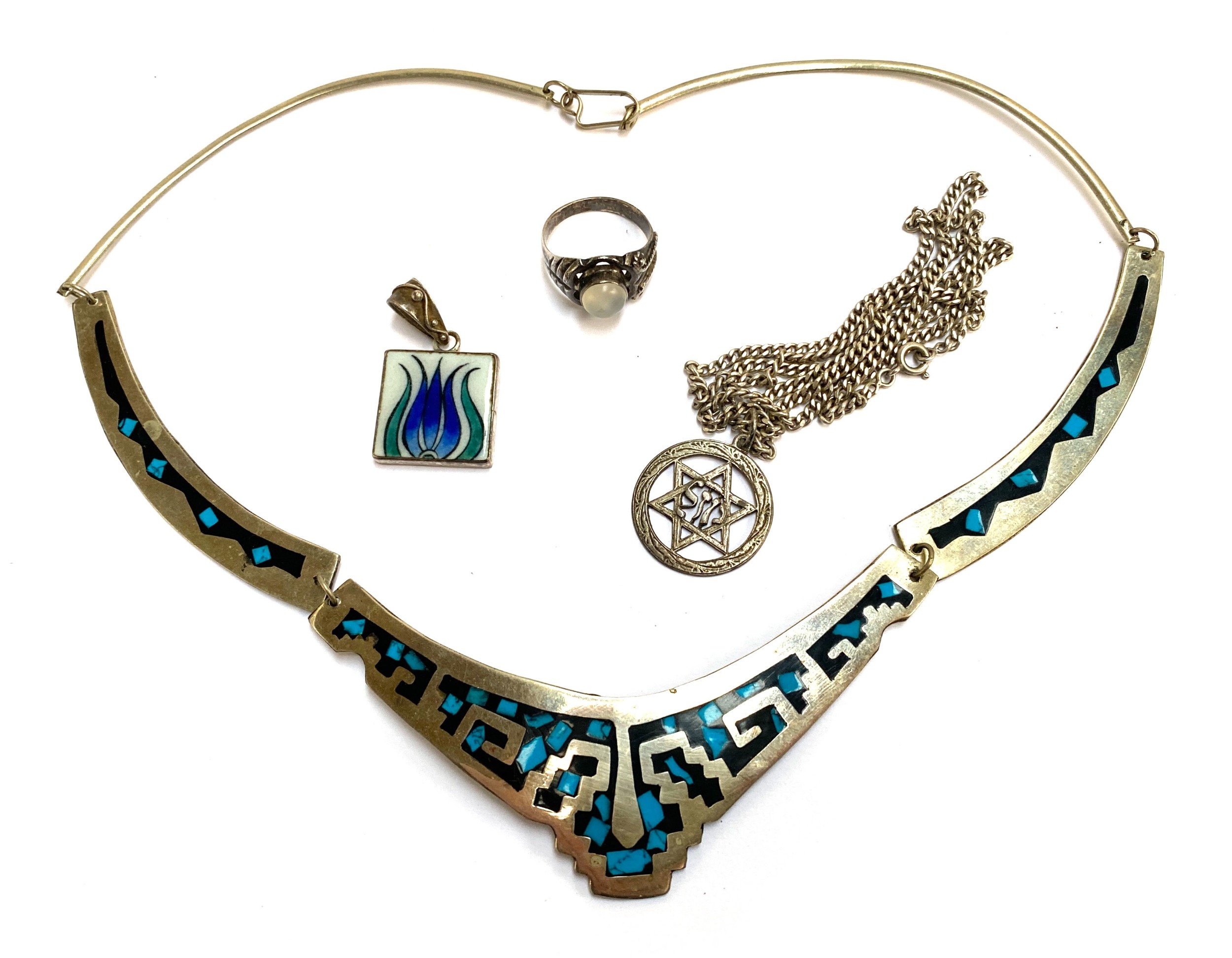 A 925 silver and glazed pottery tile pendant; an Alpaca necklace; and a 925 silver and chalcedony ring with asymmetrical shoulders, size R; and a silver Star of David pendant on chain, 13.3g