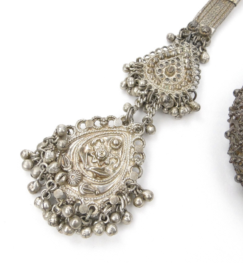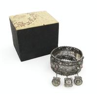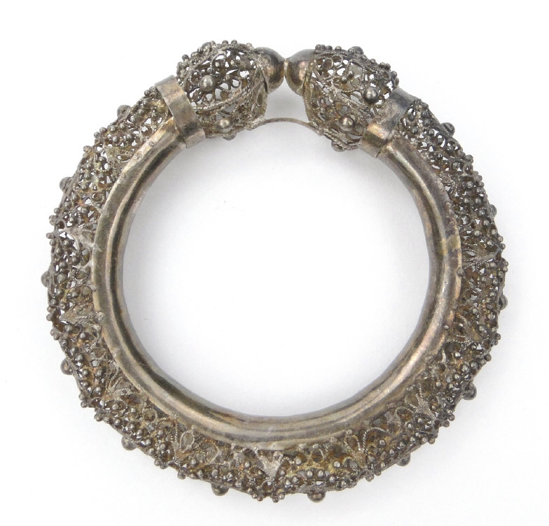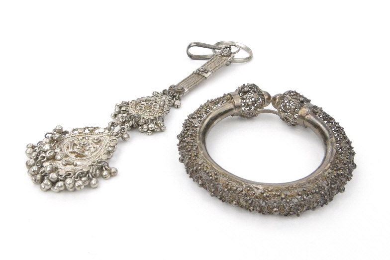 Oriental silver coloured metal filigree bangle and a similar belt hook