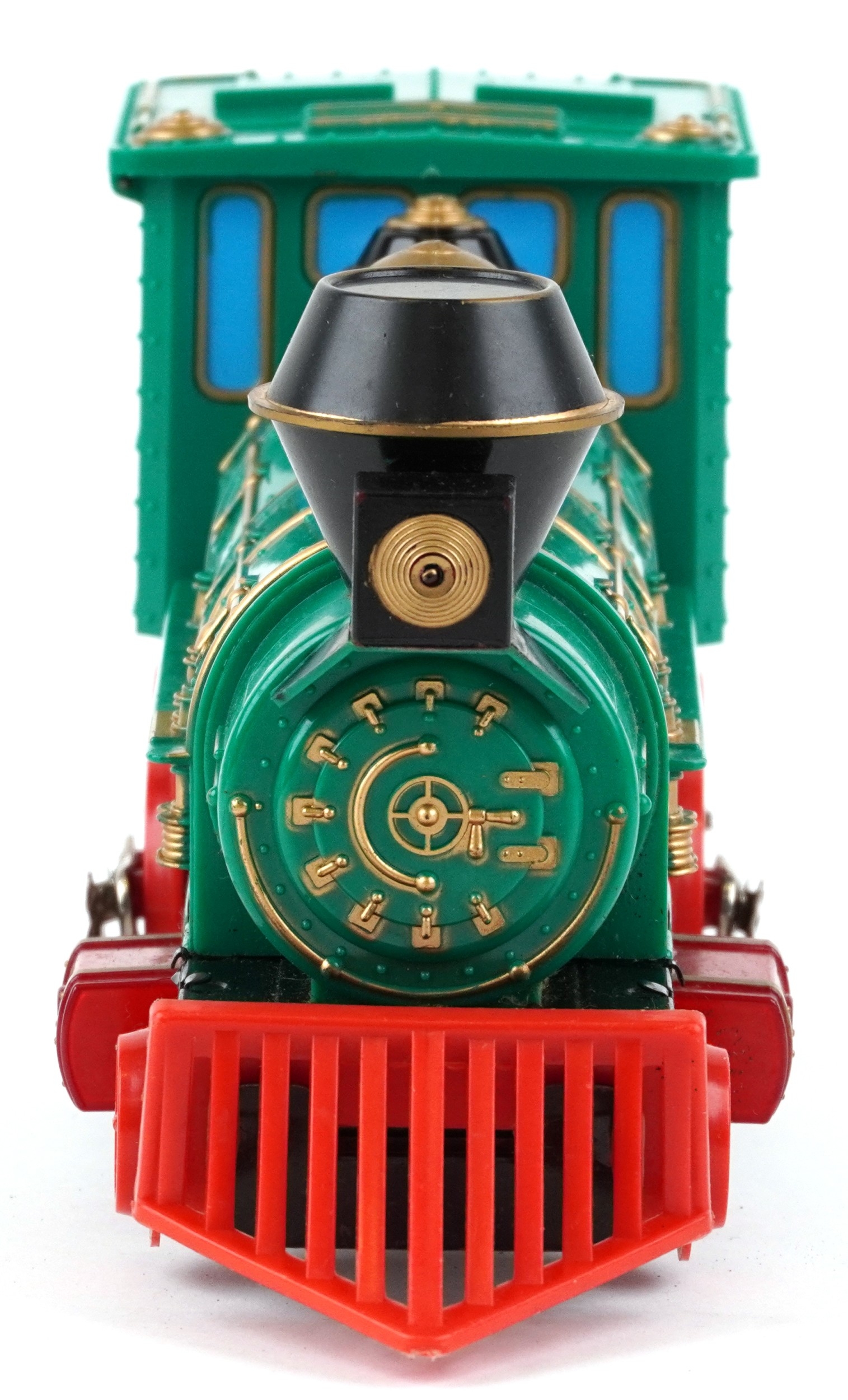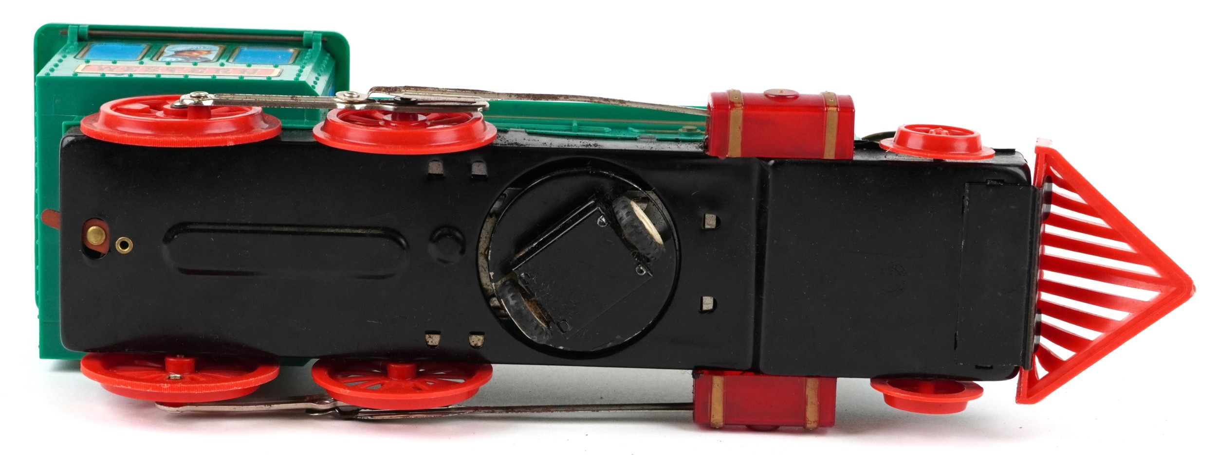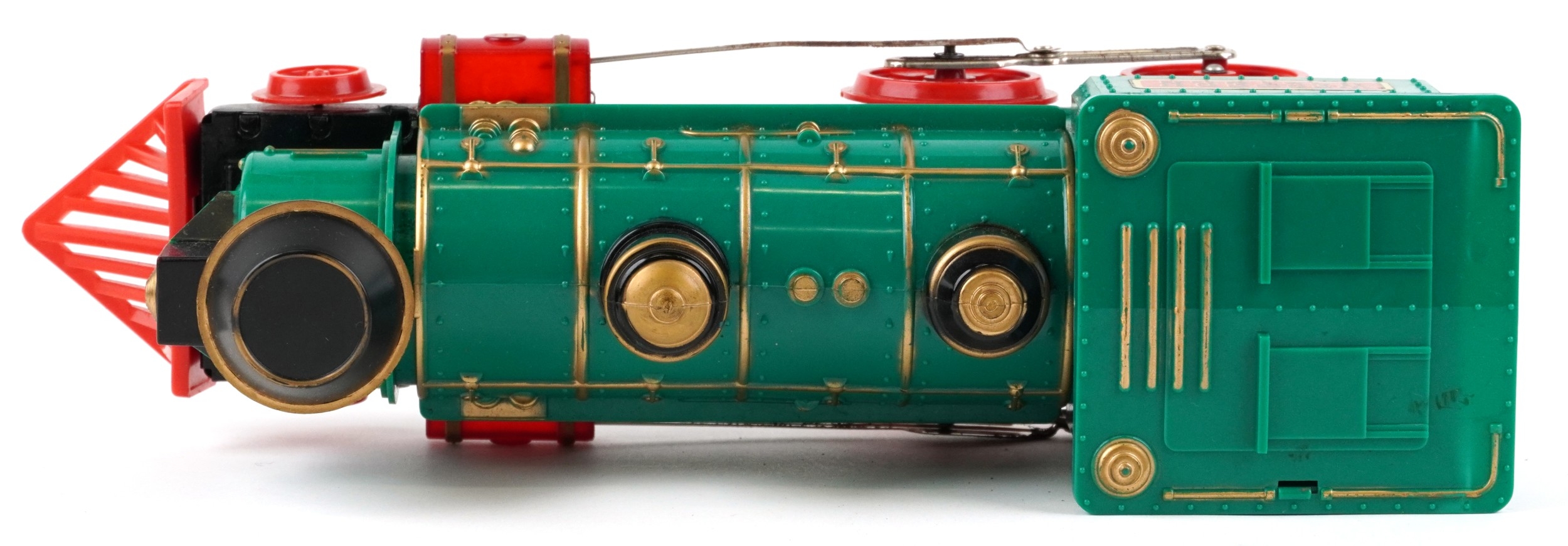 A Marx whistling lighted piston locomotive battery operated plastic toy train, 33cm wide, boxed.