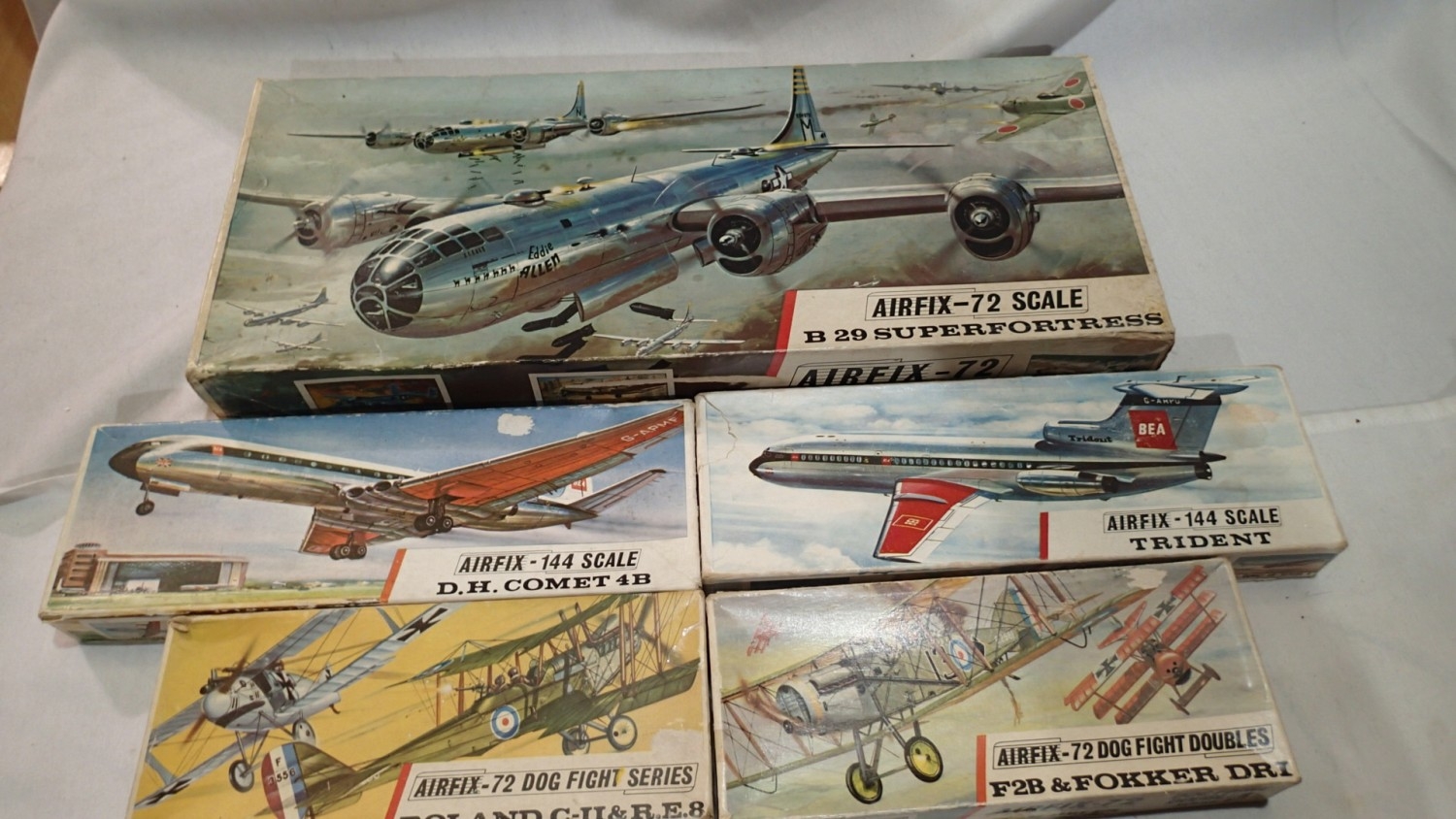 Five Airfix aircraft kits, 1/72 scale, including super fortress, 'Dogfight Double', trident and comet airliners, contents unchecked, boxes poor. UK P&P Group 2 (£24+VAT for the first lot and £5+VAT for subsequent lots)