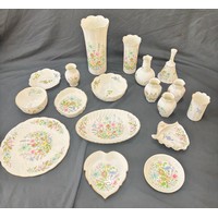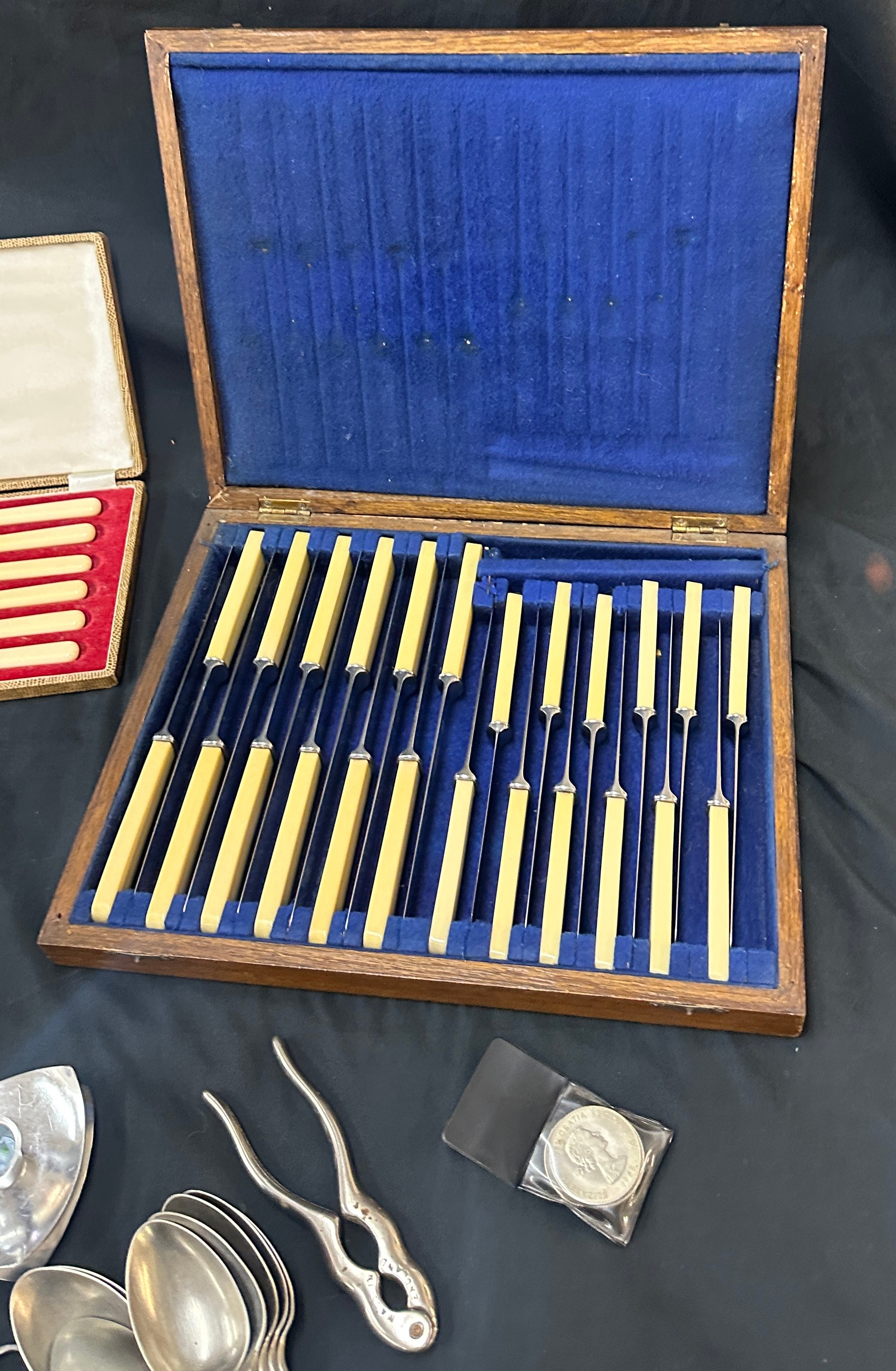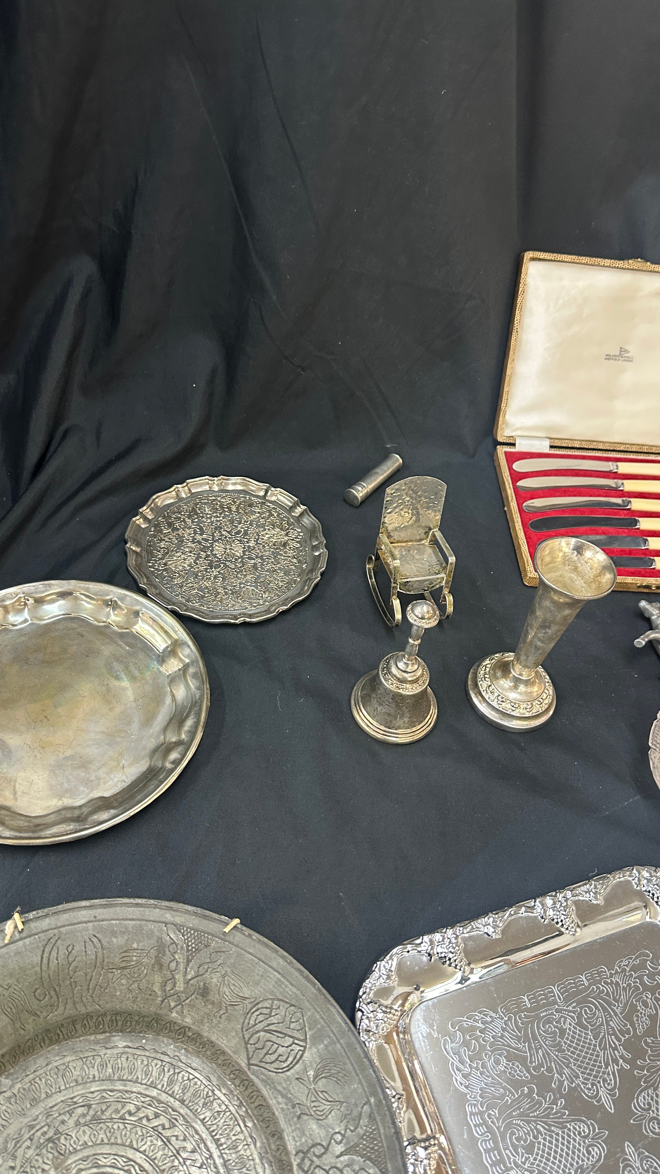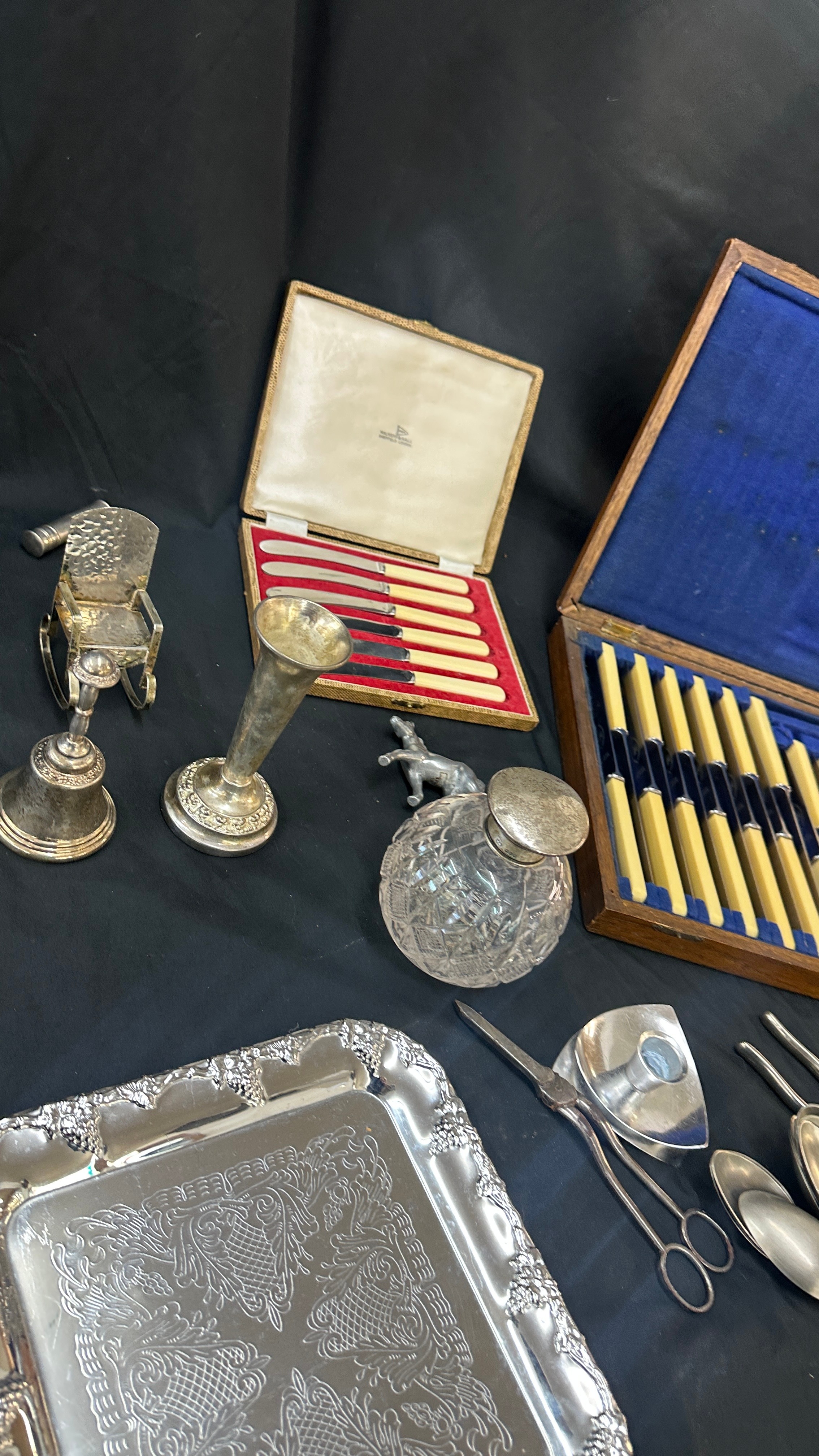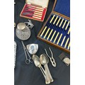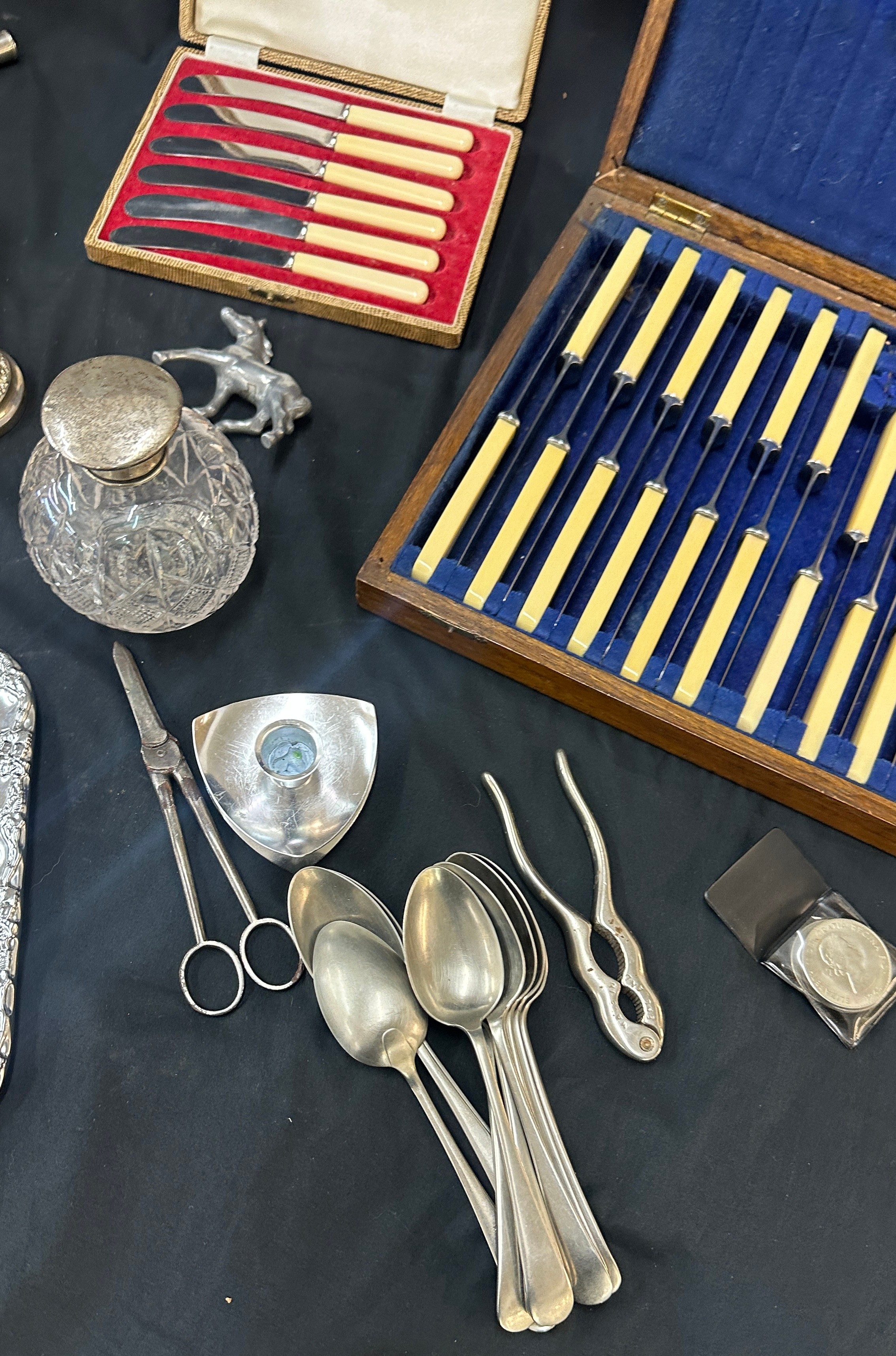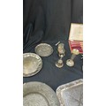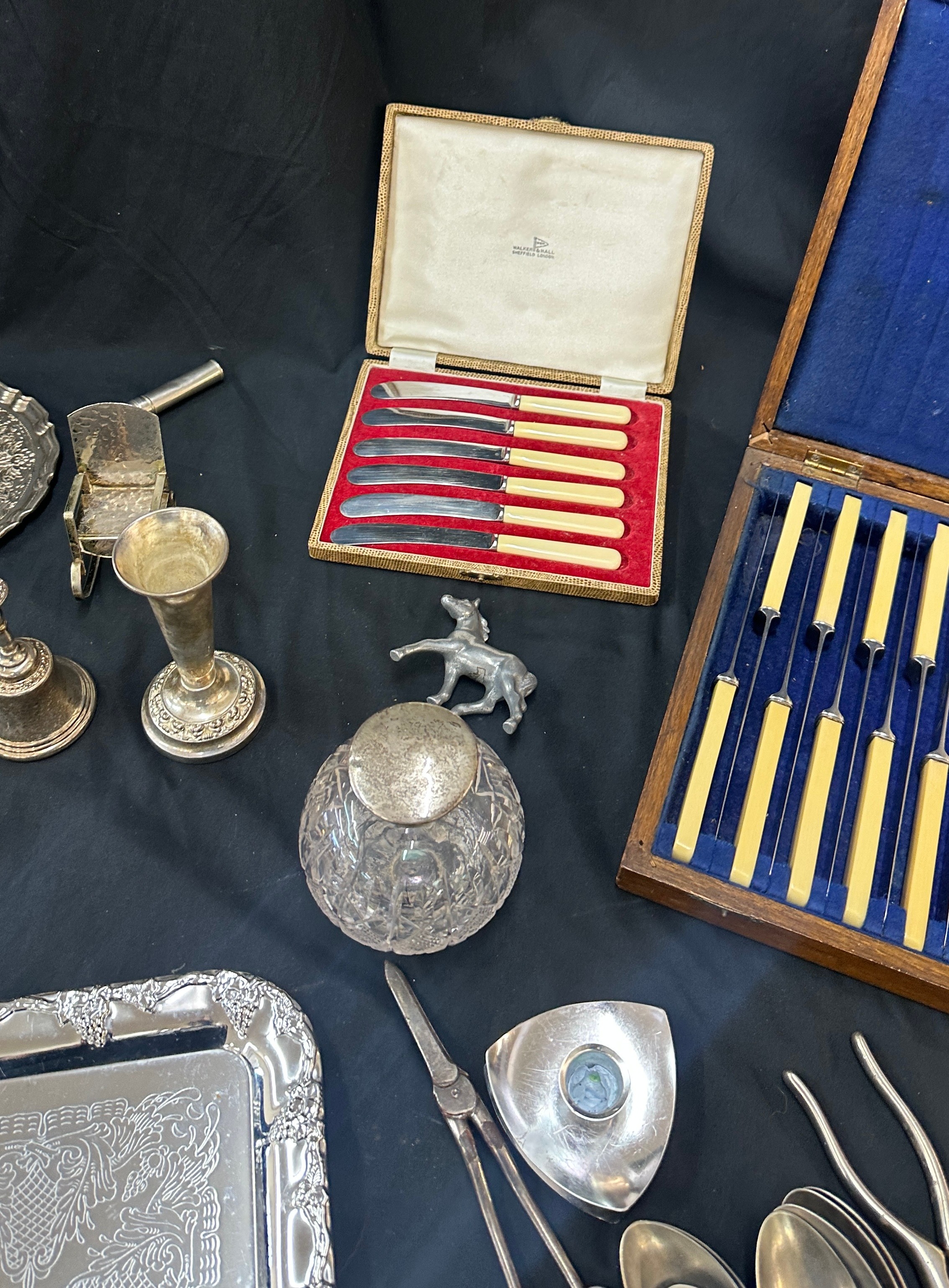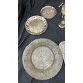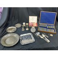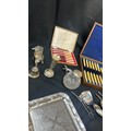 Large selection of vintage and later metal ware includes silver topped jar etc