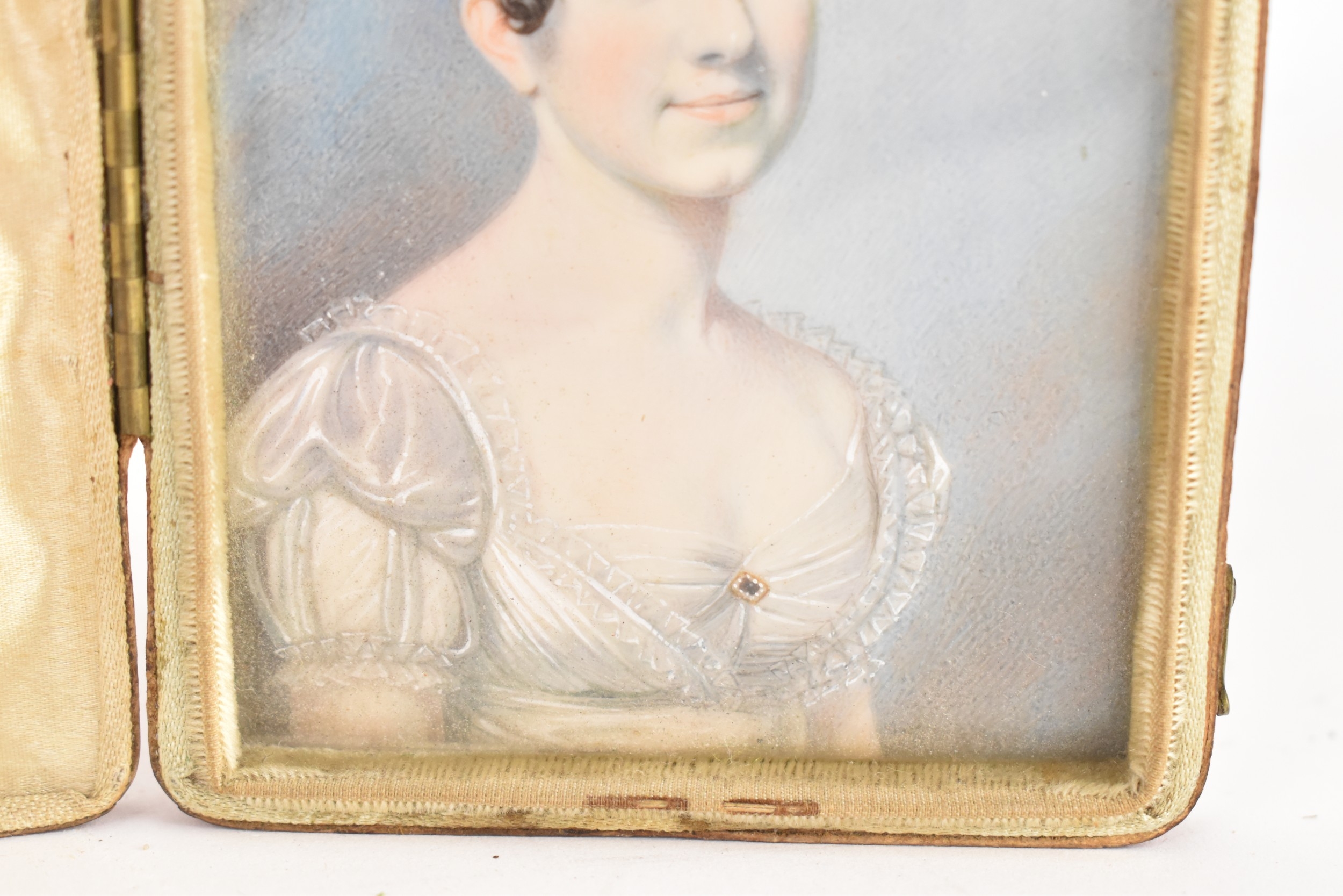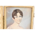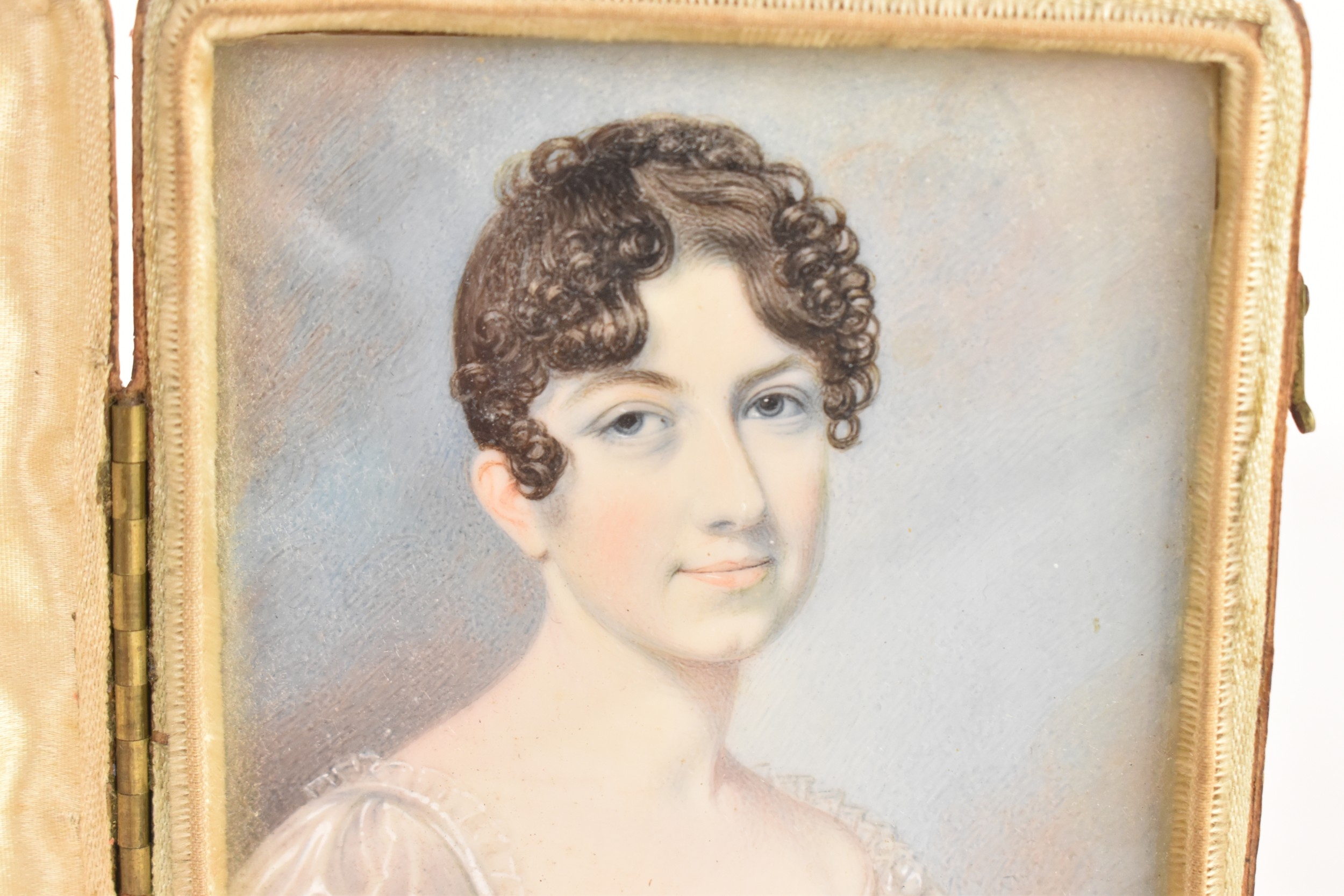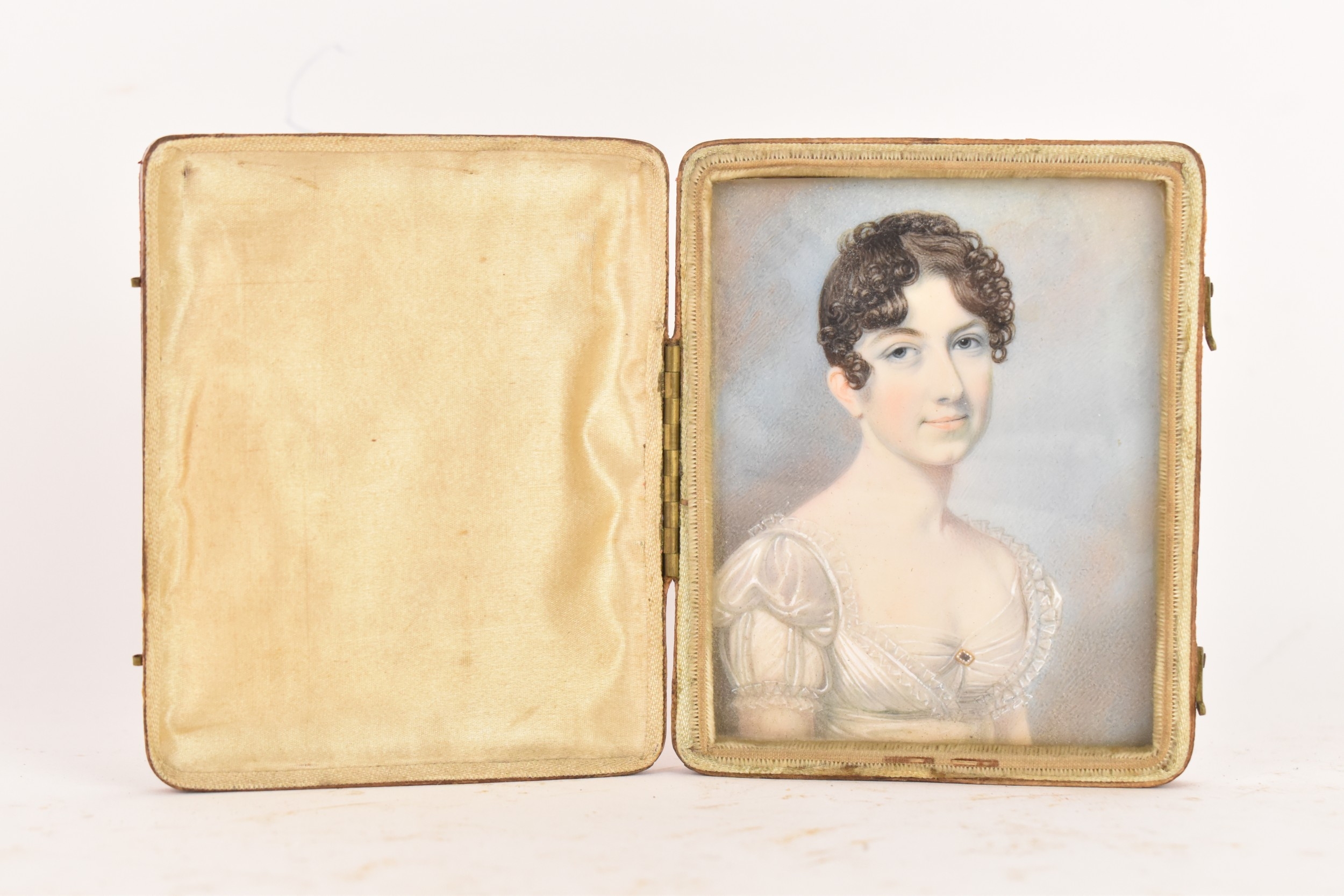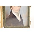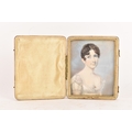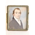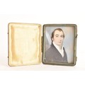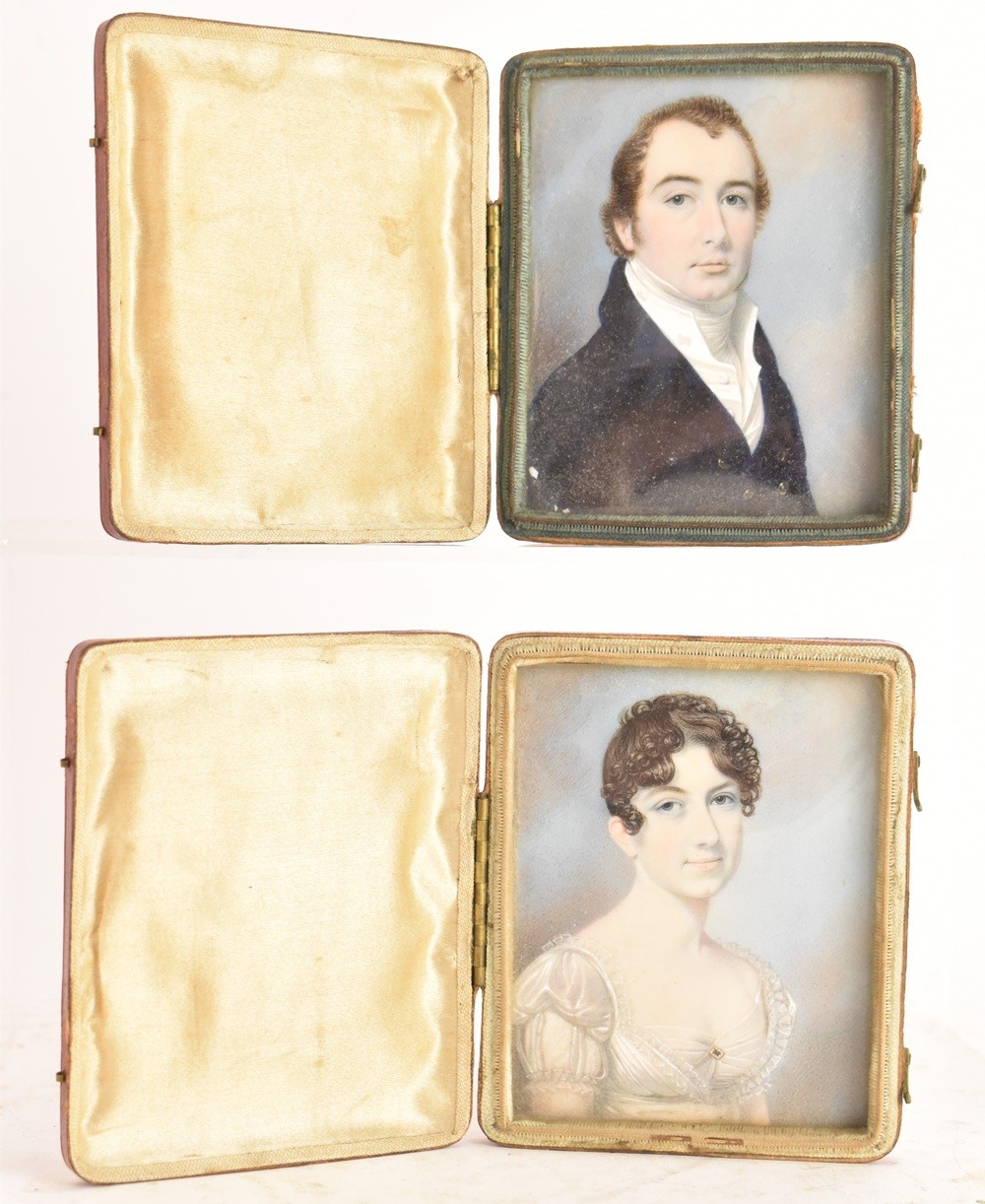 Two 19th century portrait miniatures, attributed to Thomas Richmond (1802–1874), each painted in watercolour on ivory, depicting Joseph and Sophia Freeman, each presented in a red leather case with cream silk interior, 8cm x 9.5cm