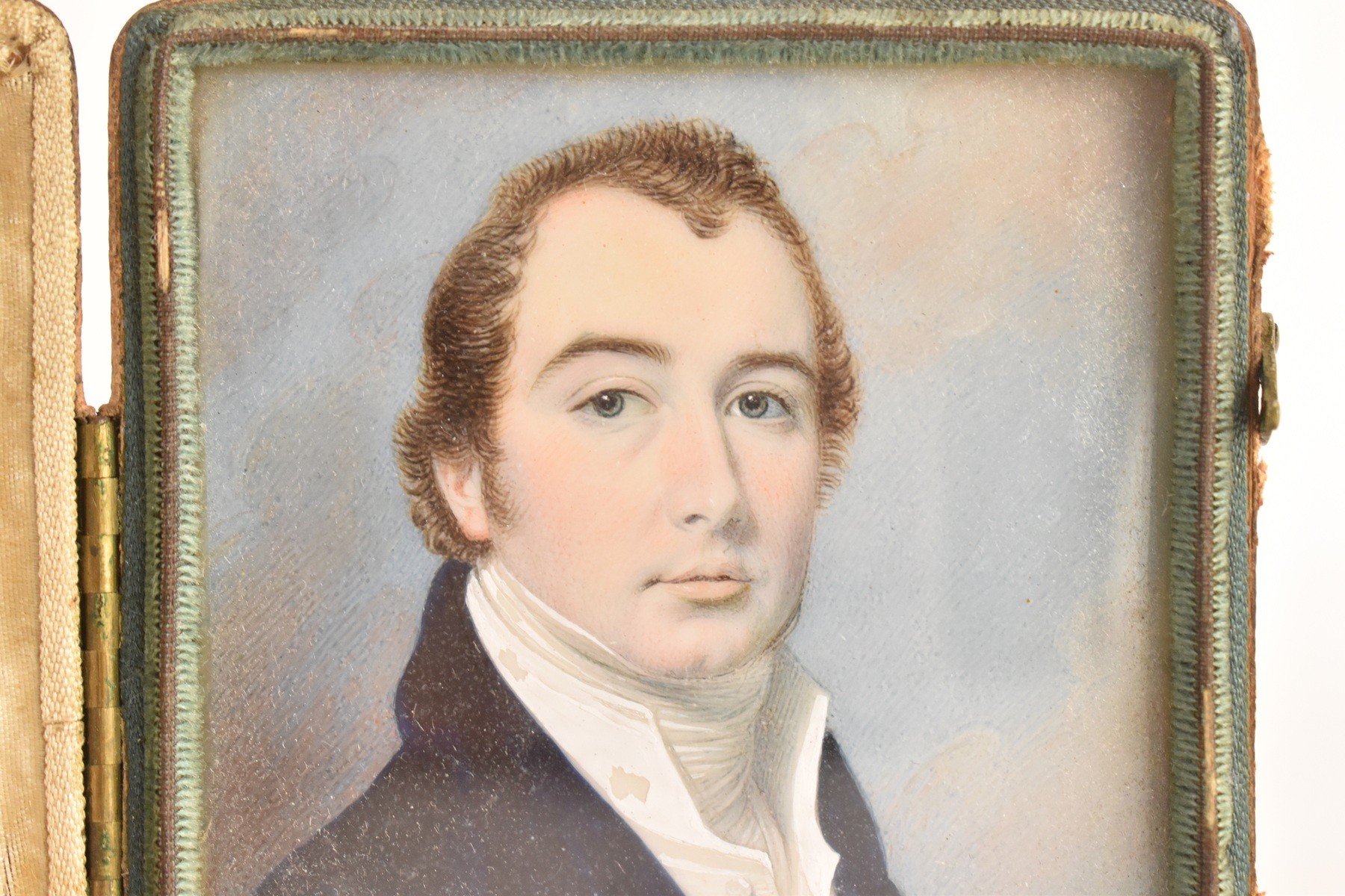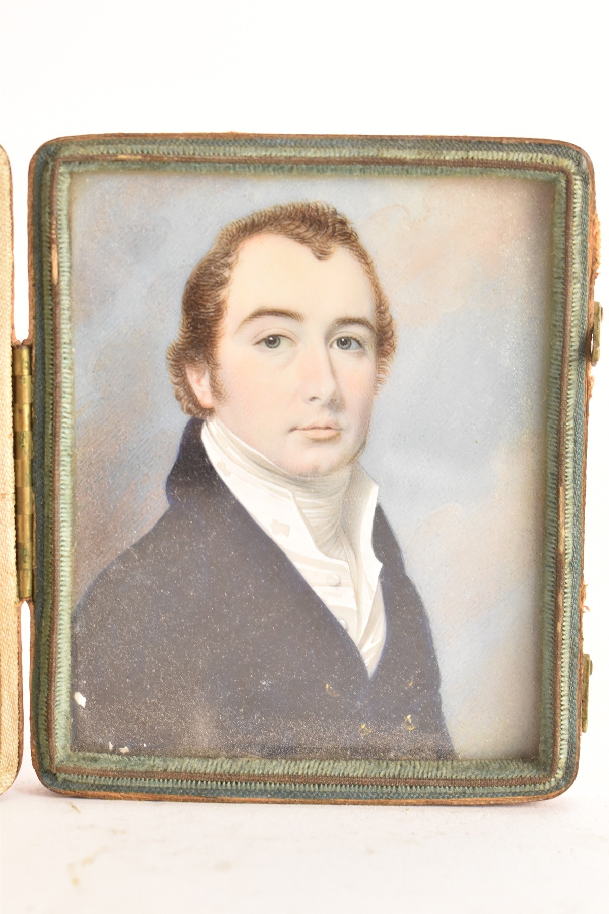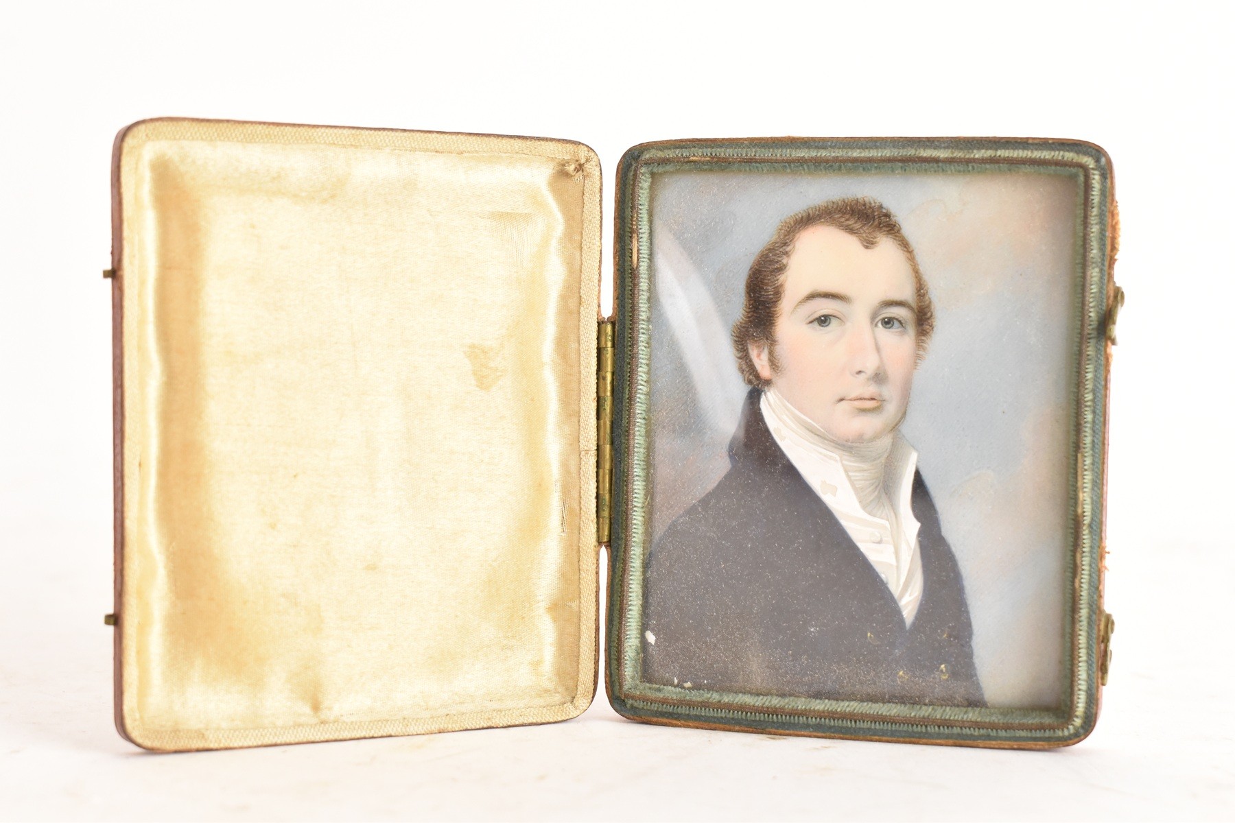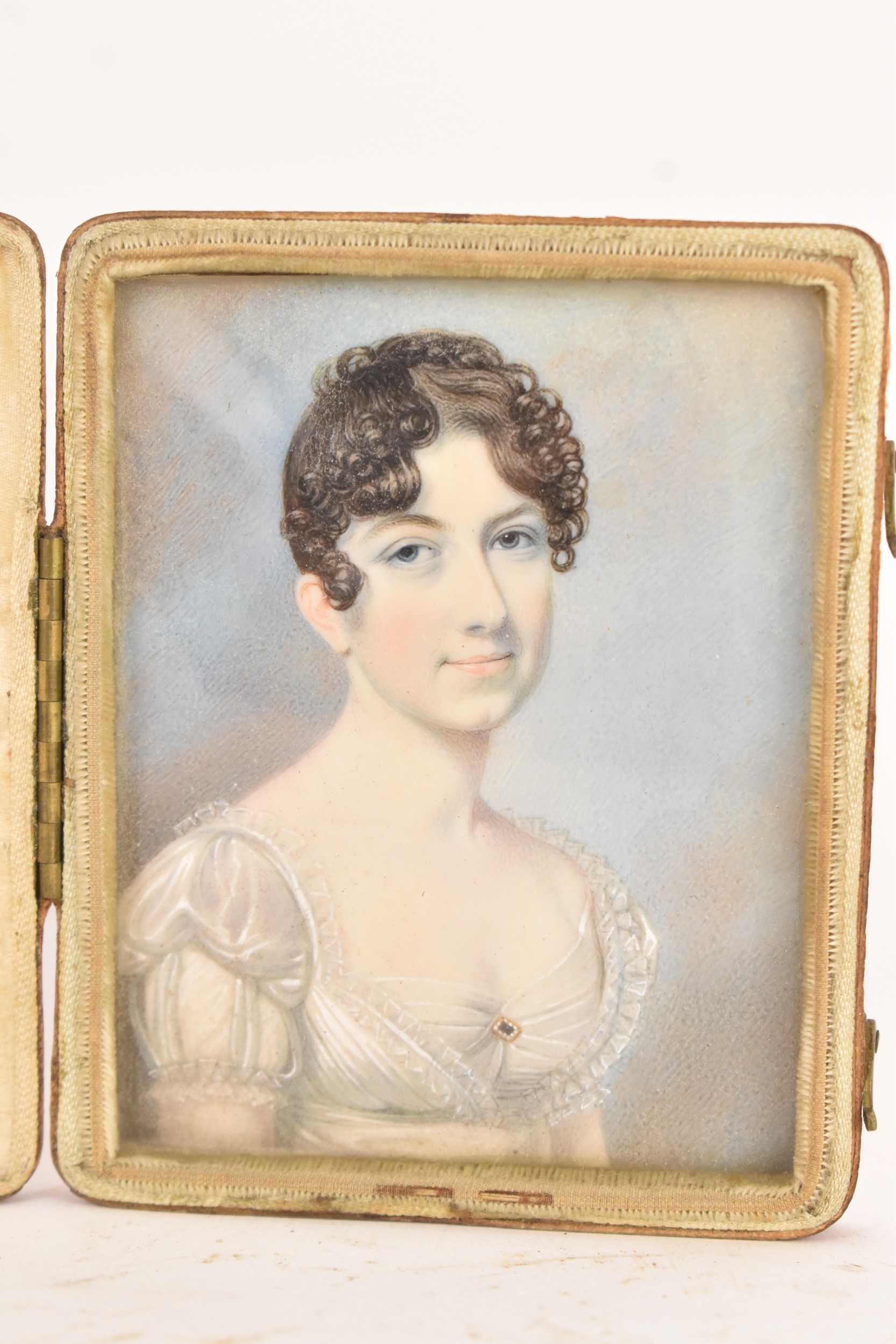 Two 19th century portrait miniatures, attributed to Thomas Richmond (1802–1874), each painted in watercolour on ivory, depicting Joseph and Sophia Freeman, each presented in a red leather case with cream silk interior, 8cm x 9.5cm