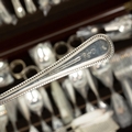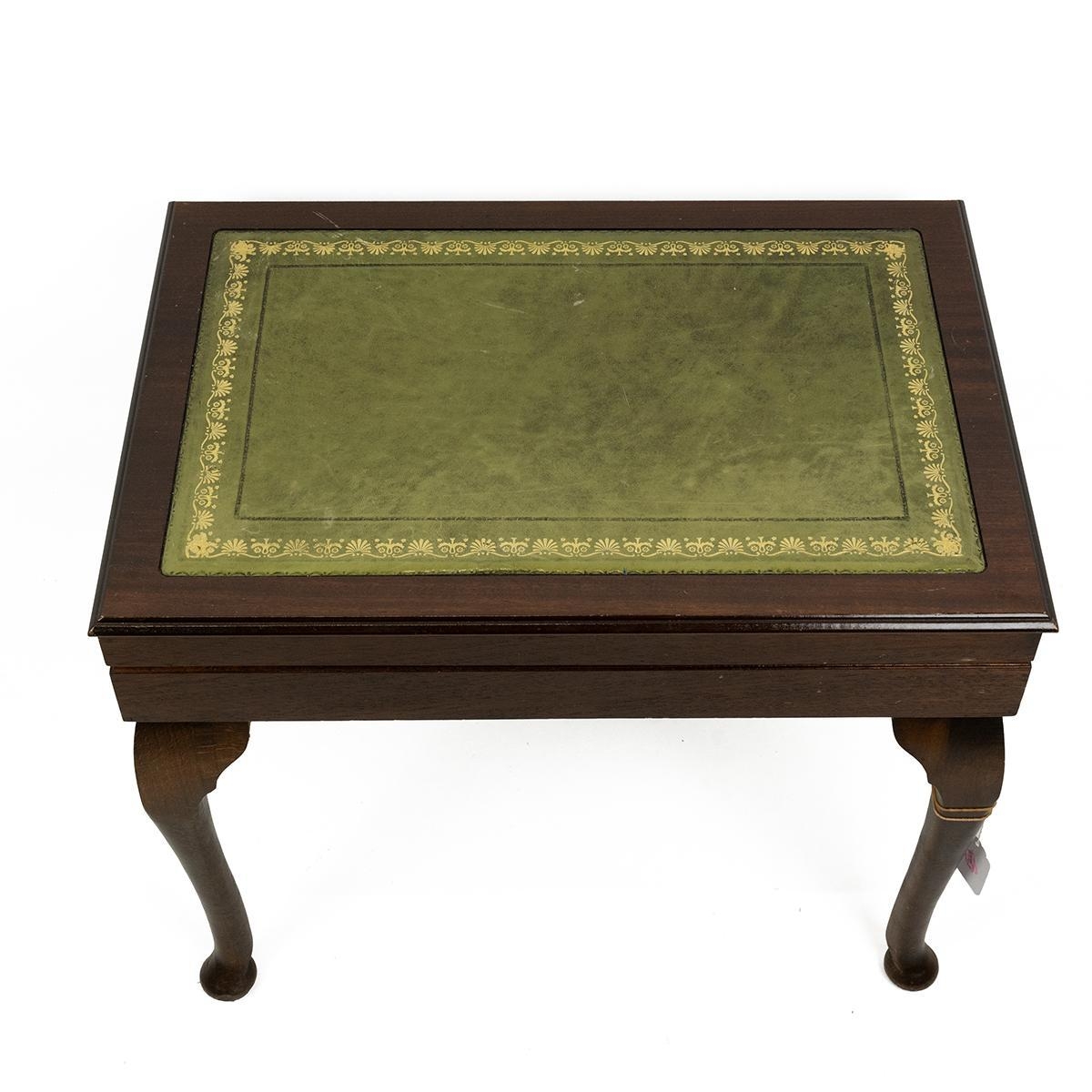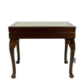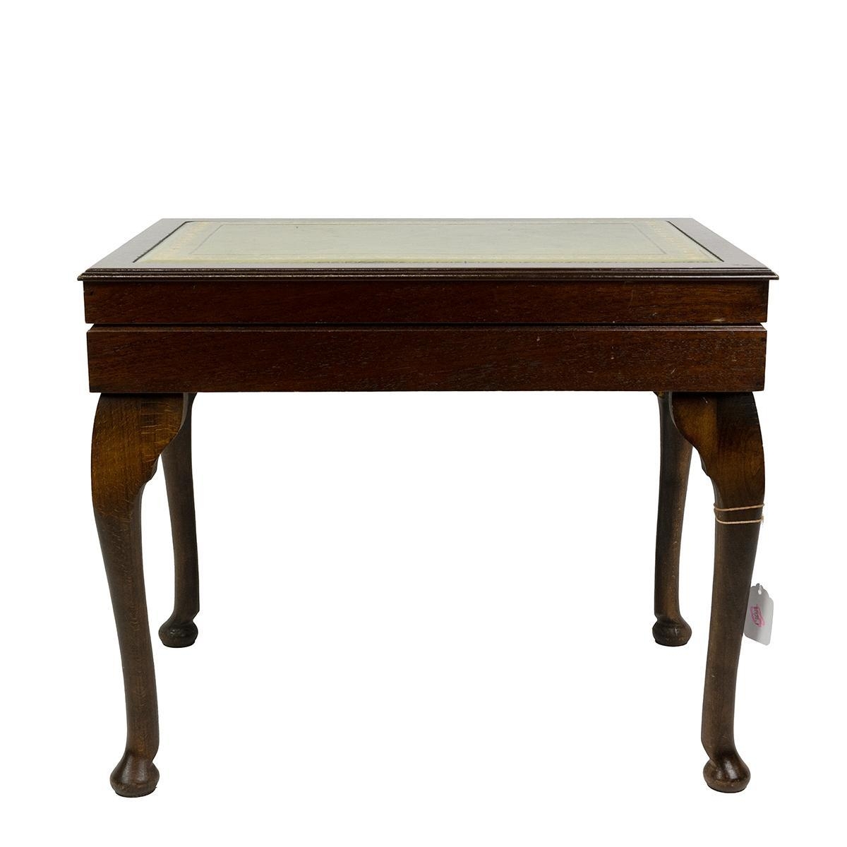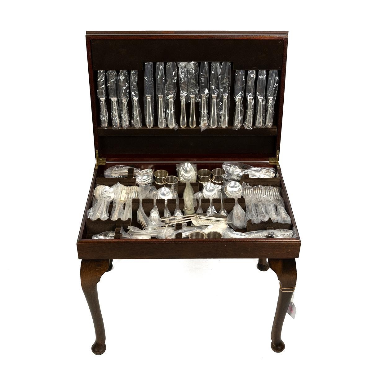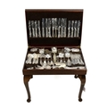 Osborne 8 setting canteen of cutlery (unused) in fitted mahogany tooled leather topped table, raised on cabriole supports, L60.5cm x D41.5cm x H49.5cm.