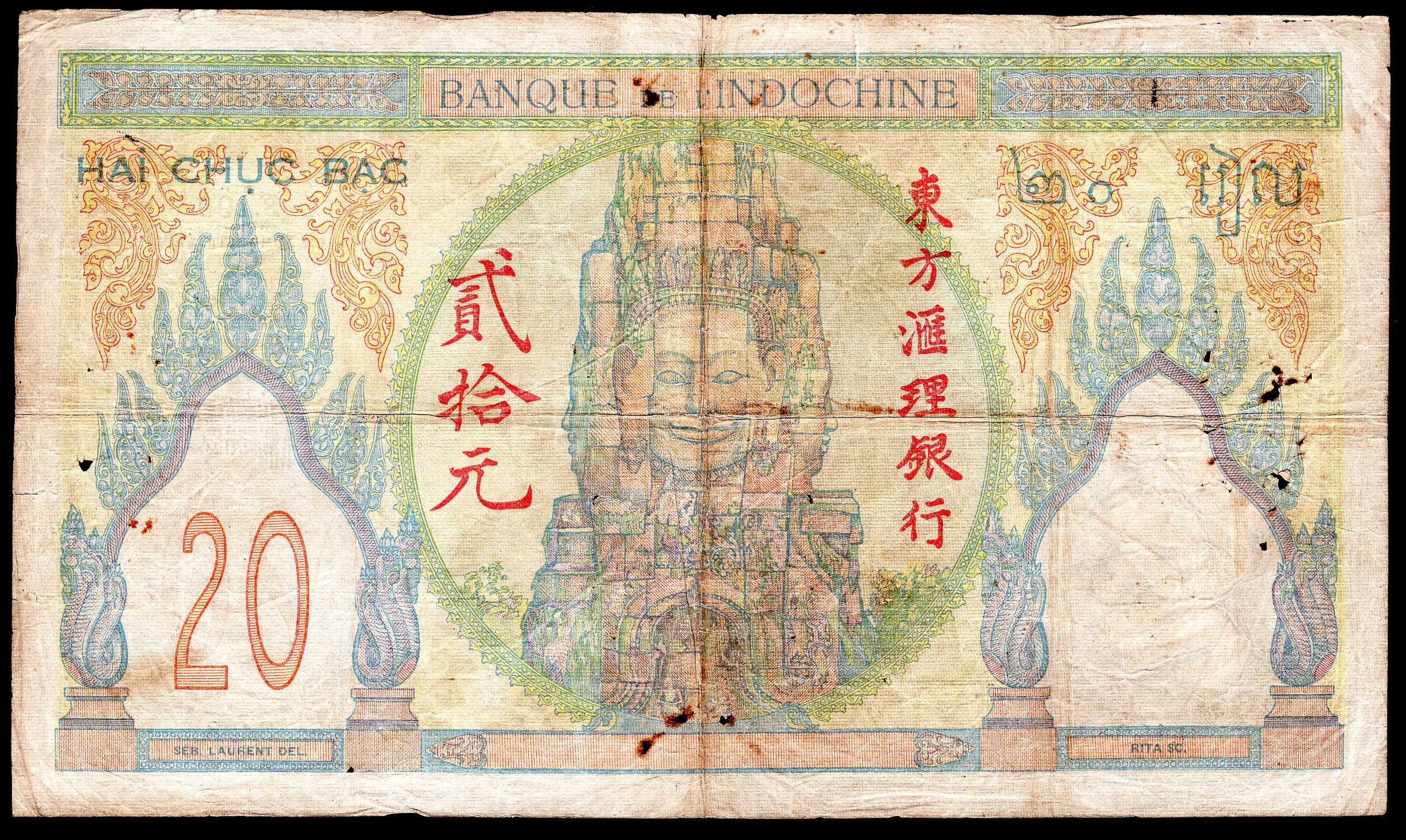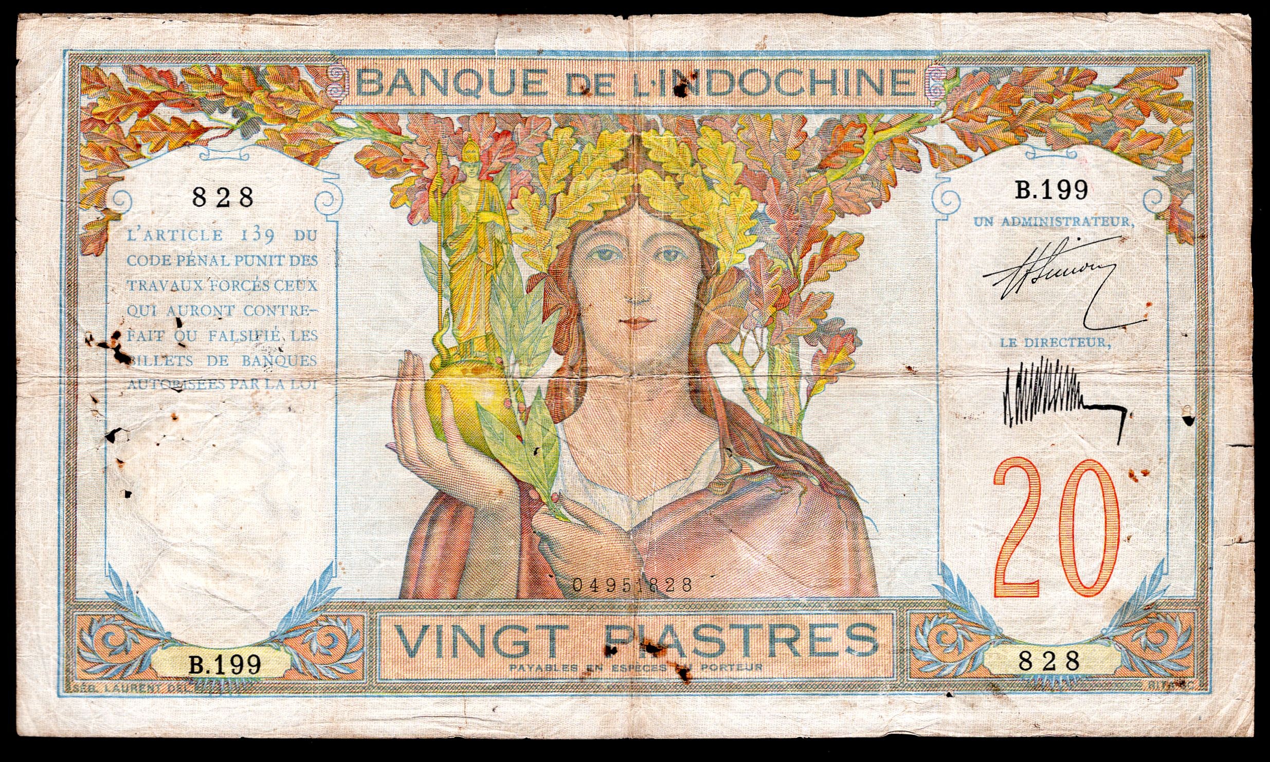 French Indochina, Banque de L'Indochine, 20 piastres, (1928-31), #B199 828 (Pick 50). Small rust holes, about fine.