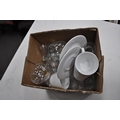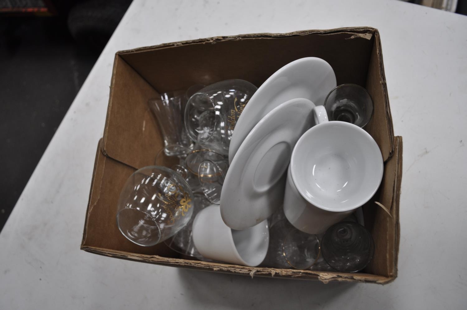 BOX OF MIXED GLASSWARE, LEVAZZA COFFEE CUPS AND SAUCERS