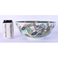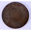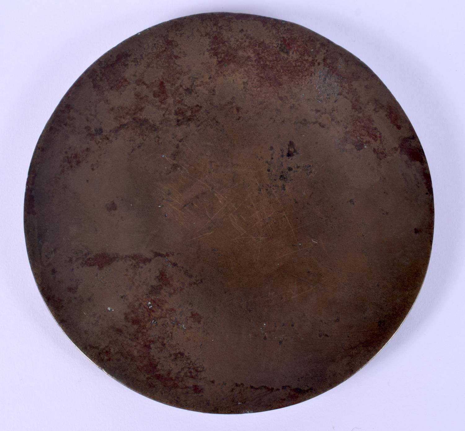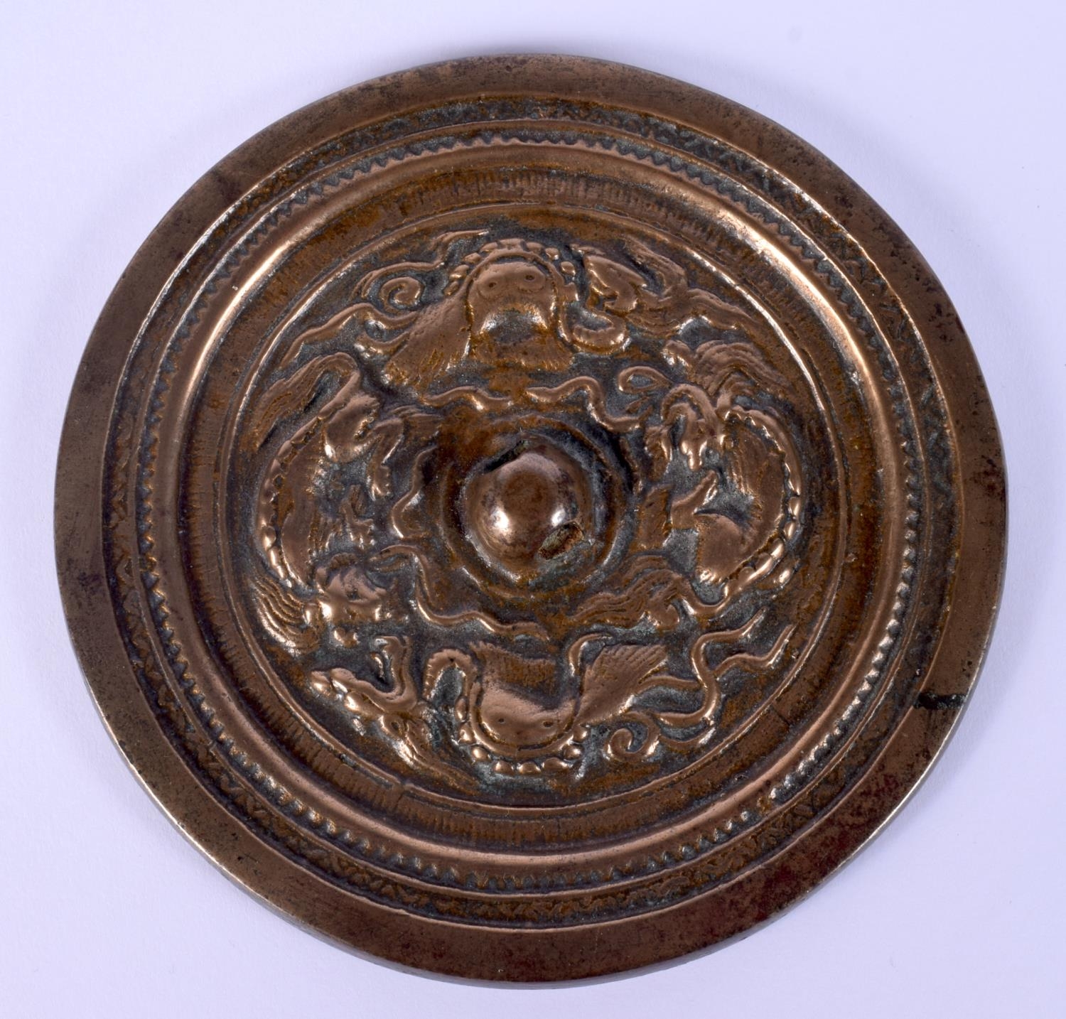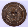 AN EARLY CHINESE BRONZE HAND MIRROR decorated with mythical beasts in various pursuits. 12 cm diameter.