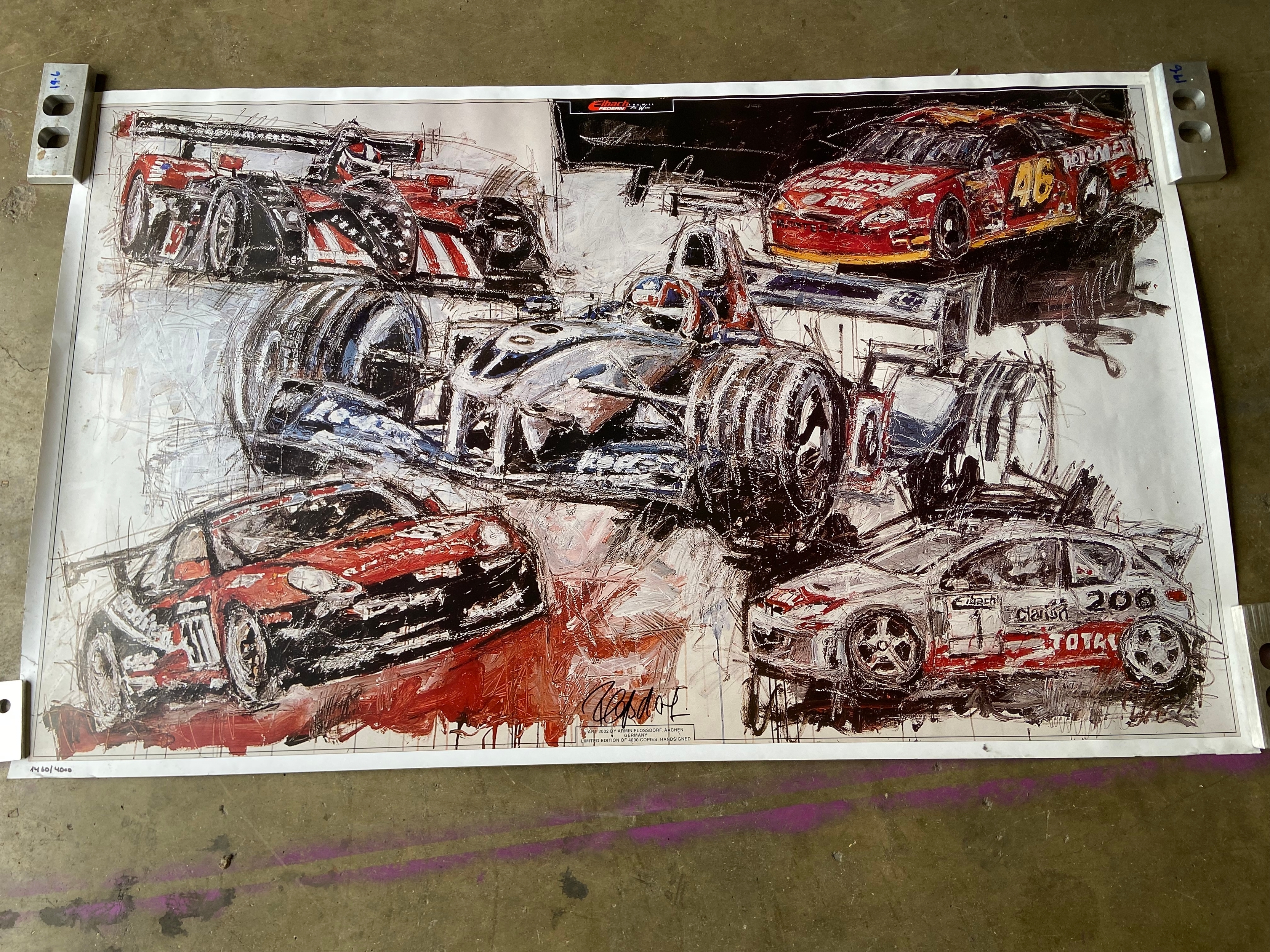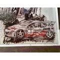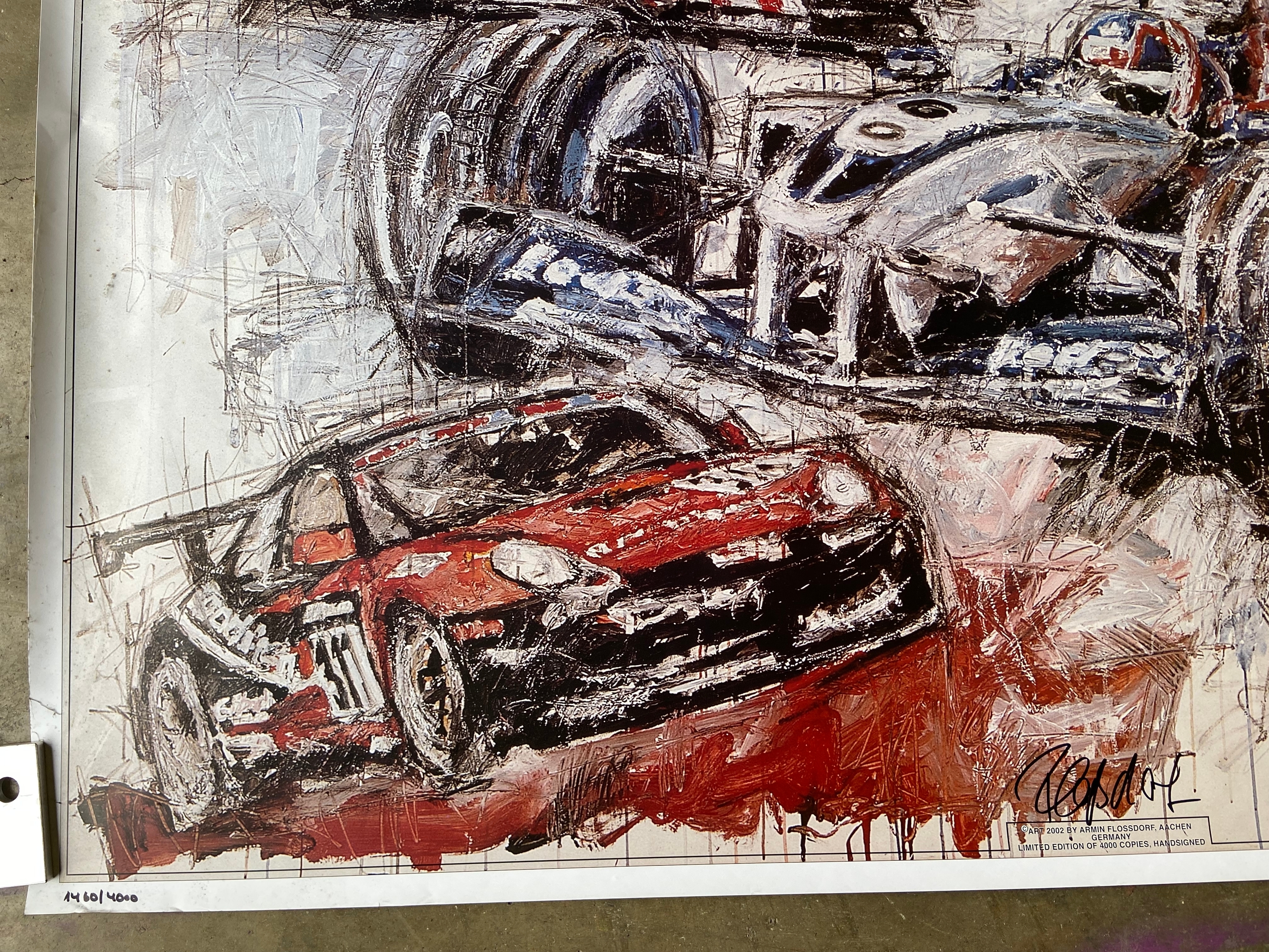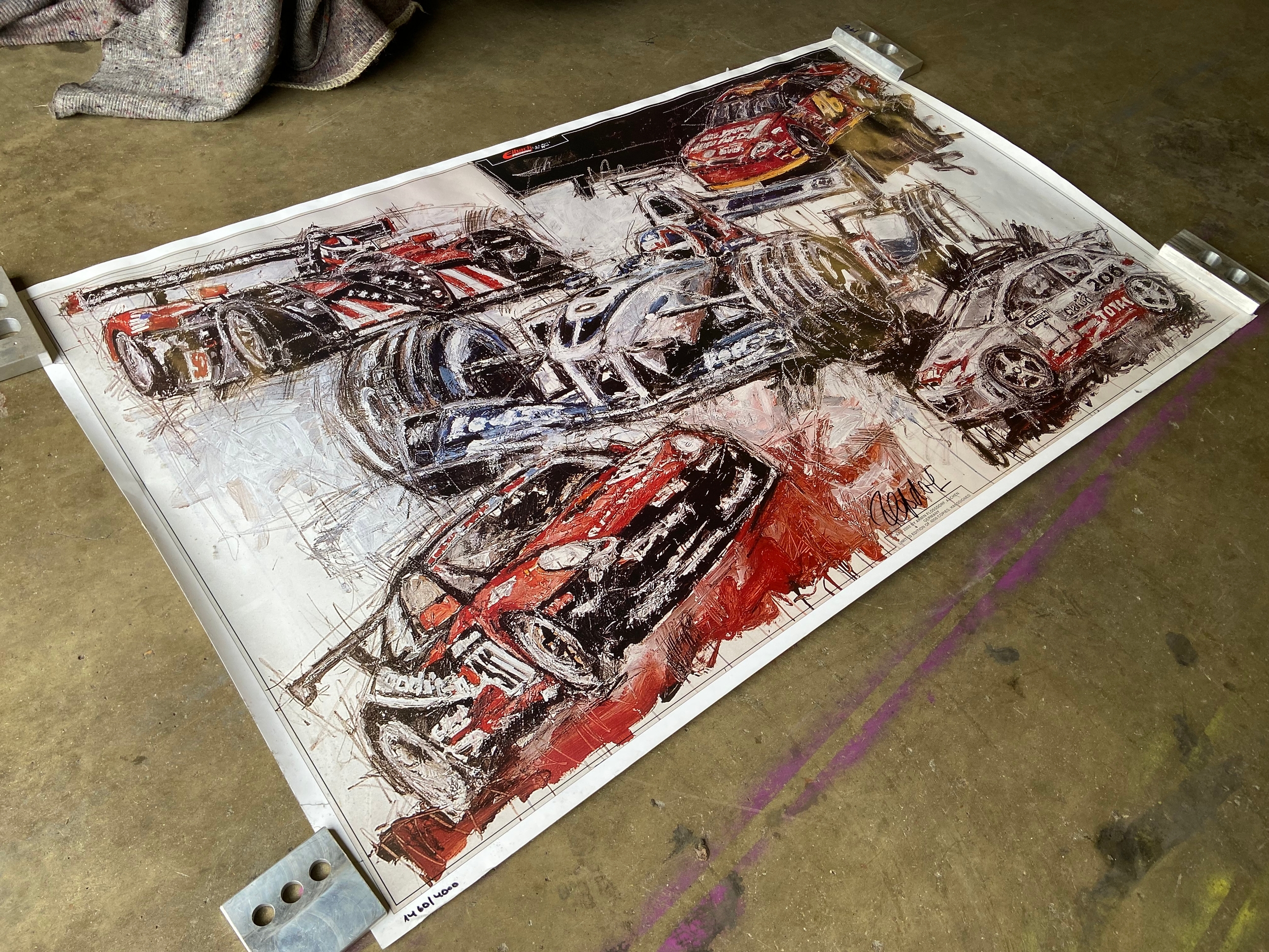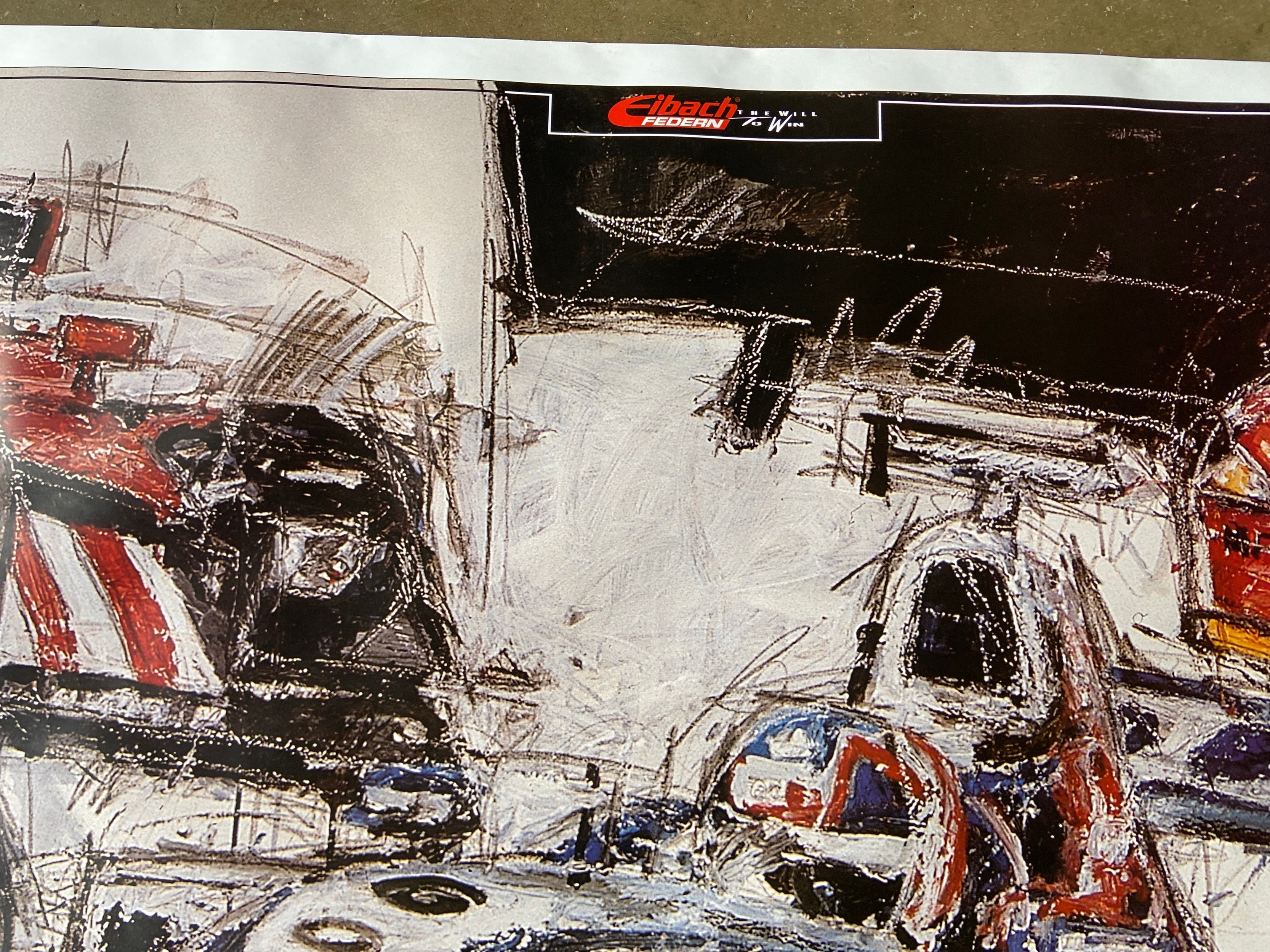 A limited edition art print of race cars by Armin Flossdorf. Produced for Eibach Federn, it depicts an impressionistic collection of racing teams that run the brand across various disciplines.