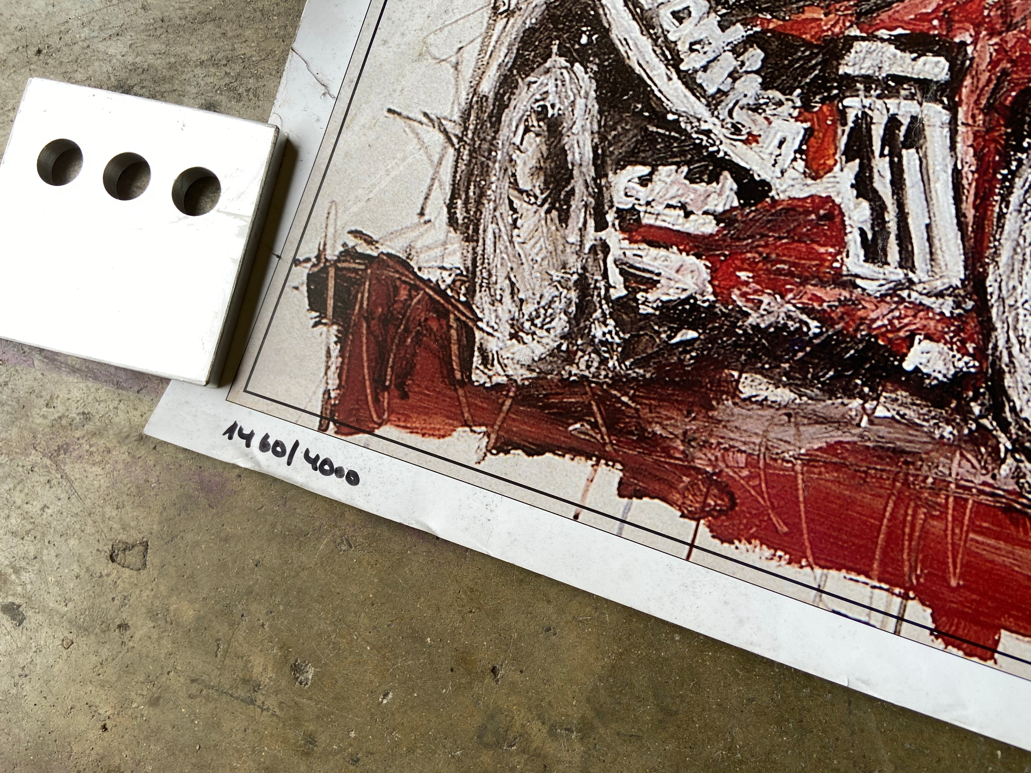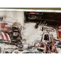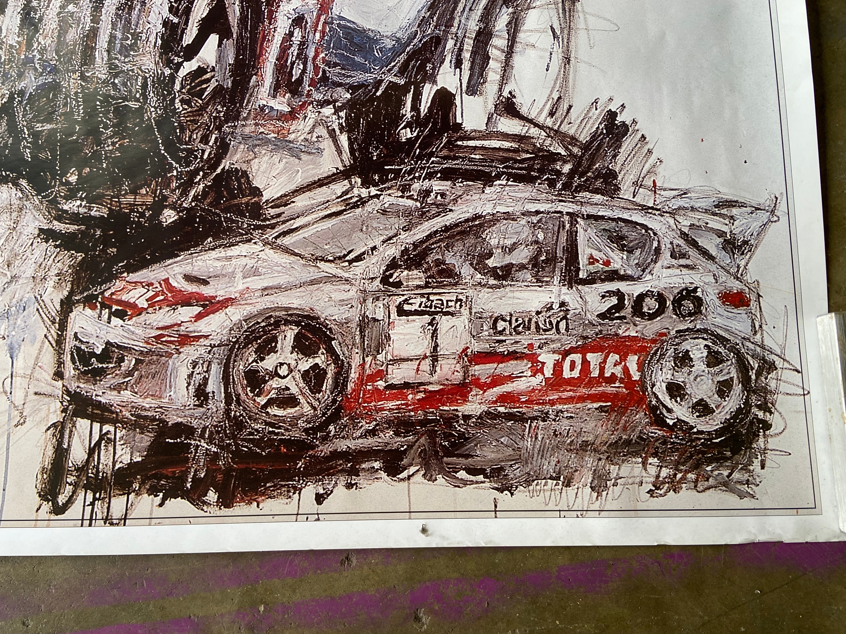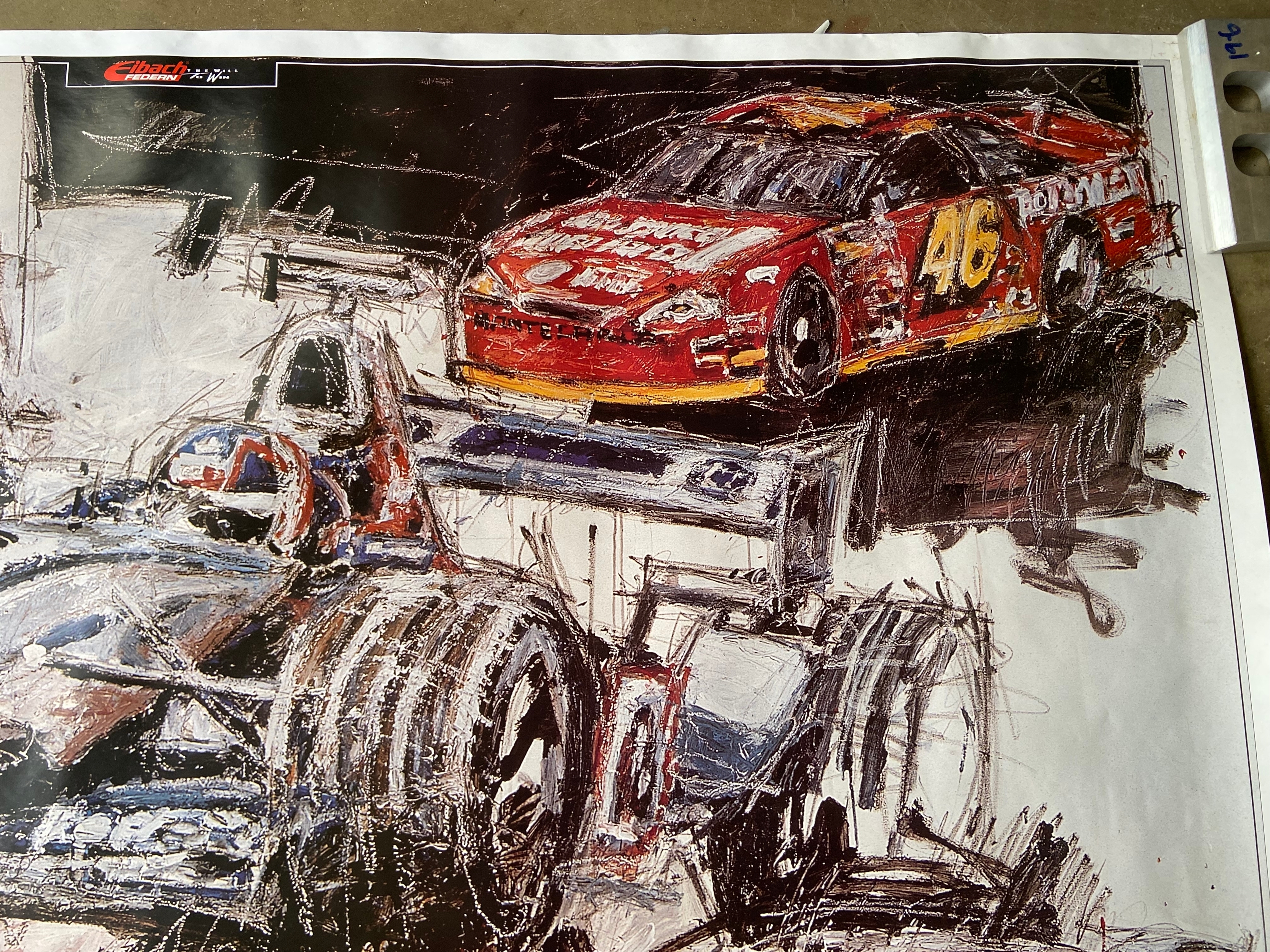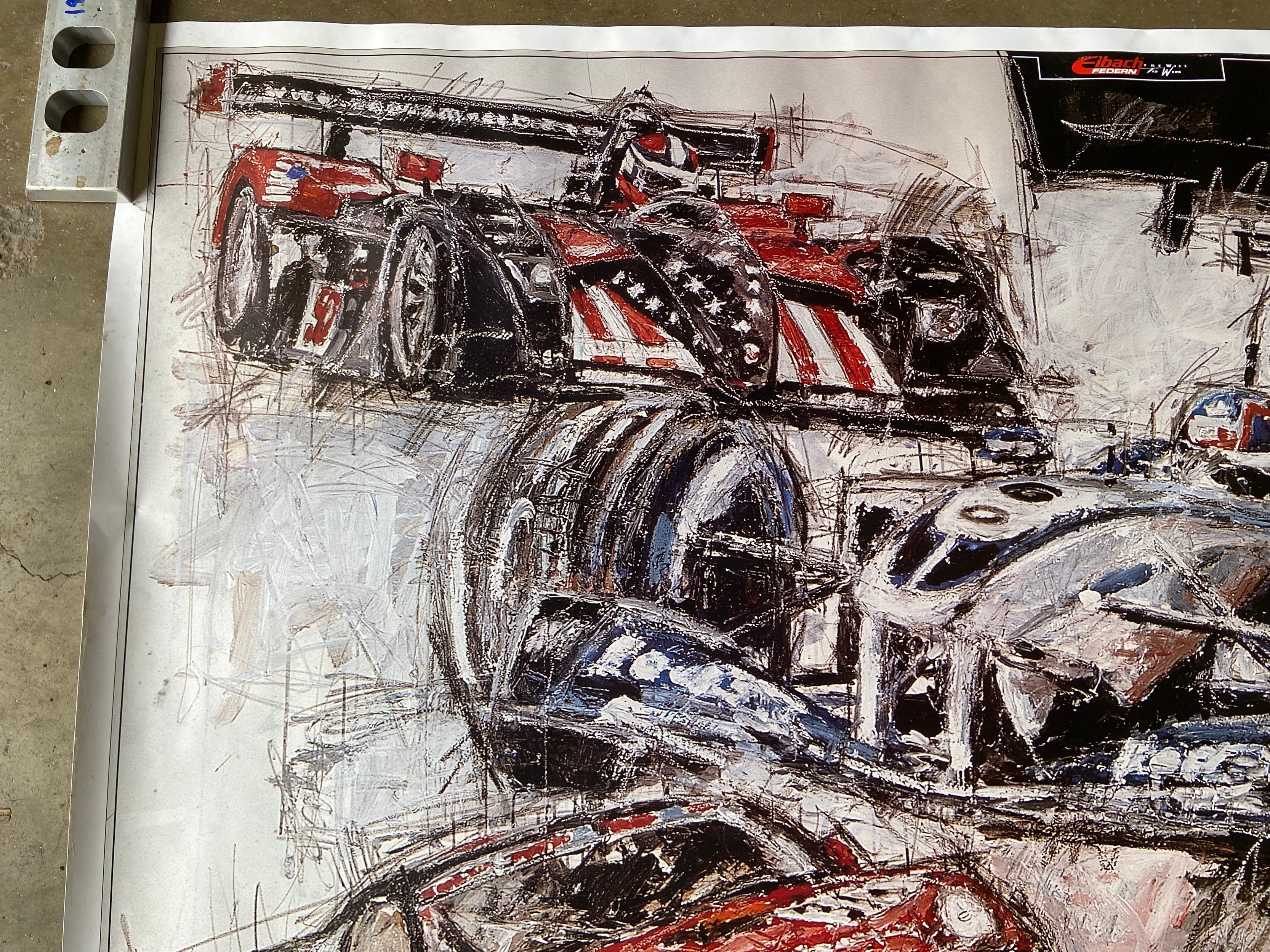 A limited edition art print of race cars by Armin Flossdorf. Produced for Eibach Federn, it depicts an impressionistic collection of racing teams that run the brand across various disciplines.