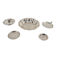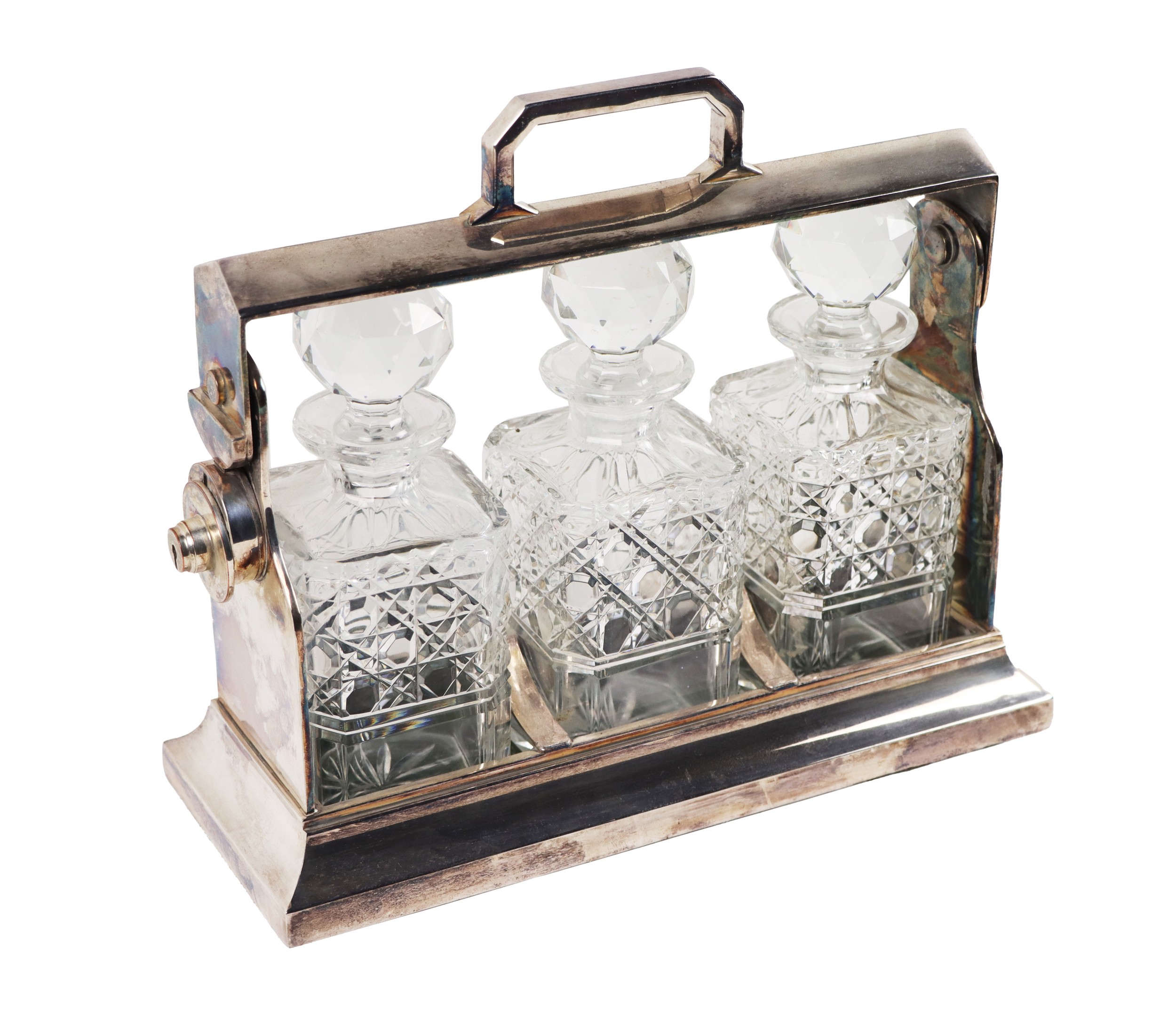 A fine quality silver plated Tantalus, with three cutglass decanters and stoppers, with carrying handle, on shaped rectangular base. (1)