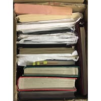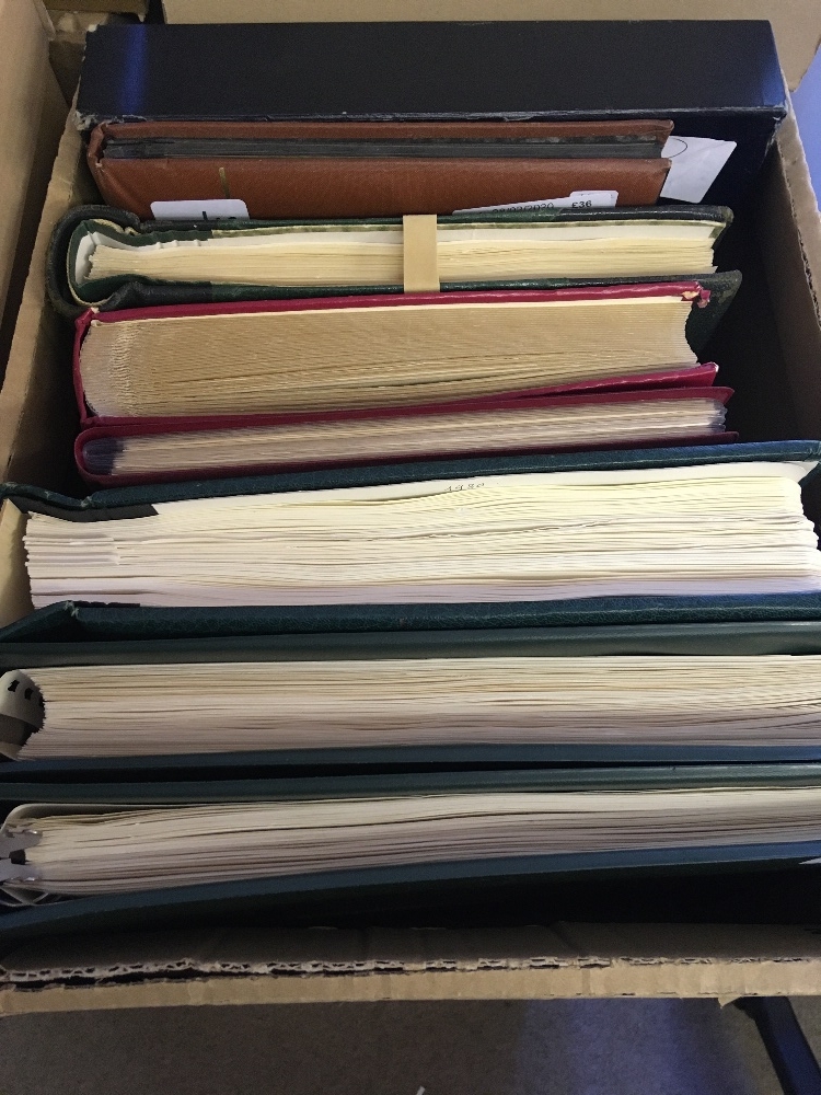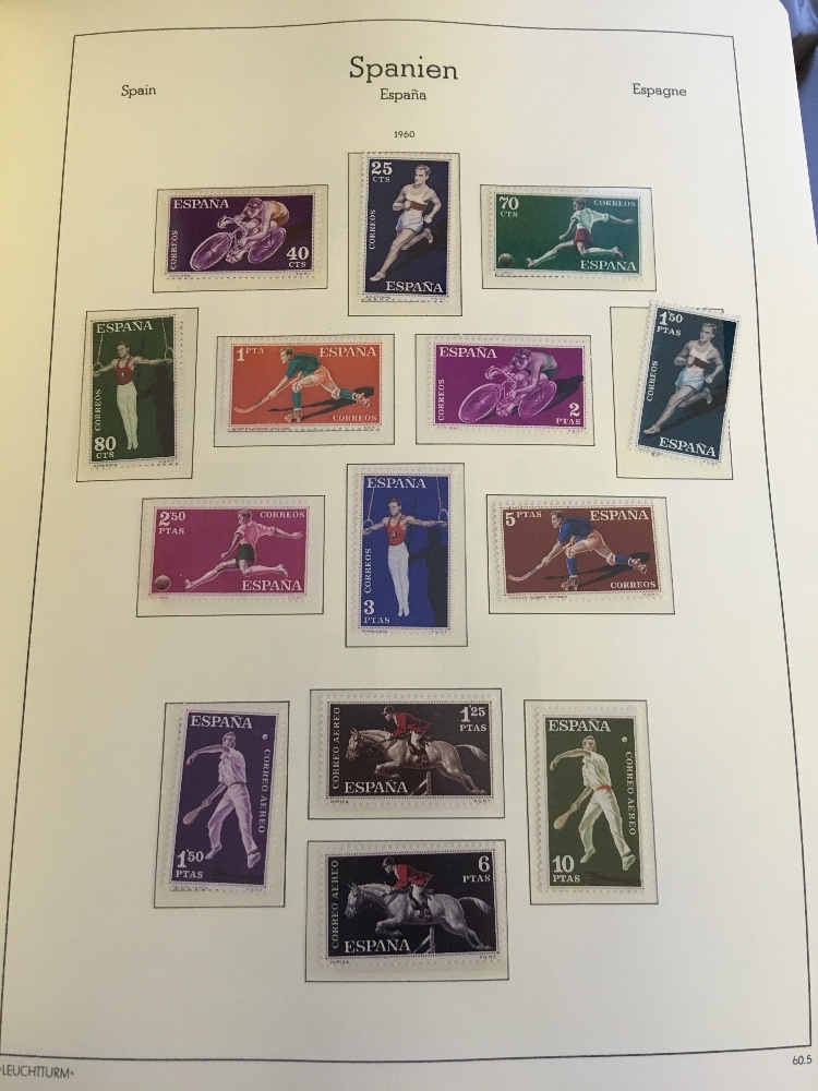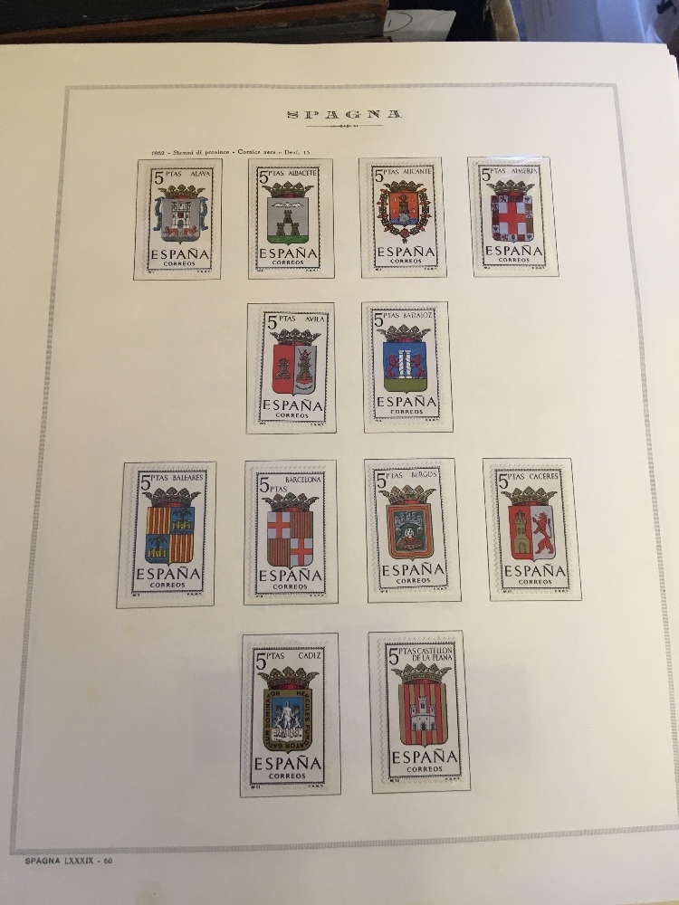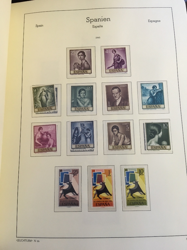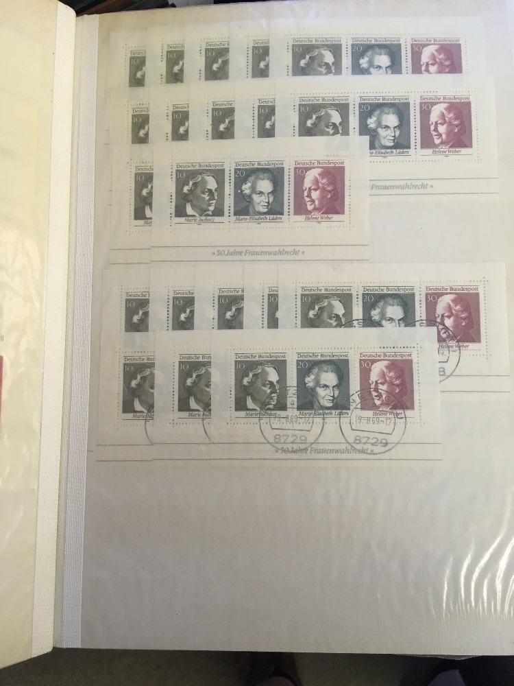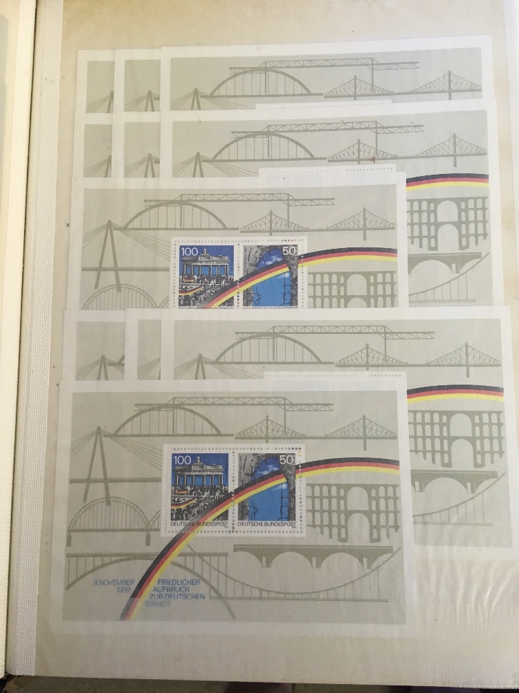 STAMPS WORLD, box with eight albums or stockbooks, with collection of mostly mint Spain in three printed albums, a UPU presentation album for issues from 2006-07, a duplicated stock of German miniature sheets U/M, a useful mint & used French collection etc. (1000s)
