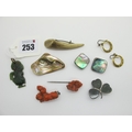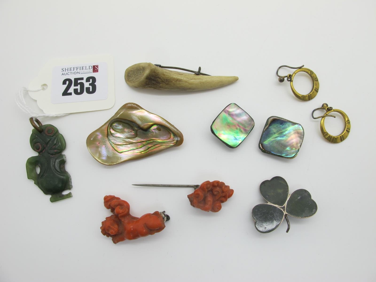 A Maori Green Hardstone Hei-Tiki Pendant, (damaged / loss); together with a carved coral bar brooch (damaged incomplete); an Irish shamrock brooch, pair of earrings, etc.