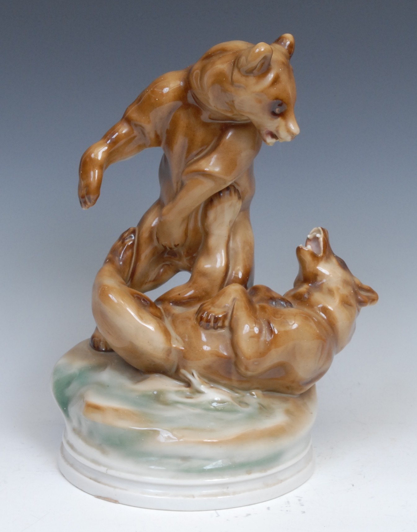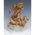 A large Zsolnay Pecs figure group, of a pair of bears in combat, circular base, 30cm high, blue printed mark