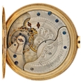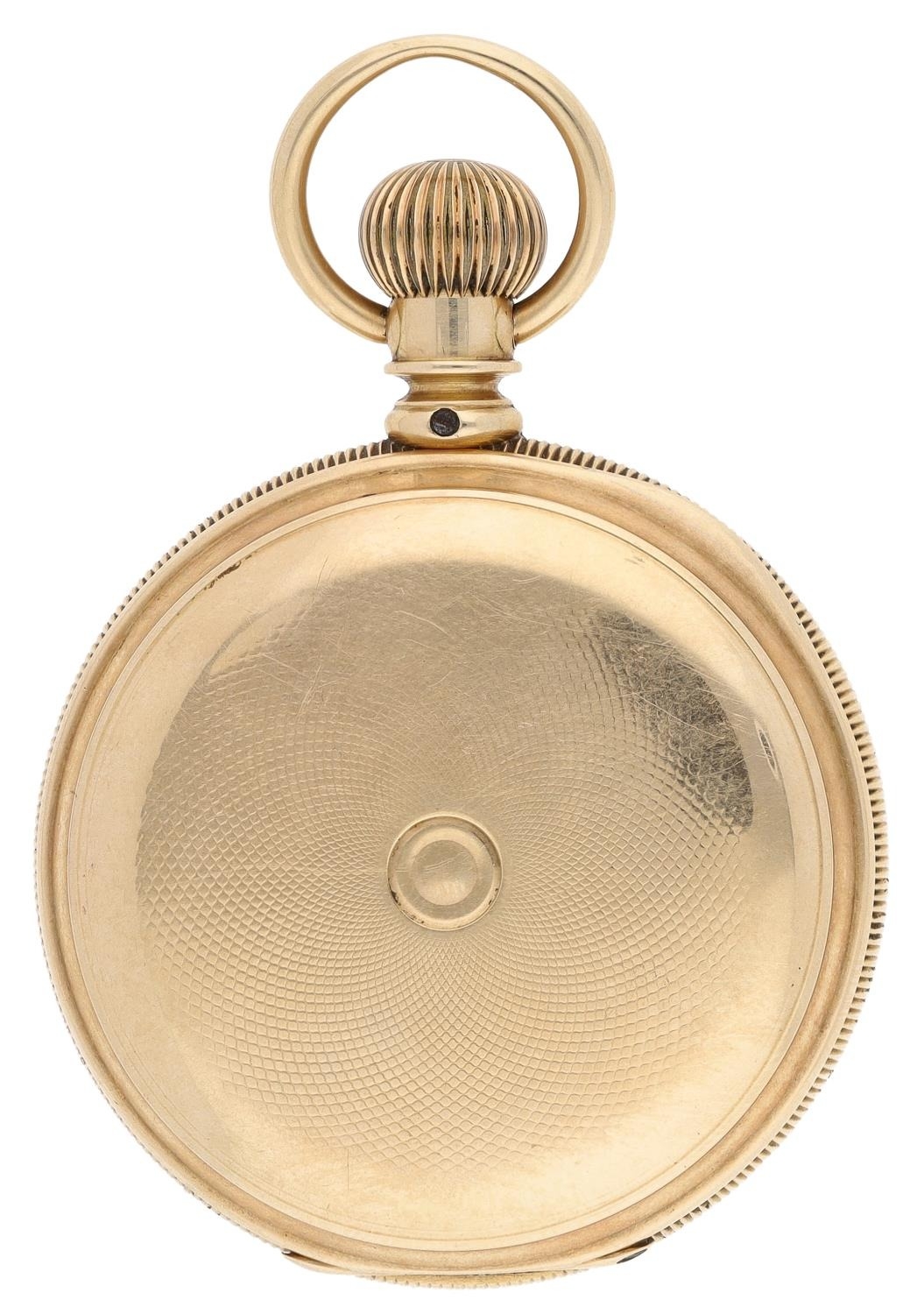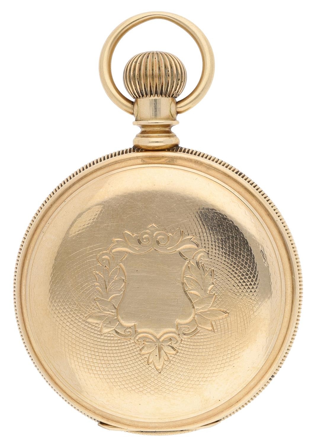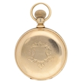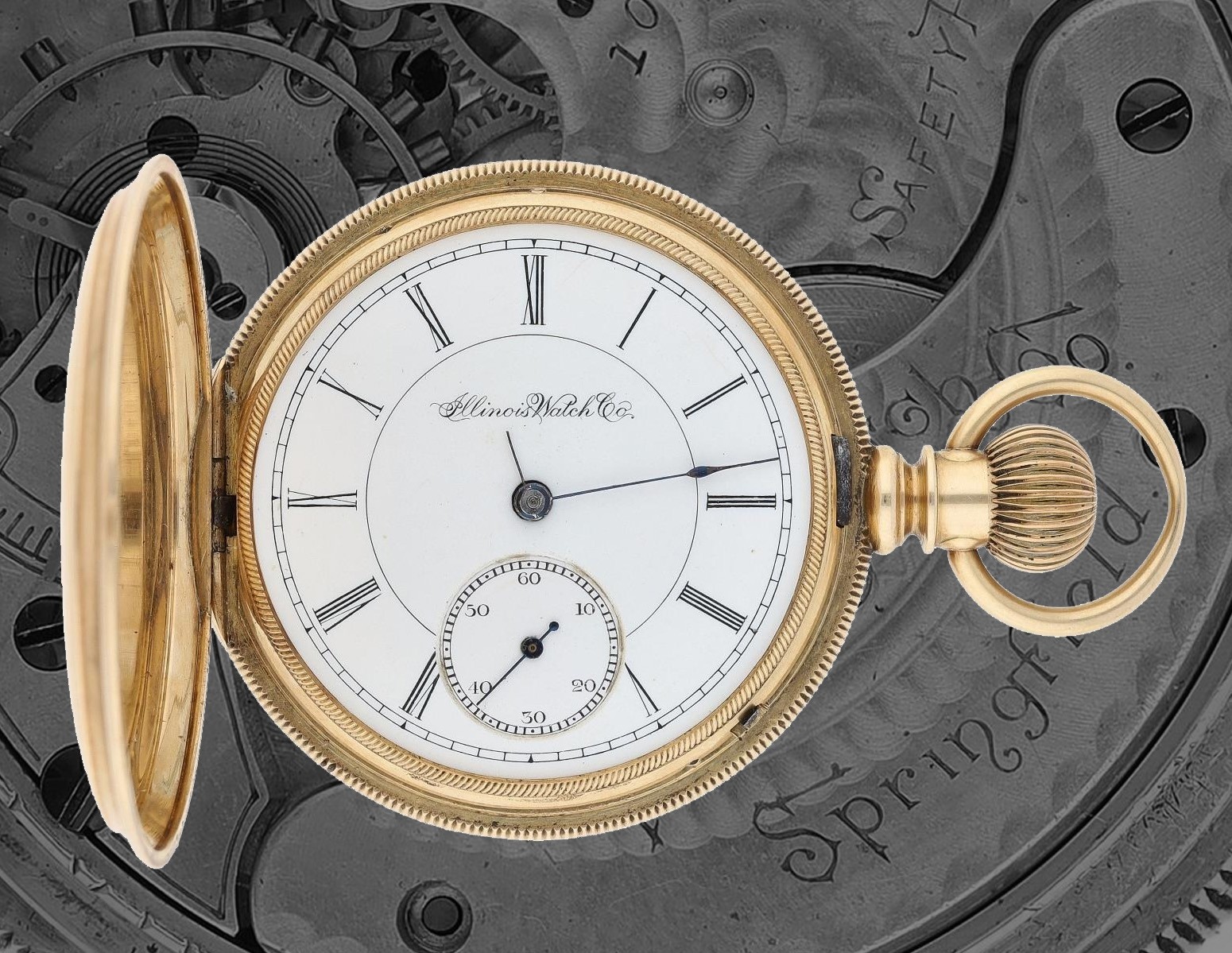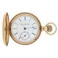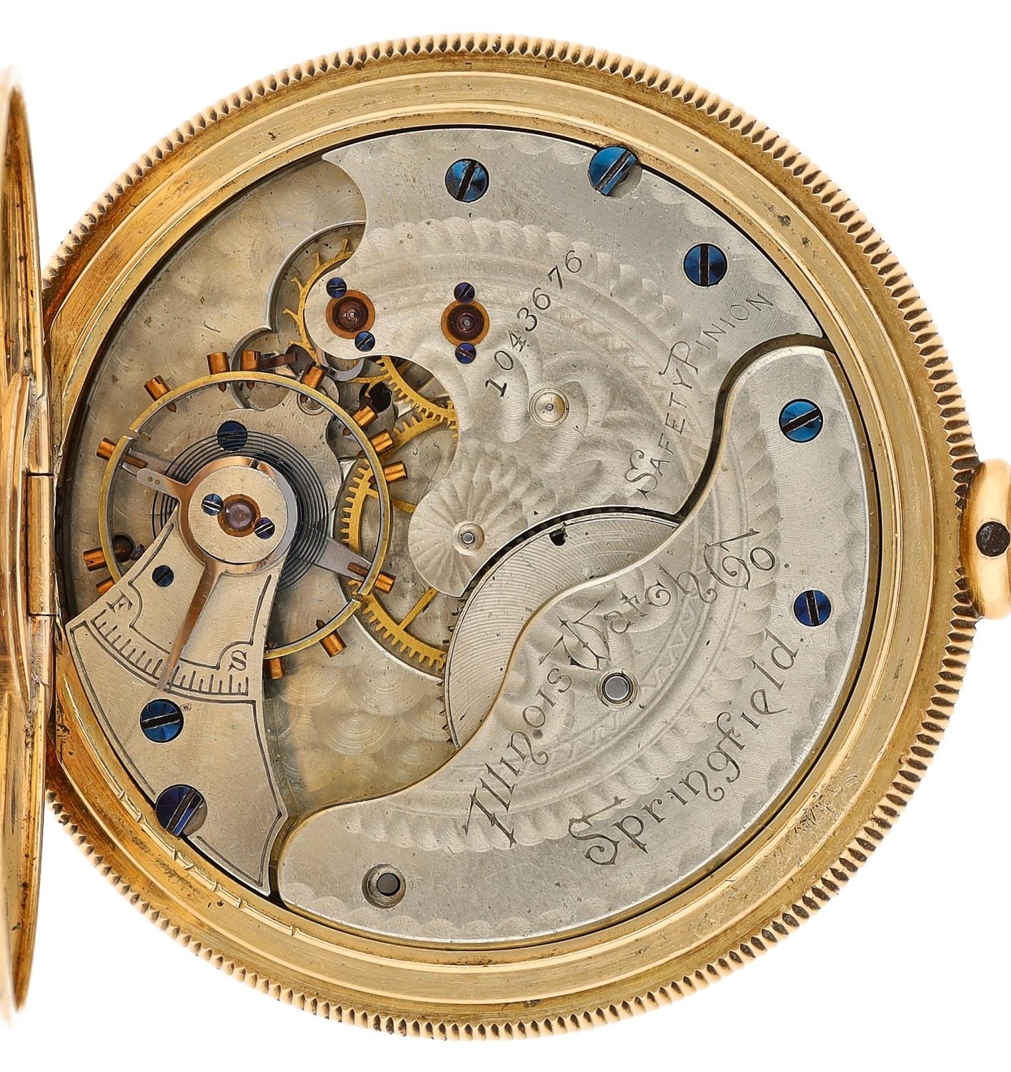 Illinois Watch Co. 14ct lever set hunter pocket watch, serial no. 1043676, circa 1891, signed movement with safety pinion, compensated balance and regulator, 14ct hinged cuvette, signed dial with Roman numerals, minute track and subsidiary seconds, blued steel hands, within an engine turned case with engraved cartouche, 120.1gm, 51mm (movement at fault)