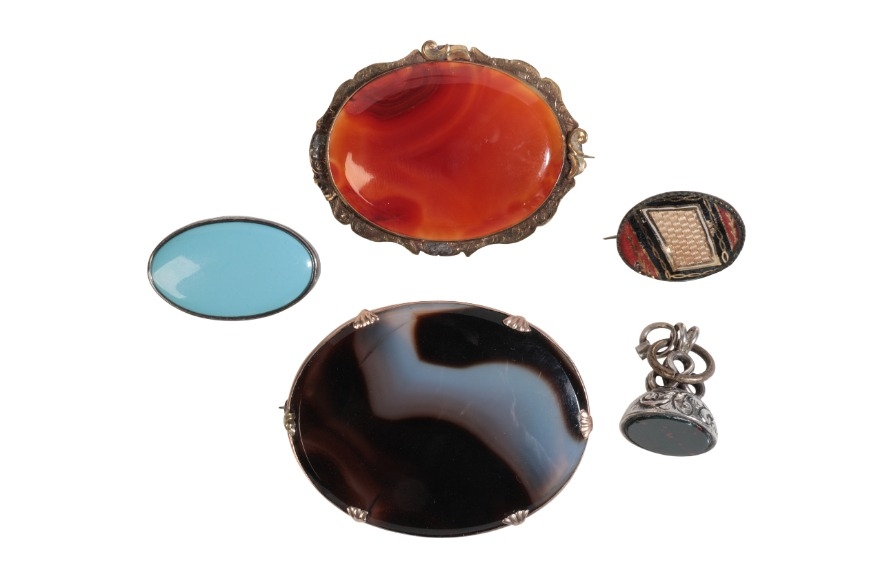 including a banded agate brooch in a setting of 9ct gold, 5.5cm; together with an oval carnelian brooch, held in a scrolled border of gilt metal, safety chain of 14ct gold, 5.0cm; a mourning brooch in base metal with red and black enamel and hairwork design under glass, 2.3cm; a blue glass brooch in a border of silver, stamped 'METAL' to the reverse, 3.1cm; and a silver fob pendant in sterling silver, set with bloodstone, no assay marks, 1.7cm diameter, (gross weight - c.57.3g) (5)