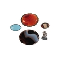 including a banded agate brooch in a setting of 9ct gold, no assay marks, 5.5cm; together with an oval carnelian brooch, held in a scrolled border of gilt metal, secured with a pin clasp and safety chain of 14ct gold, 5.0cm; a mourning brooch in base metal with red and black enamel and hairwork design under glass no assay marks, 2.3cm; a blue glass brooch in a border of silver, stamped 'SILVER' to the edge of the setting and 'METAL' to the reverse, 3.1cm; and a silver fob pendant in silver, set with bloodstone, no assay marks, 1.7cm diameter