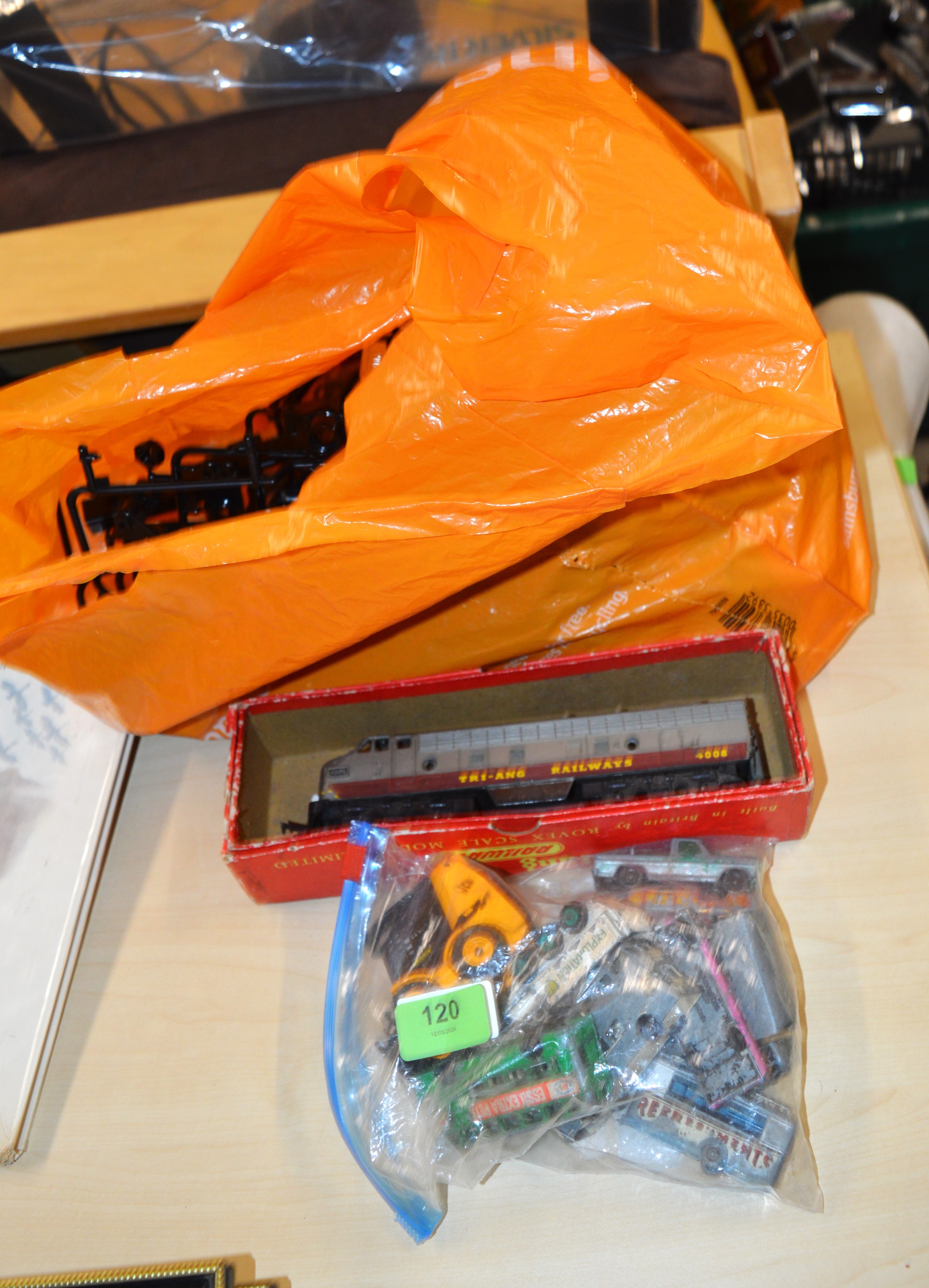 Bag of Accessories for a Japanese "Tamiya" Kit, Plus Bag of Play-worn Die-cast Matchbox Toys, Plus One Boxed Tri-ang Continental Railways Diesel Trailer Car (Badly Distressed)