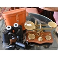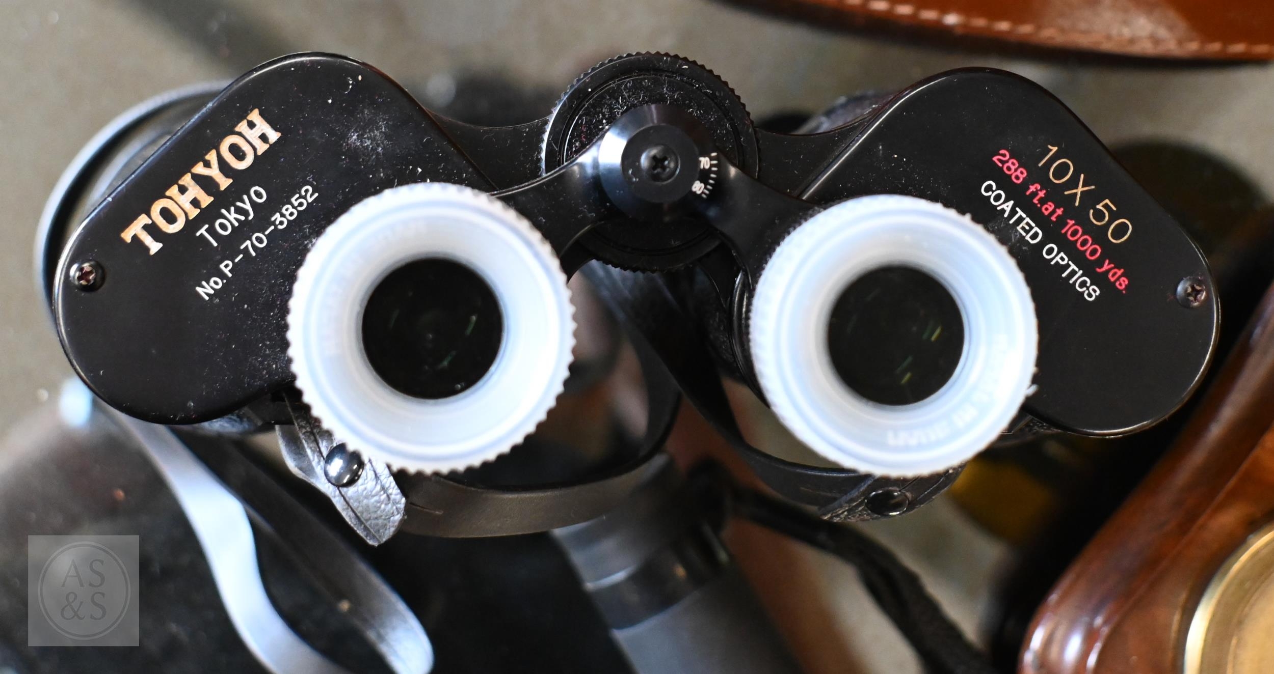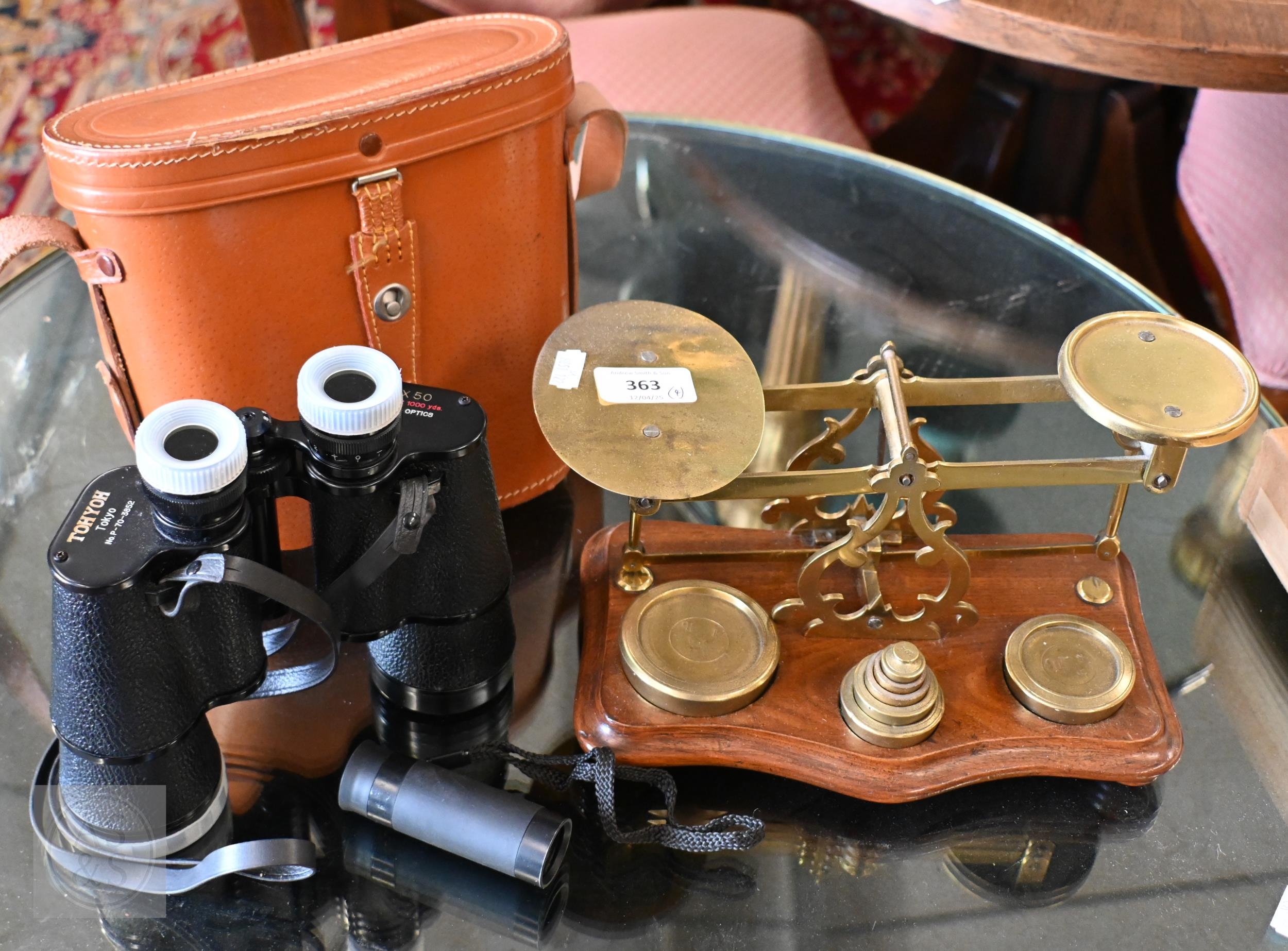 A pair of Japanese Tohyoh 10 x 50 binoculars in pigskin case to/w a set of brass postage scales with weights, a 5 x 20 mm Golfscope and a boxed Abbey Corinthian bagatelle (4)