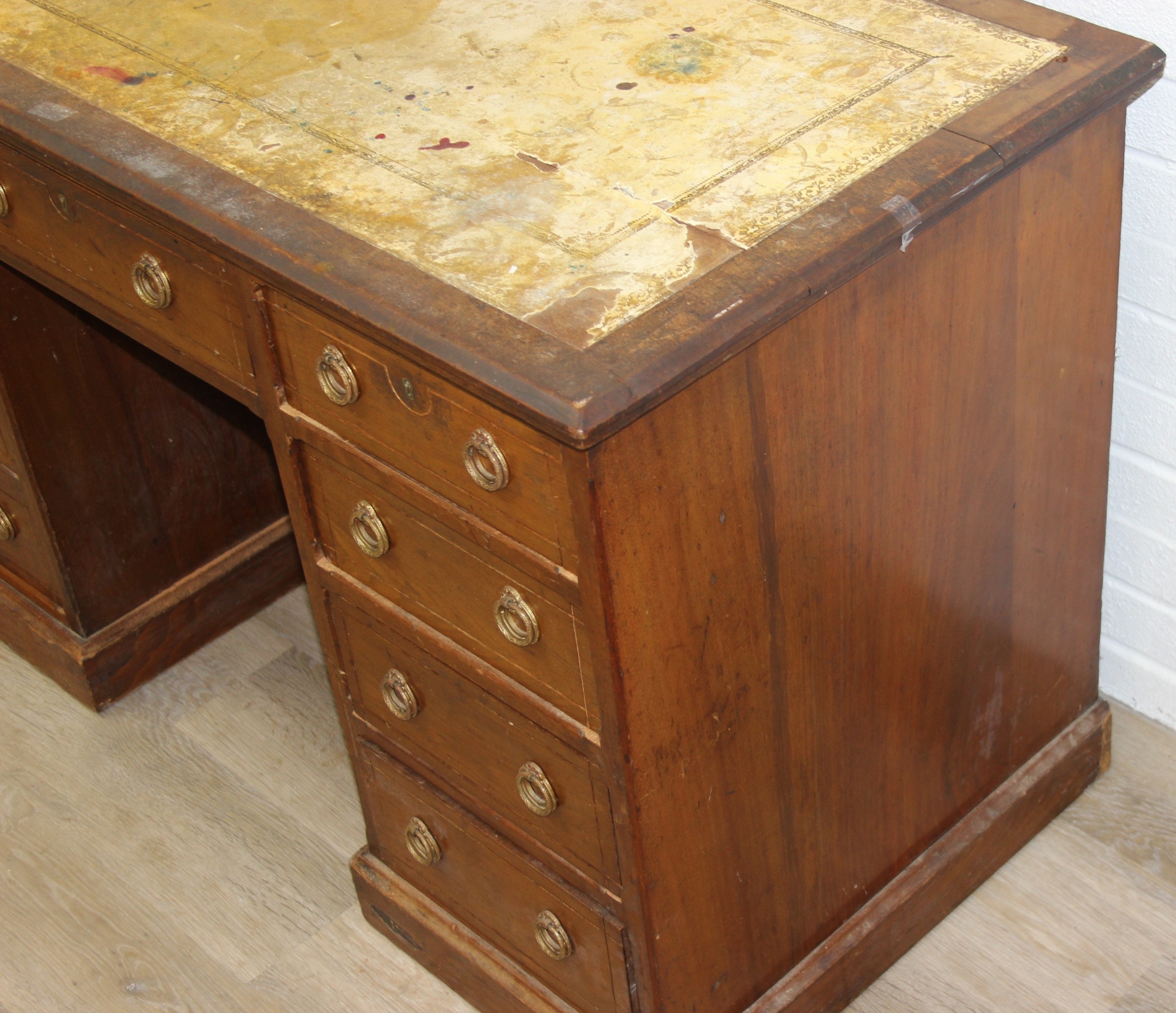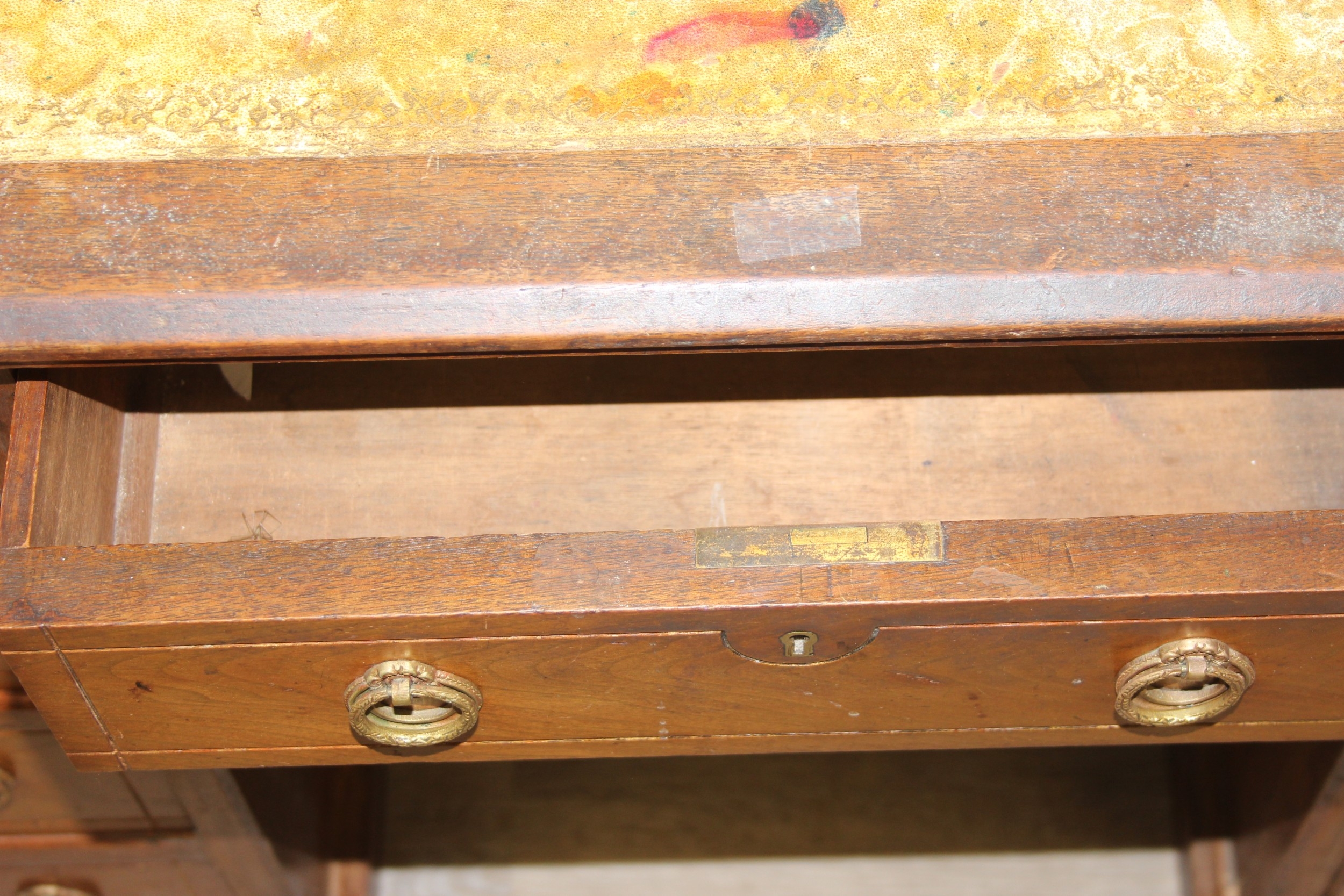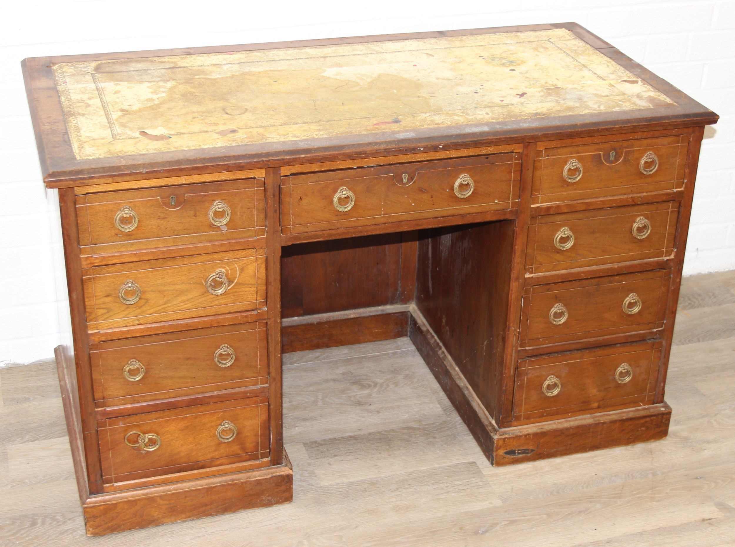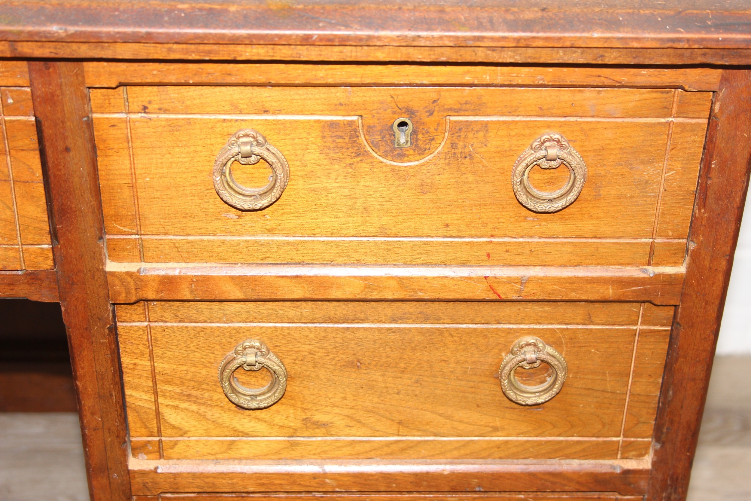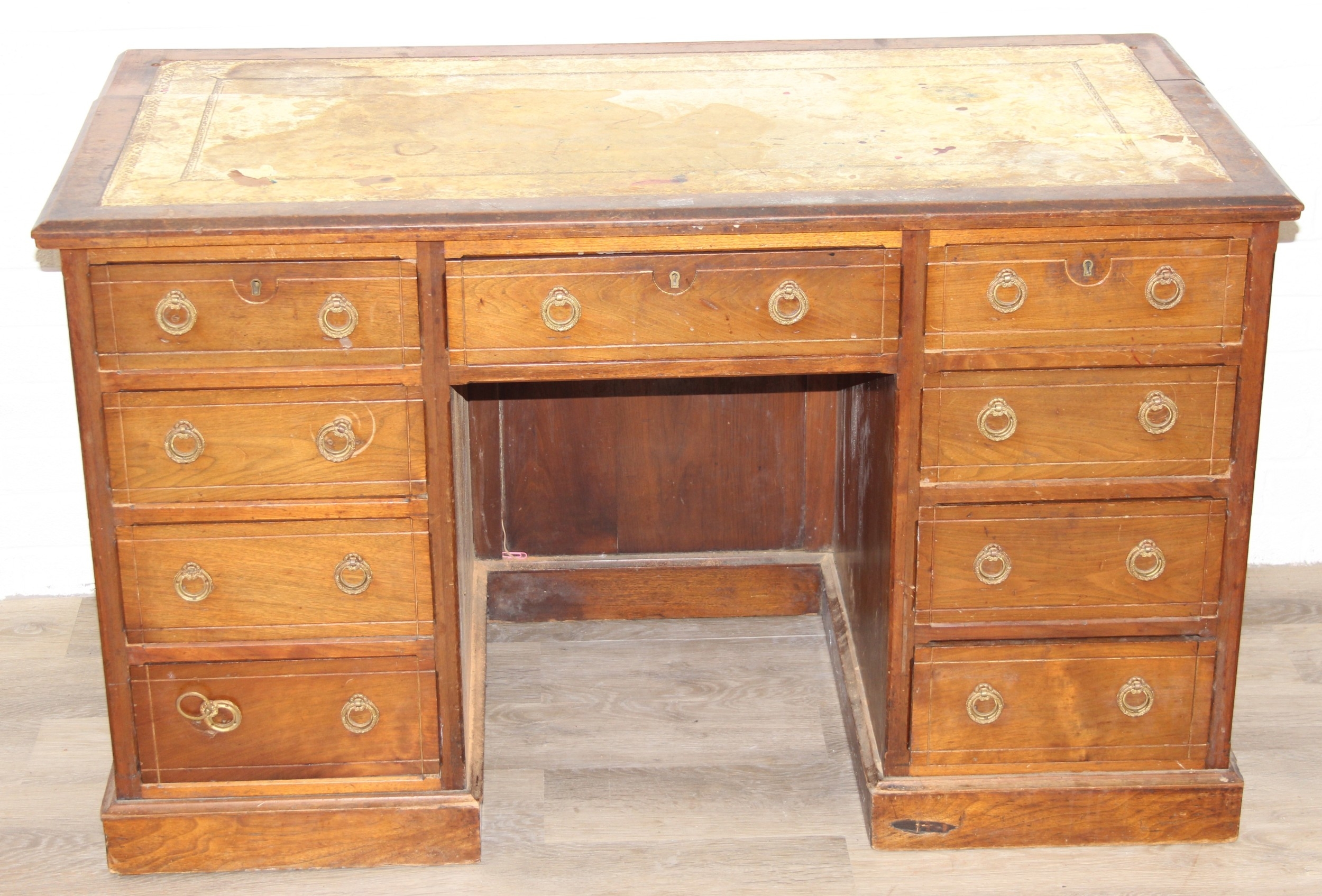 An early 20th century mahogany desk with nine drawers, distressed leather top and brass ring handles, 122cm x 90cm x 76cm