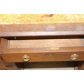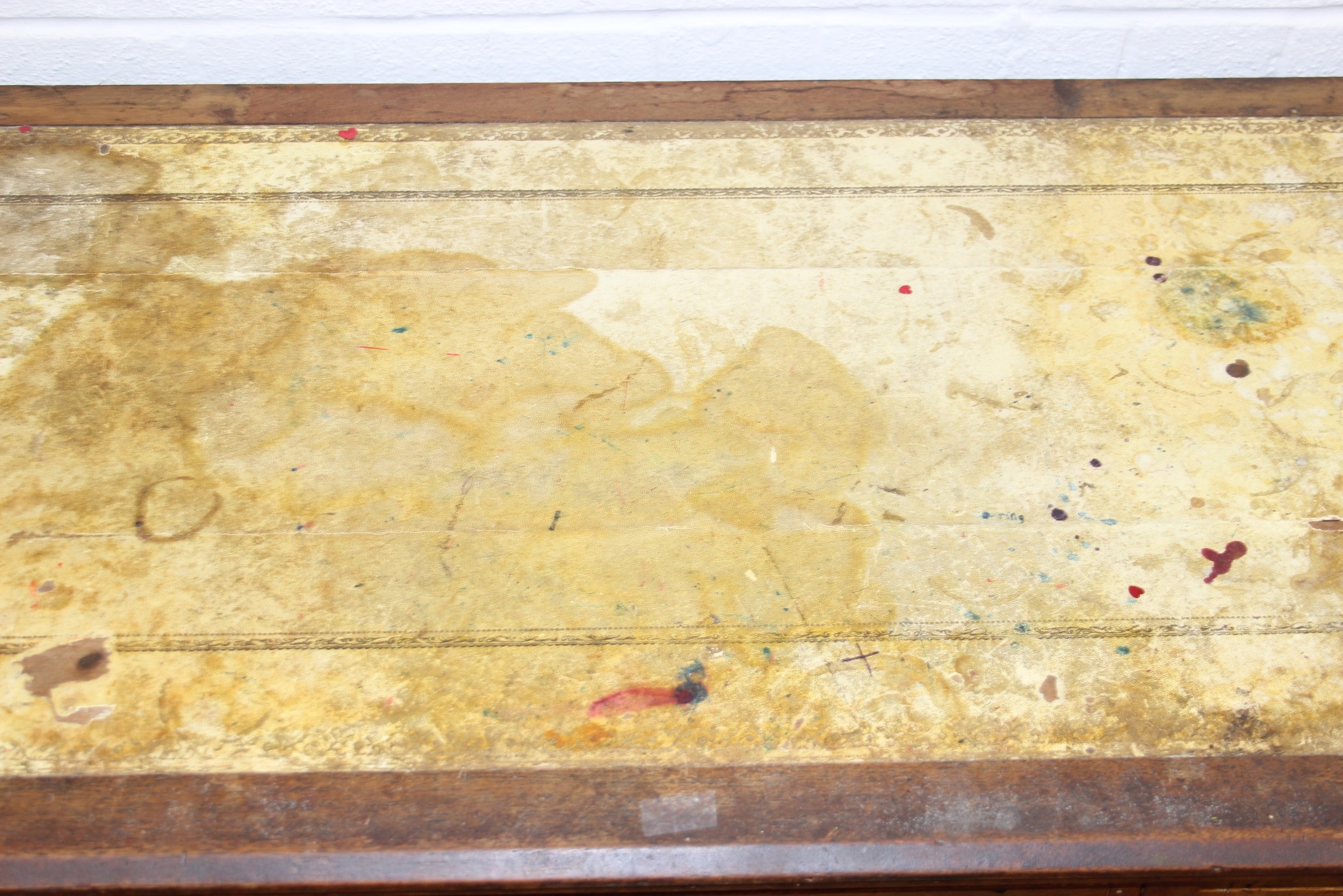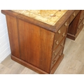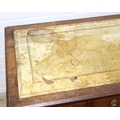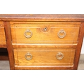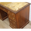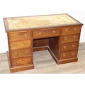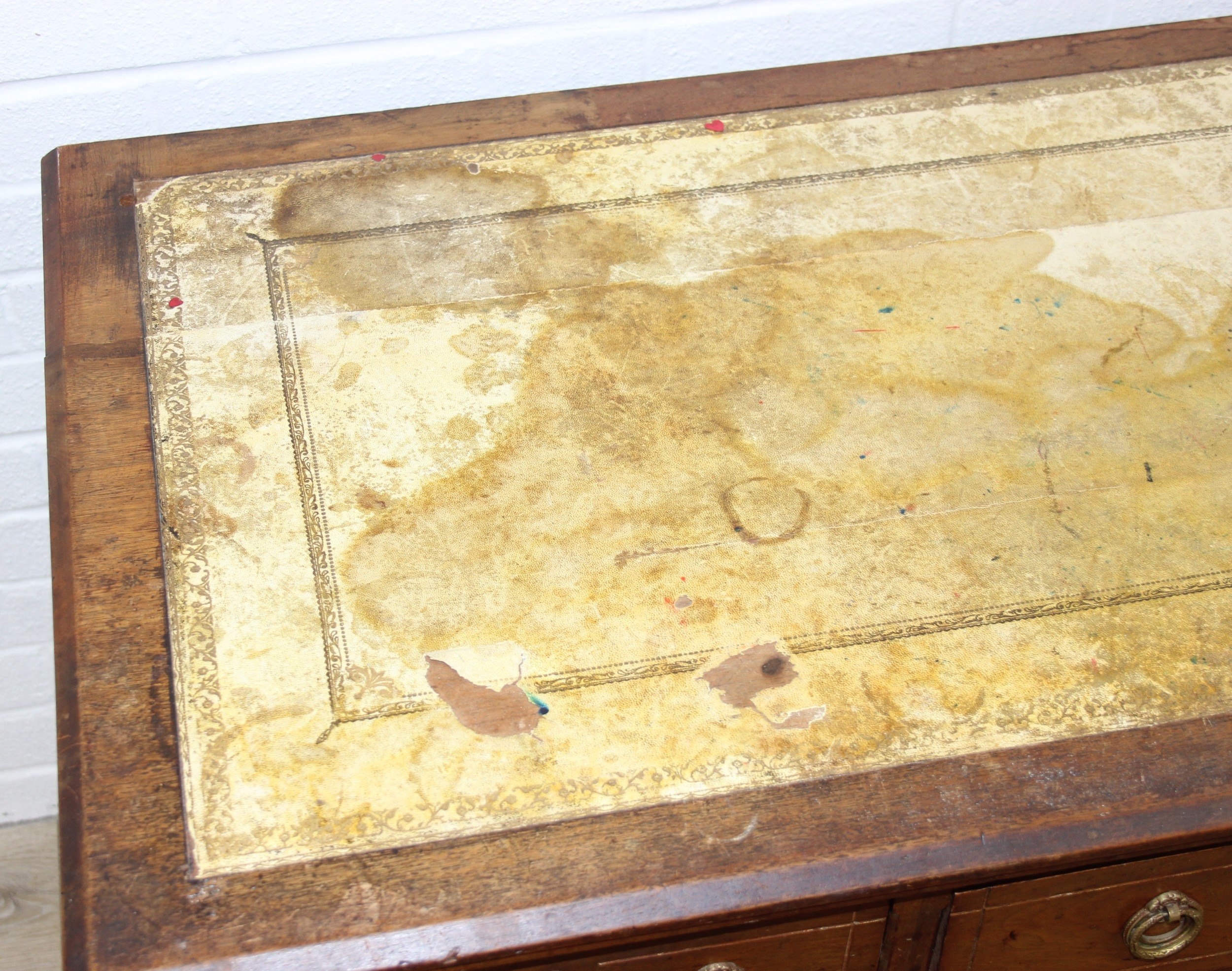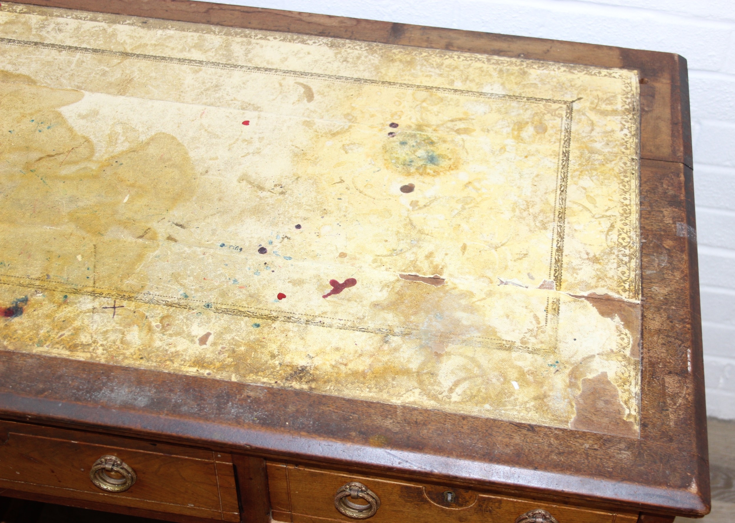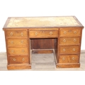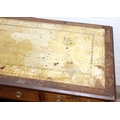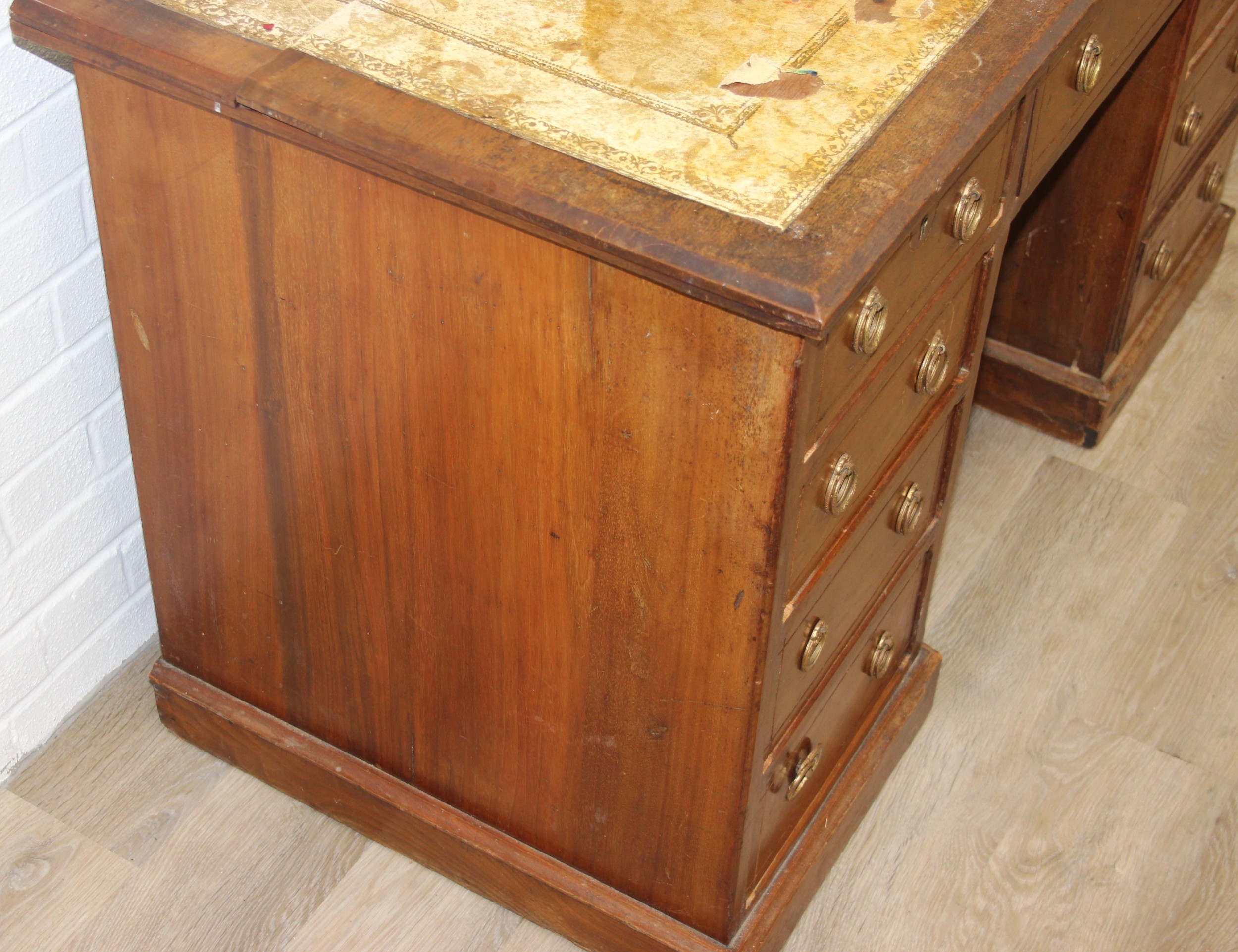 An early 20th century mahogany desk with nine drawers, distressed leather top and brass ring handles, 122cm x 90cm x 76cm