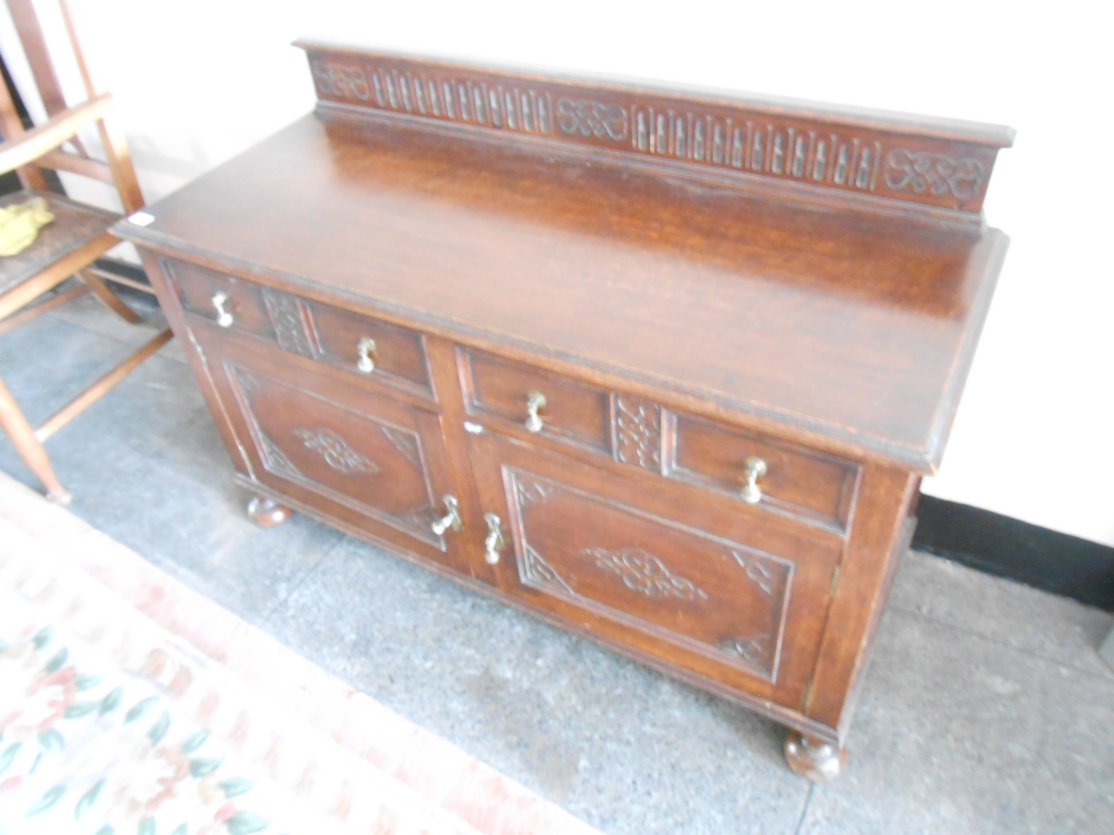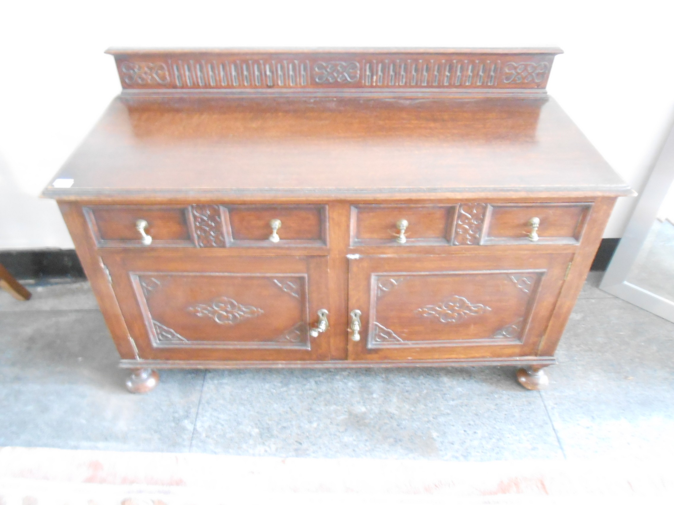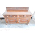 An oak side cabinet with low raised back, fitted two drawers, cupboards under with brass drop handles - 47in. wide