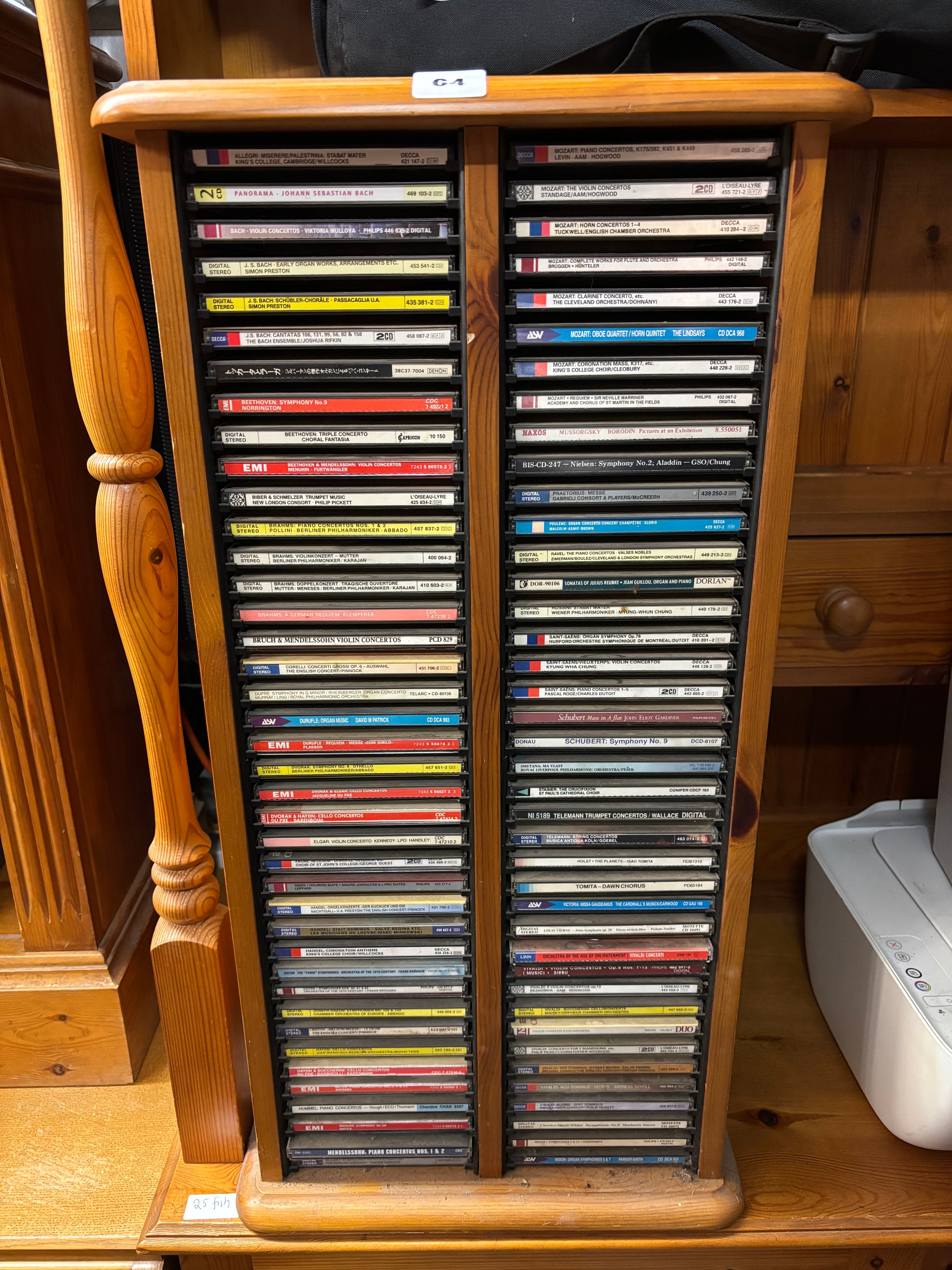 PINE CD STORAGE TOWER AND CLASSICAL CD CONTENTS, PLUS ONE OTHER CD RACK