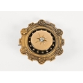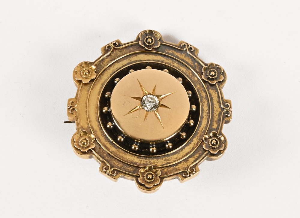 A Victorian gold coloured brooch, with central diamond, diamond diameter 3 mm and with floral edge and locket back. Overall weight 9.5 grams, diameter 3.3 cm.