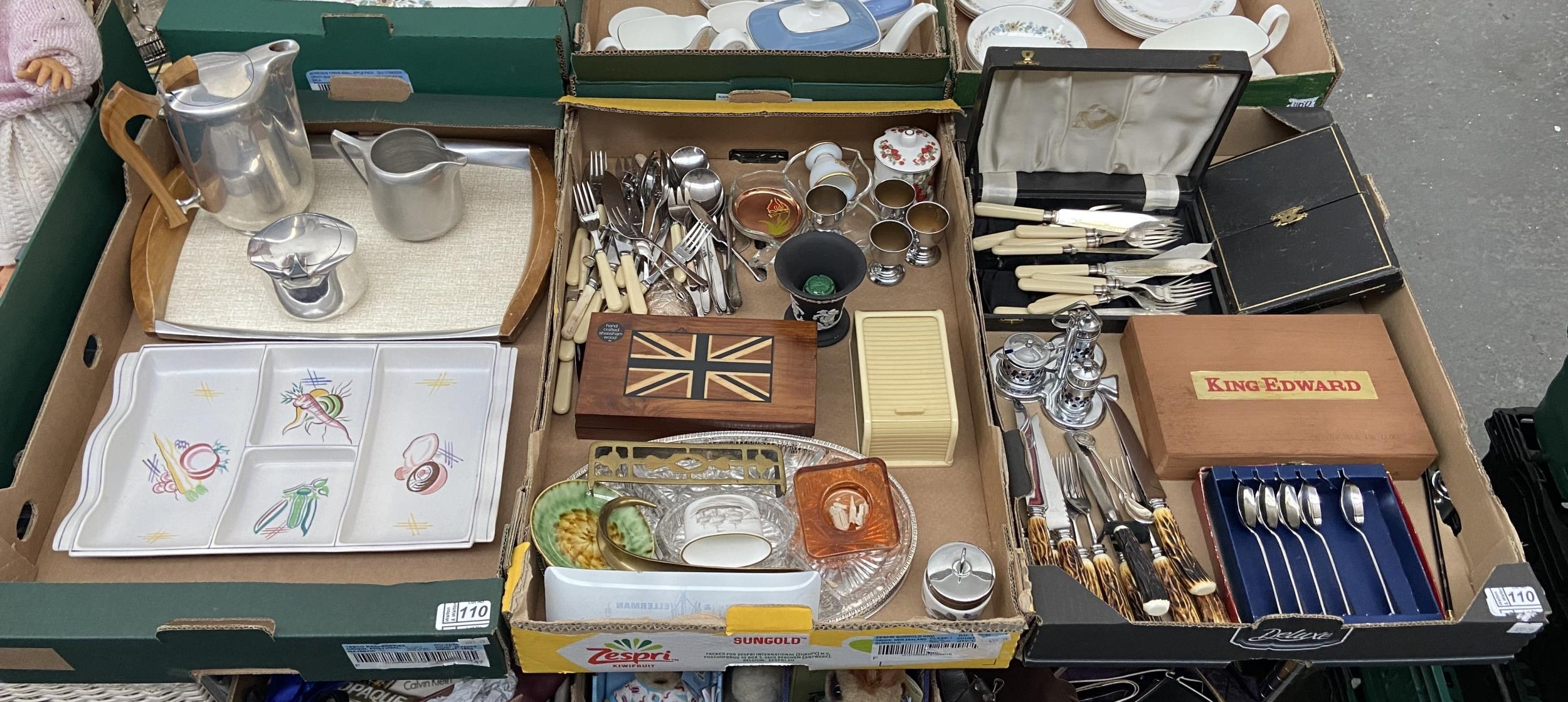 3 Boxes containing Poole, Picquot Ware and cutlery