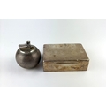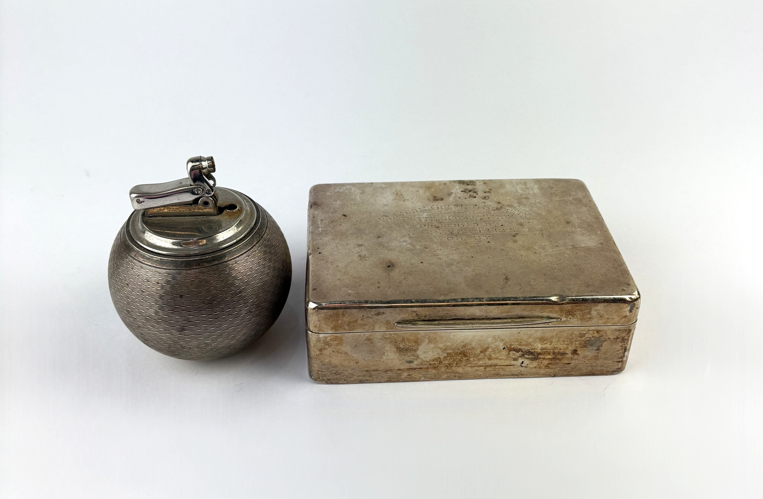 A George V Art Deco silver mounted presentation cigarette box, by James Deakin & Son, Birmingham, 1933, width 12cm; together with an Elizabeth II silver mounted 'Witchball' table lighter, by William Comyns & Son., London, 1964, engine turned decoration, (AF) height 8cm (2)