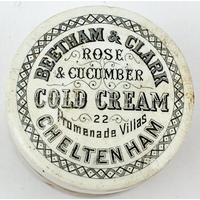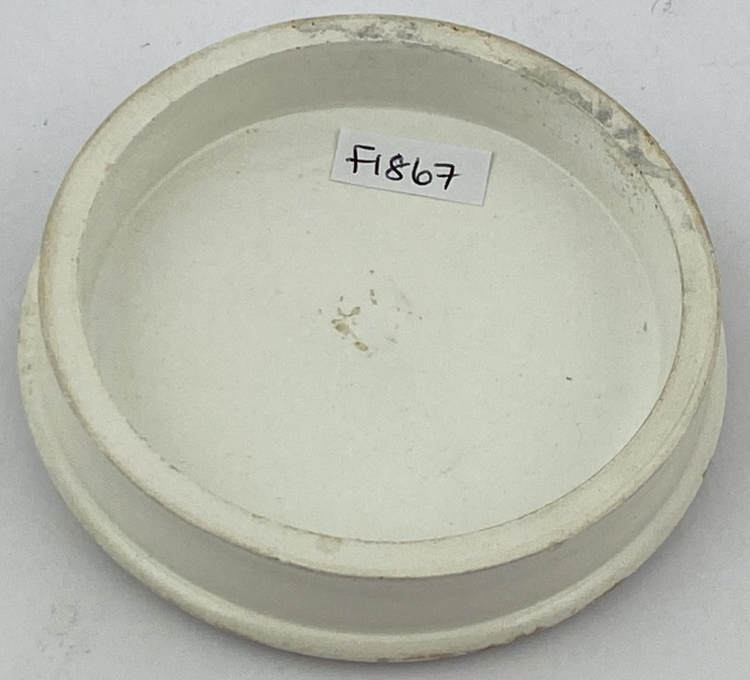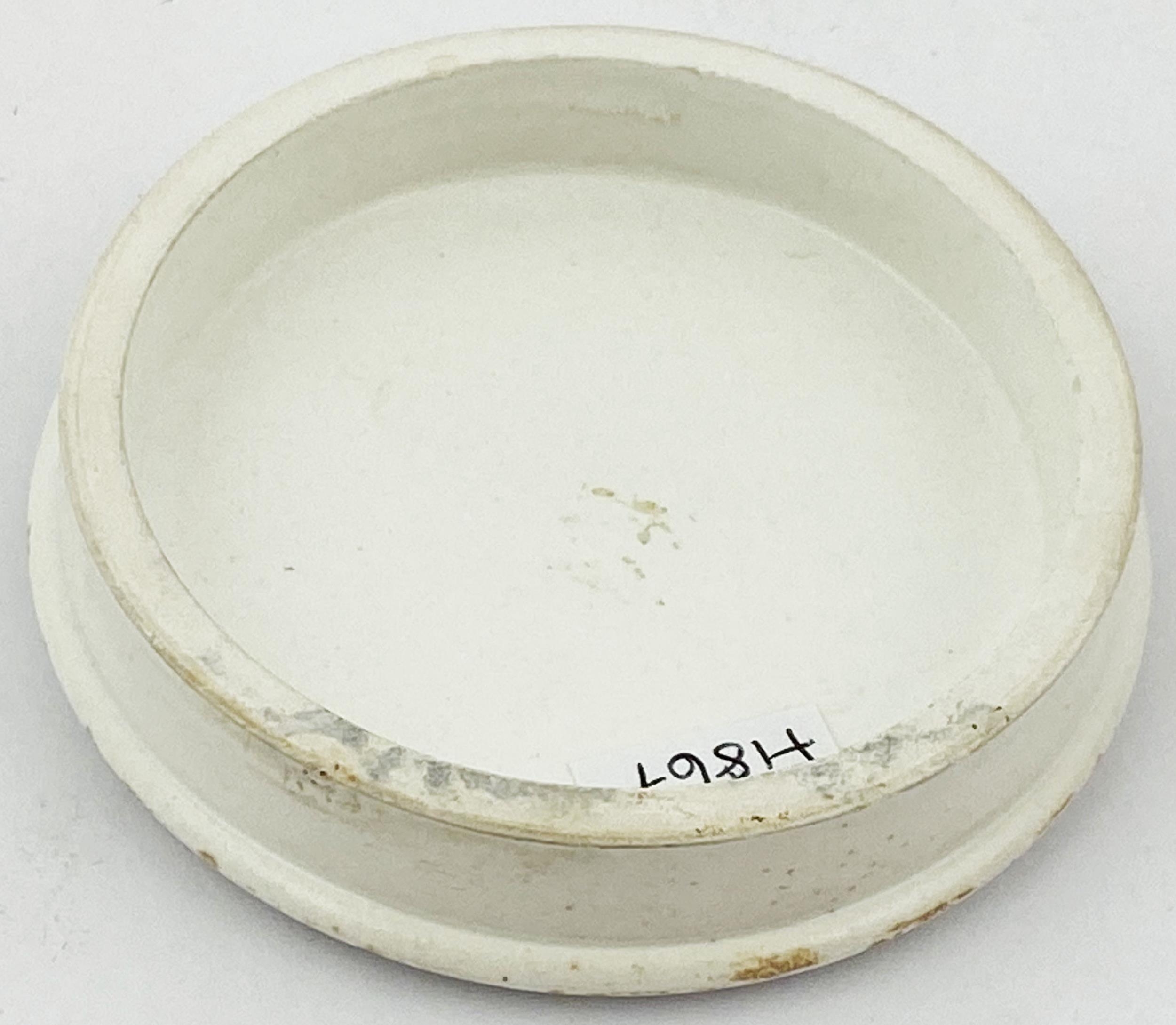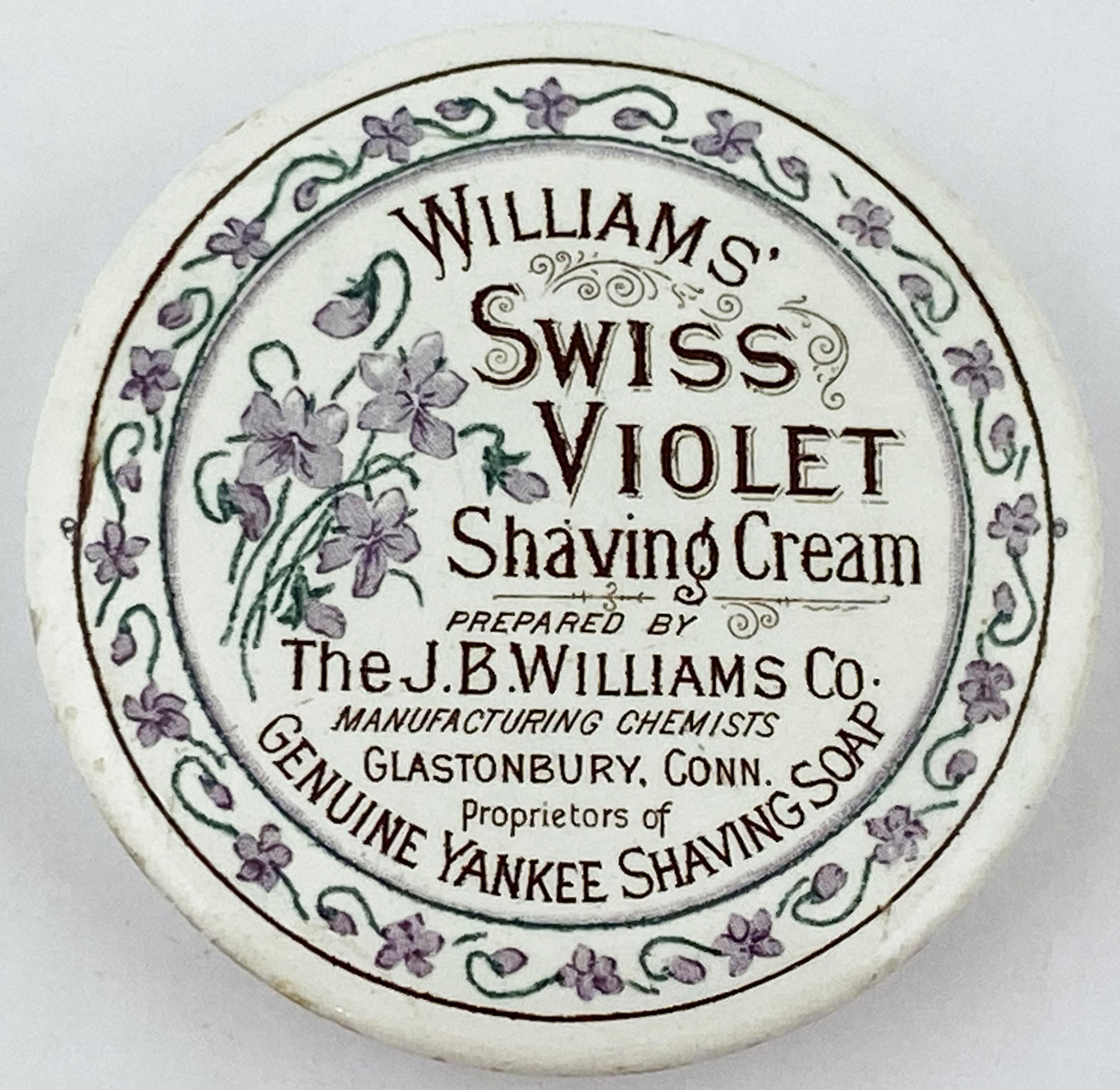 WILLIAMS SWISS VOILET SHAVING CREAM POT LID. 3.7ins diam. Several colours to transfer. J. B. WILLIAMS CO/ MANUFG CHEMISTS in centre. Decorated with lilac flowers. Minor surface scratch & outer edge nibbles