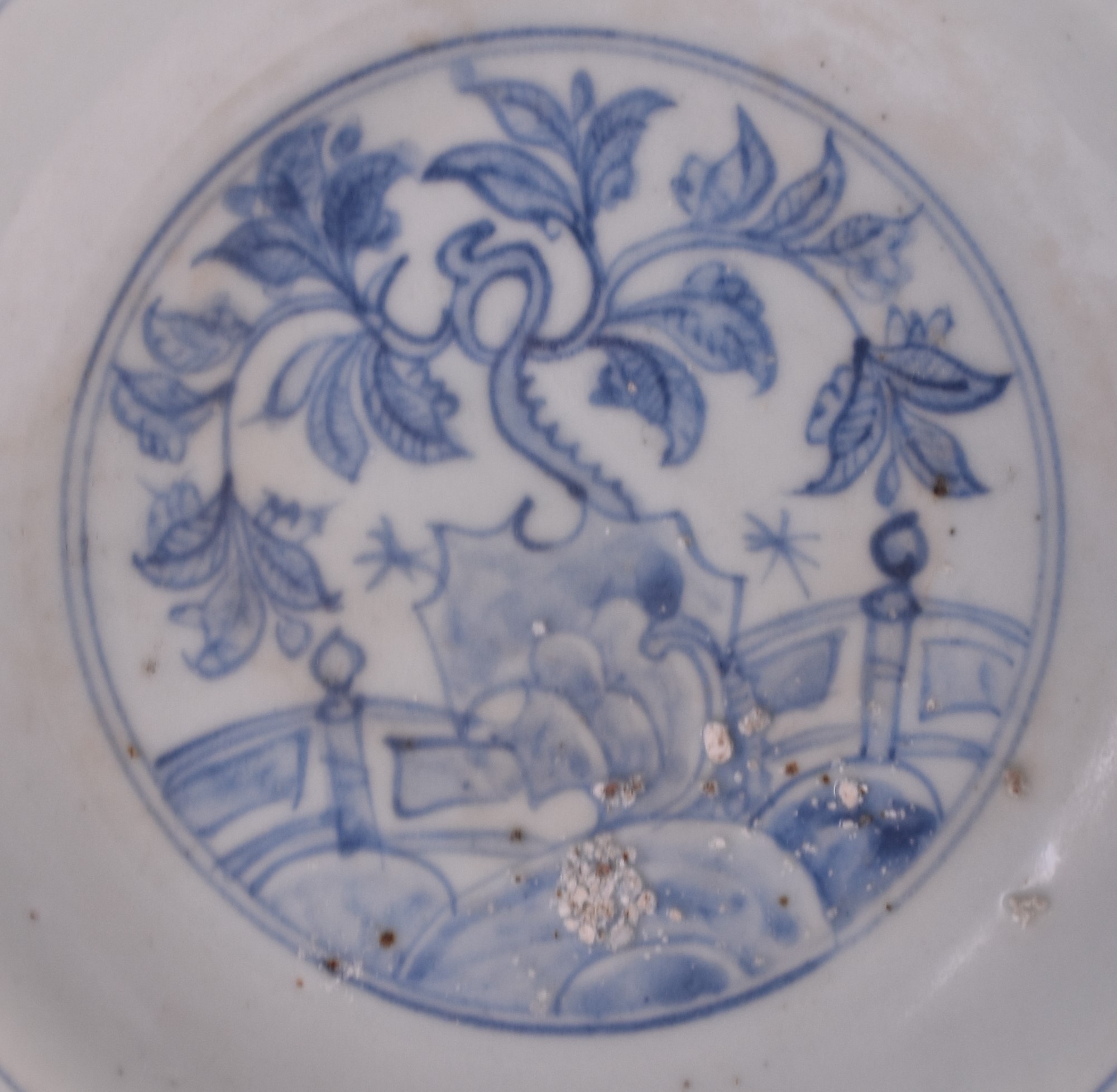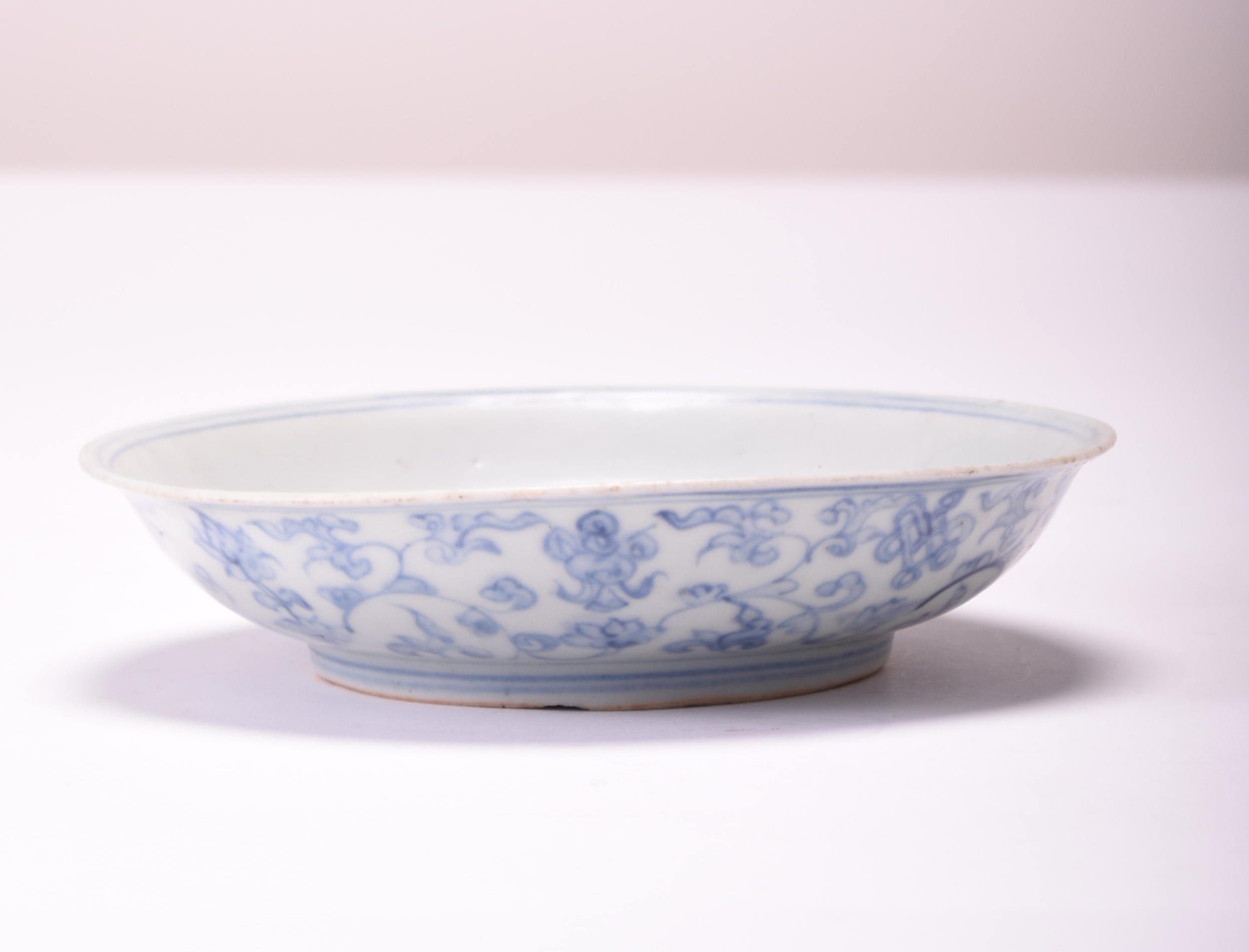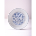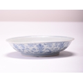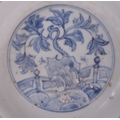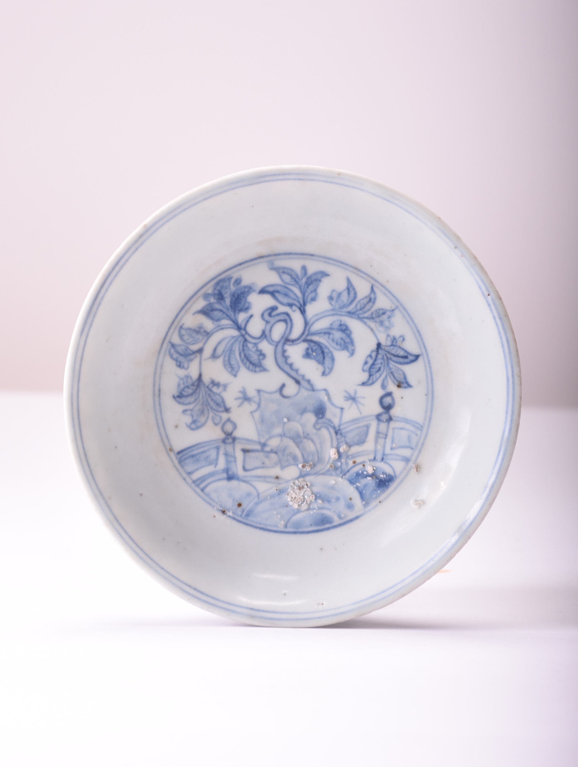 A Chinese blue and white dish, late Ming/transitional Of plain round form, the inside decorated with a garden landscape with flowering tree and rocks beside a fence, the outside with scrolling foliage and Buddhist emblems. 16.5cm dia.