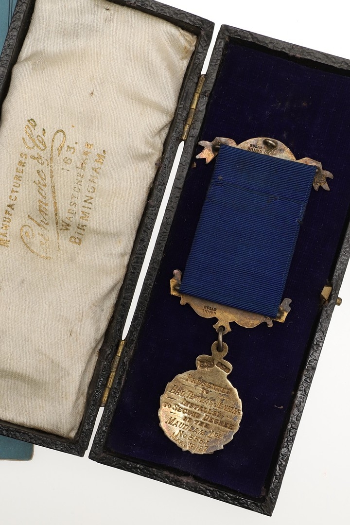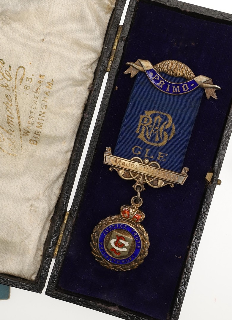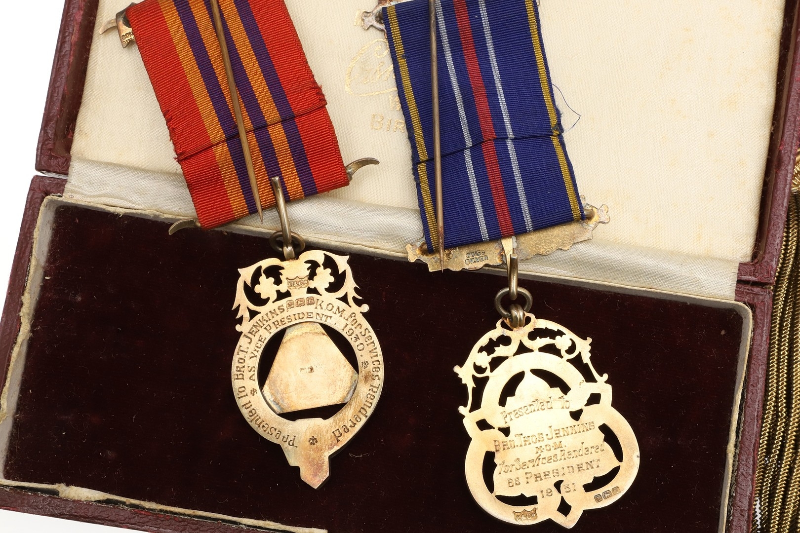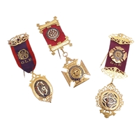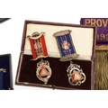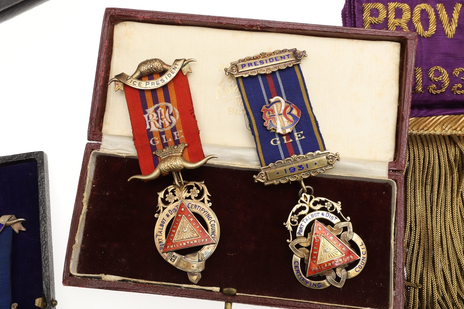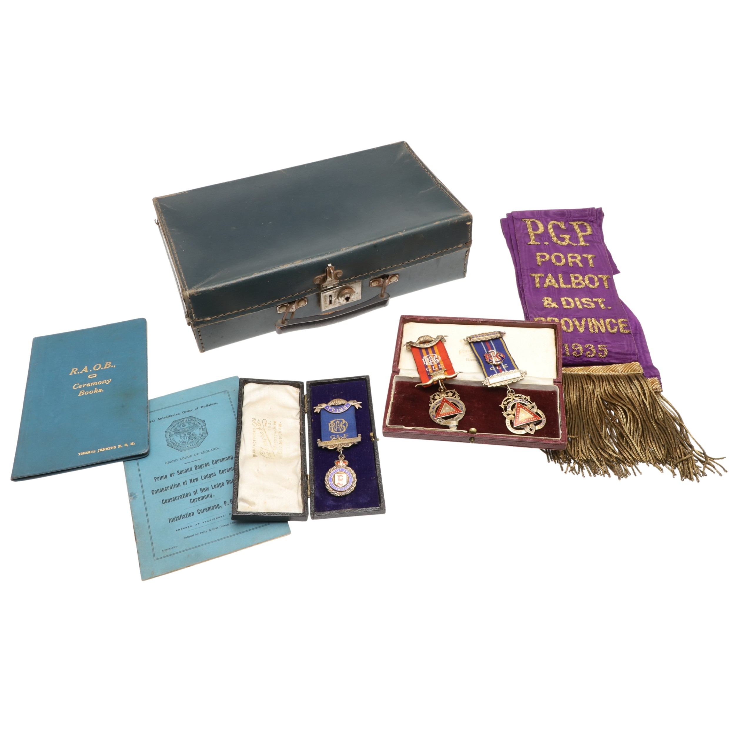 THREE SILVER AND ENAMEL RAOB MEDALS AND OTHER ITEMS. Three Royal Antediluvian Order of Buffaloes (RAOB) silver and enamel medals with enamel date of 1931, Vice President and others, all with presentation inscriptions to the reverses for Birmingham 1931 and similar. Total weight including ribbons, pins etc c. 107g. In two presentation cases, sash and other items.