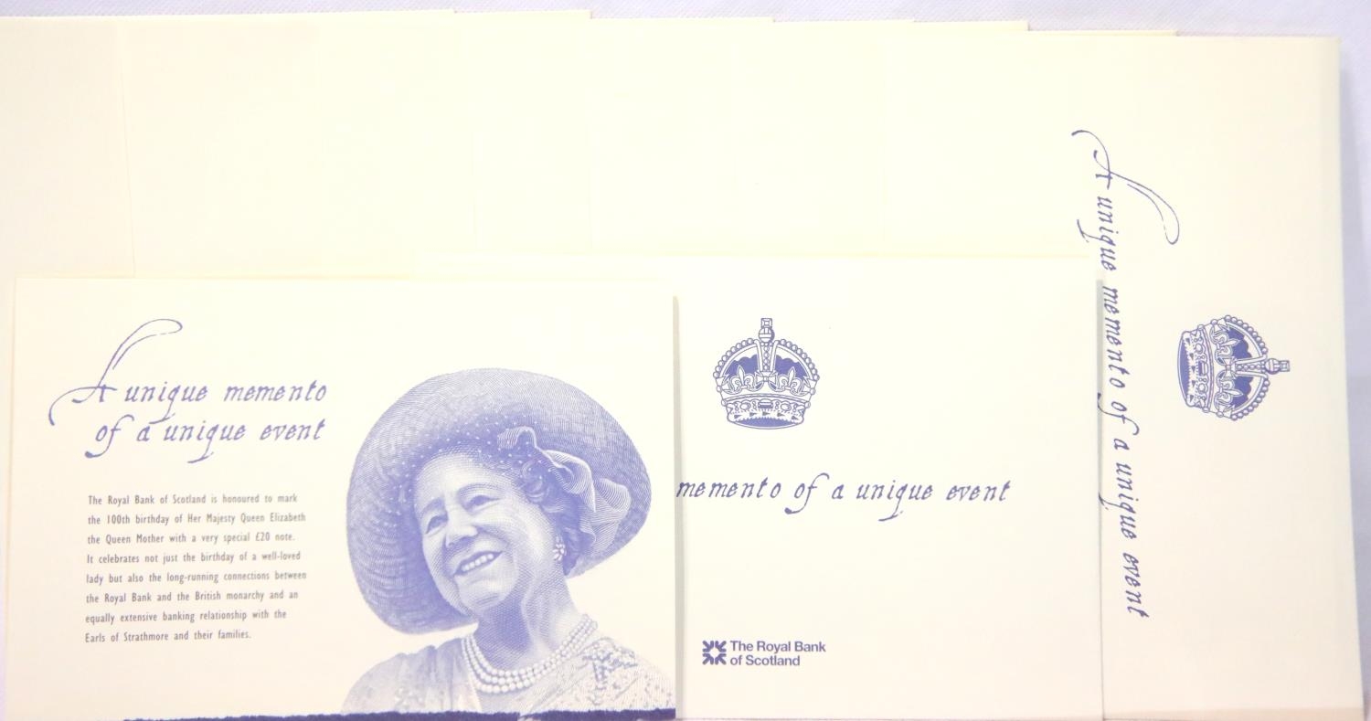 Eight Queens Mother 100th Birthday £20 notes RBS. P&P Group 1 (£14+VAT for the first lot and £1+VAT for subsequent lots)