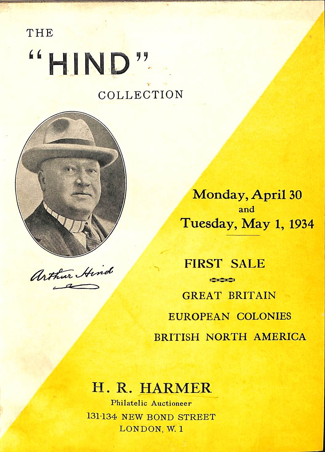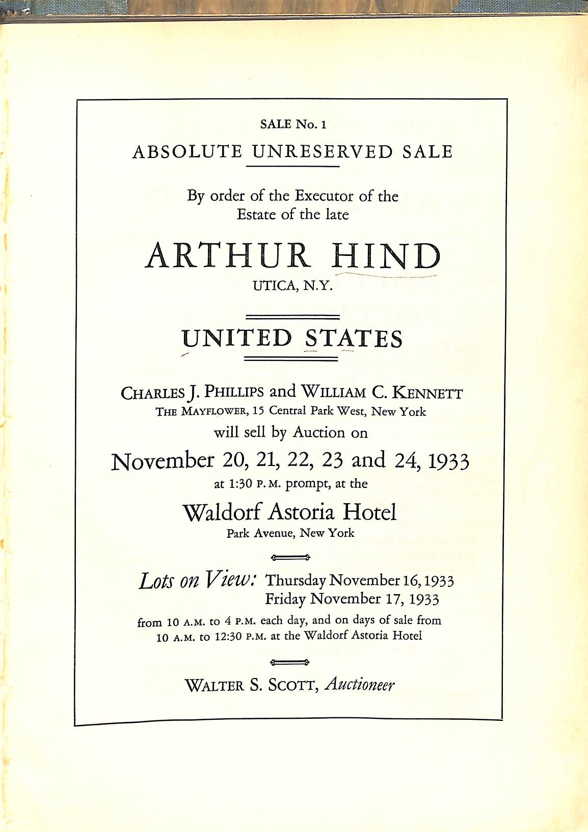 Arthur Hind. Charles J. Phillips and William C. Kennet, 1933 catalogue of the U.S.A Collection sold in New York, hardbound, 182 illustrations; and H.R Harmer of London, the British Empire Collections offered in five catalogues in 1934, hardbound in one volume, all ex Bellamy Library with all prices written in by hand, scarce thus, an important series of auctions. (6 catalogues in two volumes).