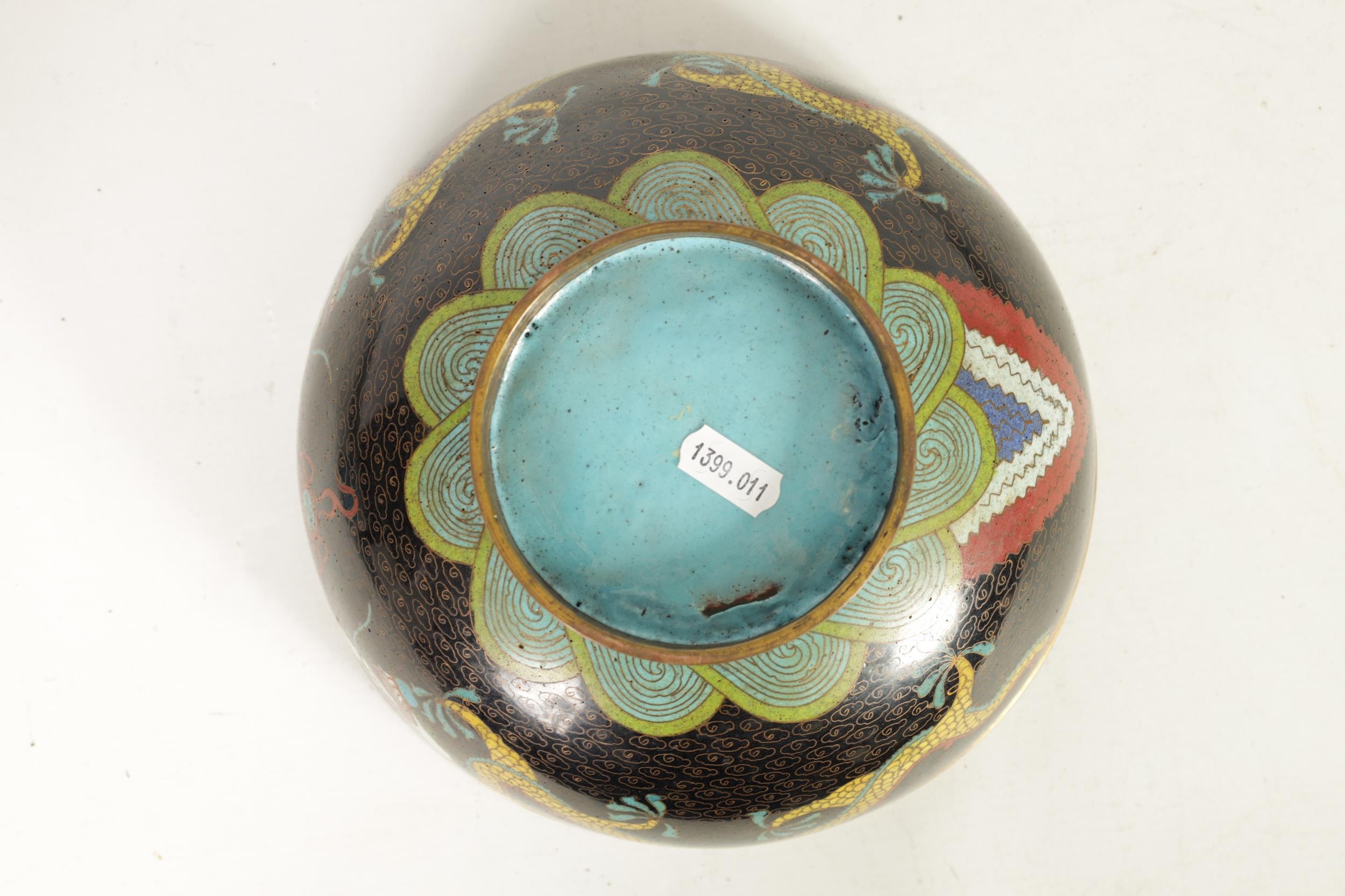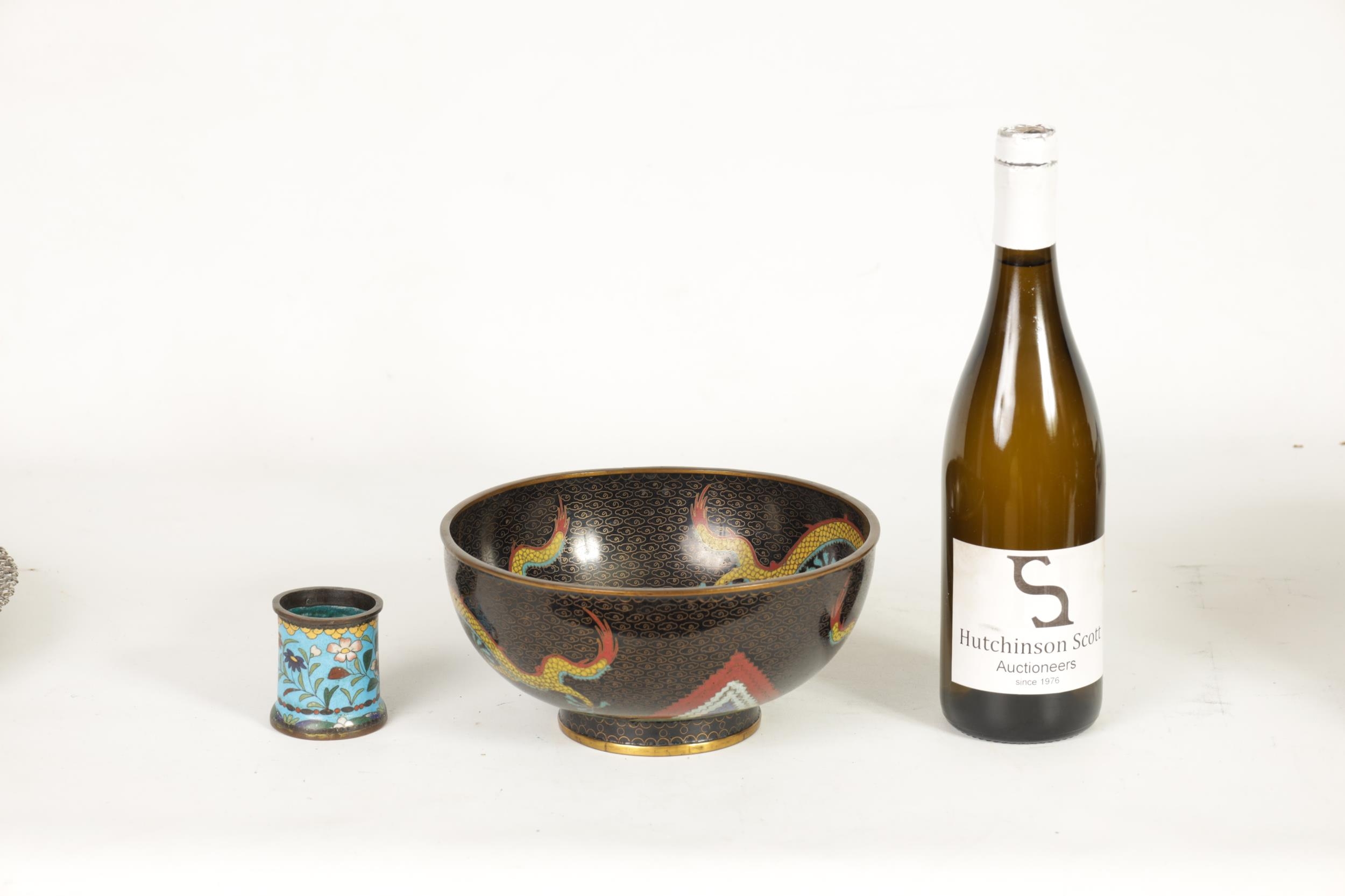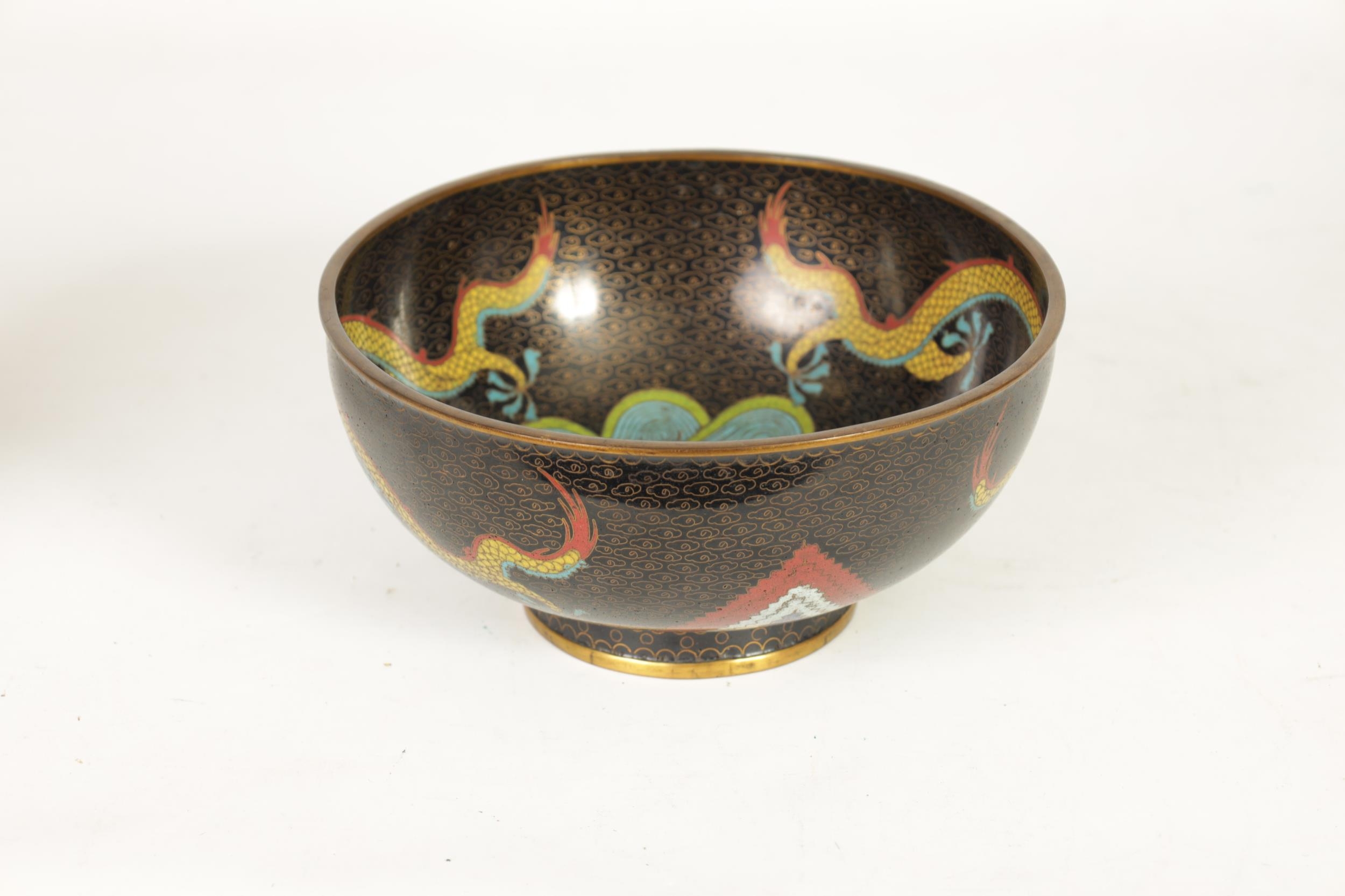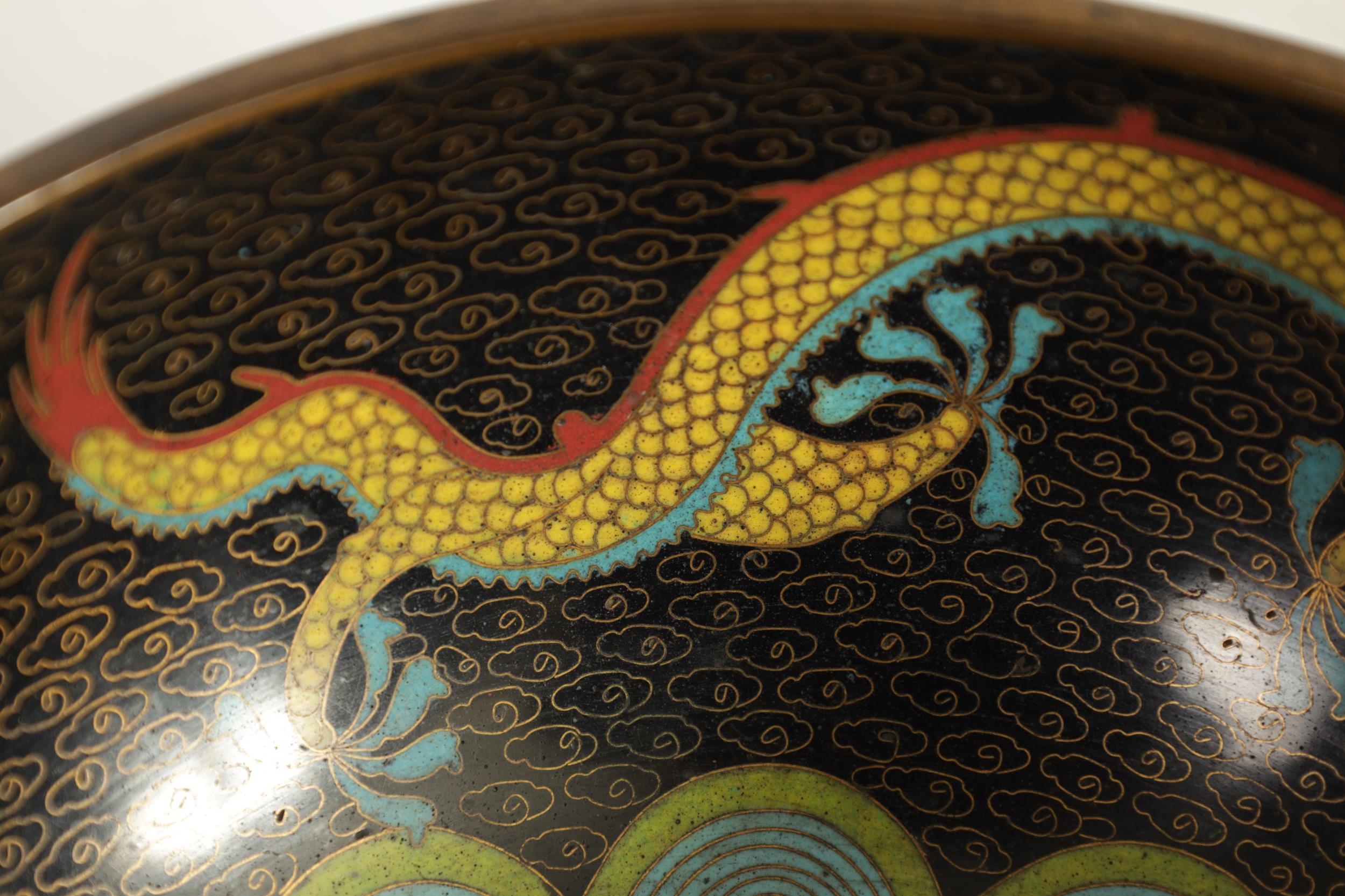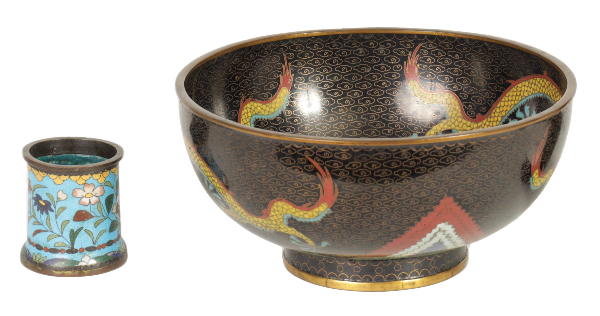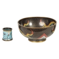 A CHINESE CLOISONNE ENAMEL DRAGON BOWL decorated with five claw dragons amongst copper inlaid clouds, the central inner panel with scrolling foliage together with A SMALL CHINESE CYLINDRICAL CLOISONNE POT with floral design (2) (Bowl 21.6cm diameter)