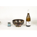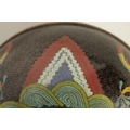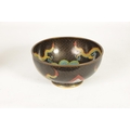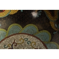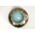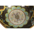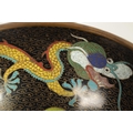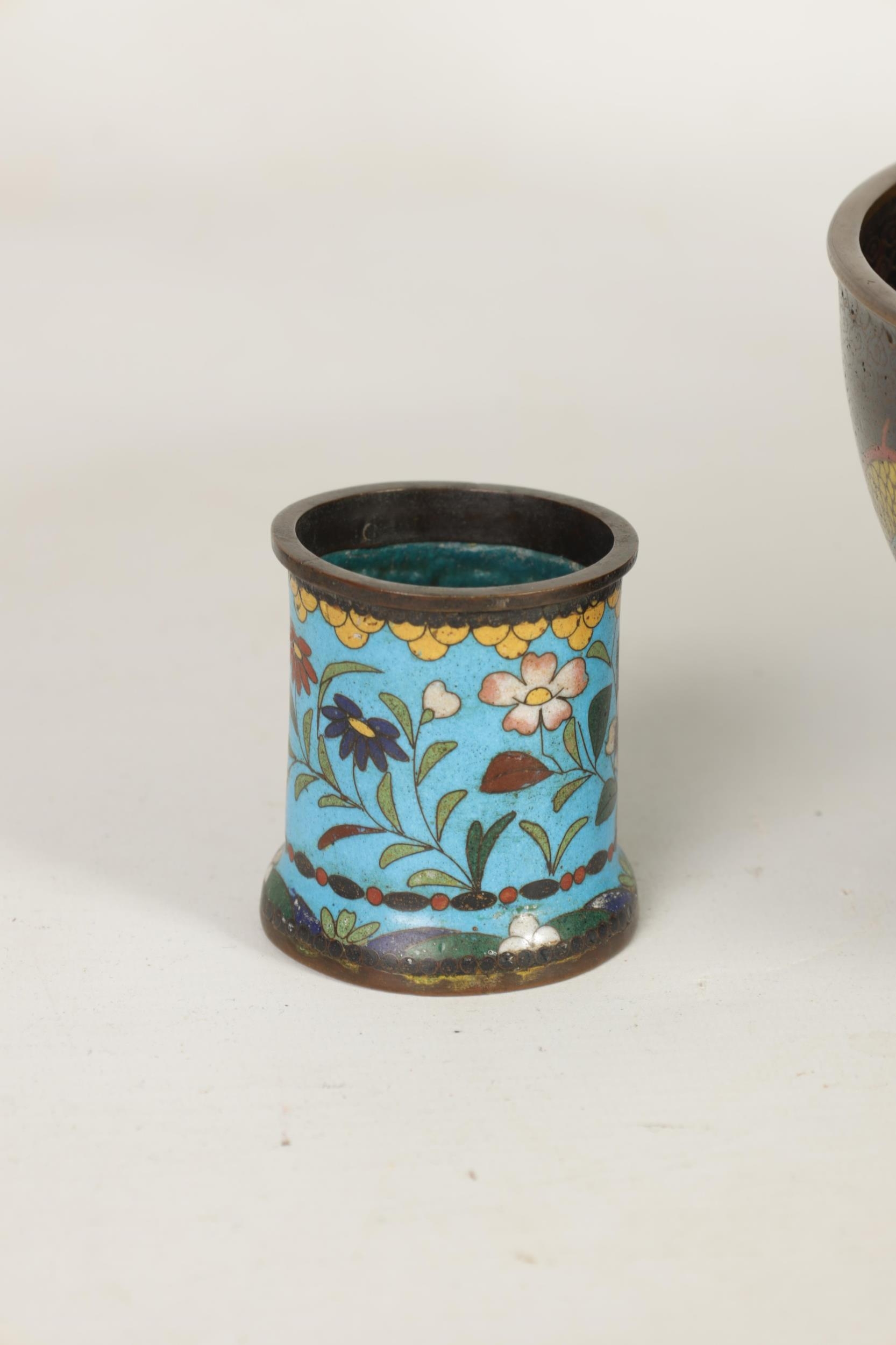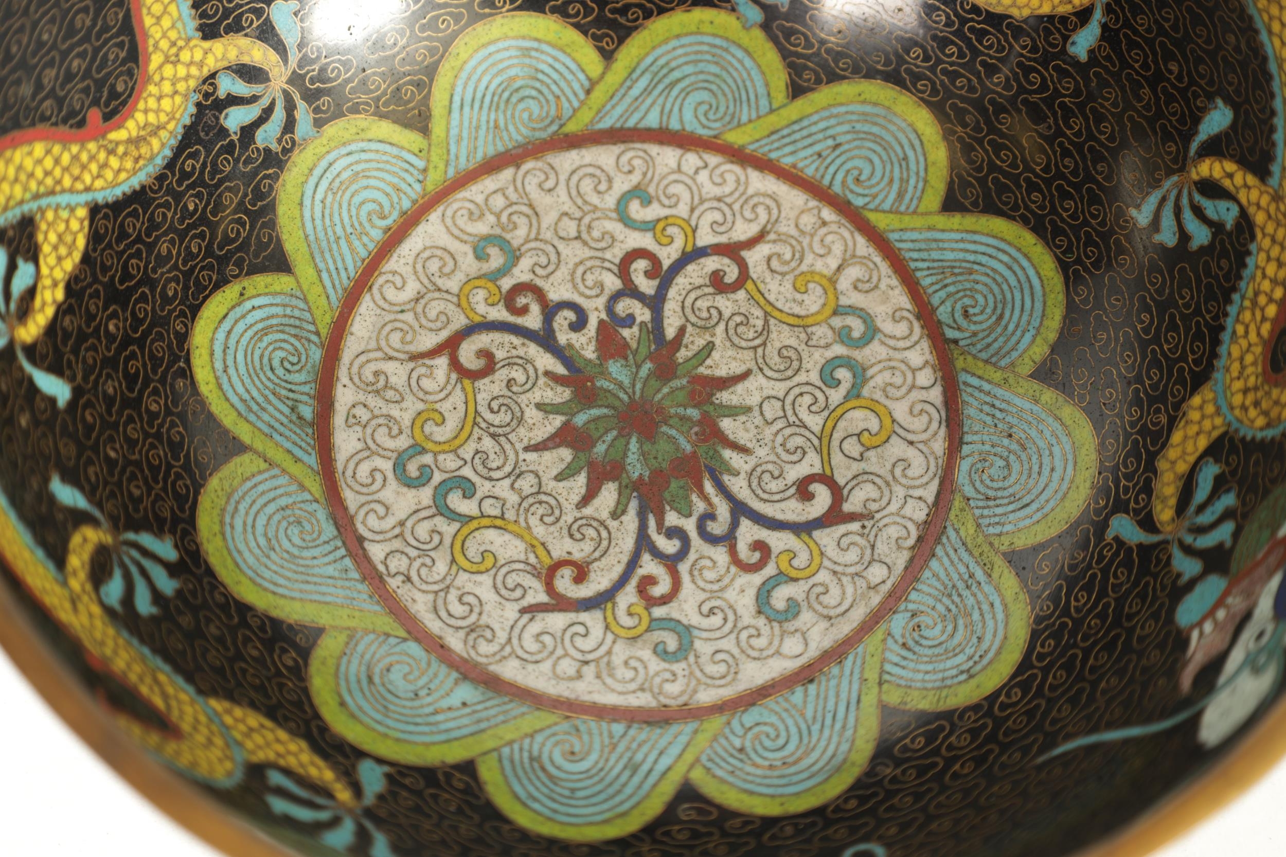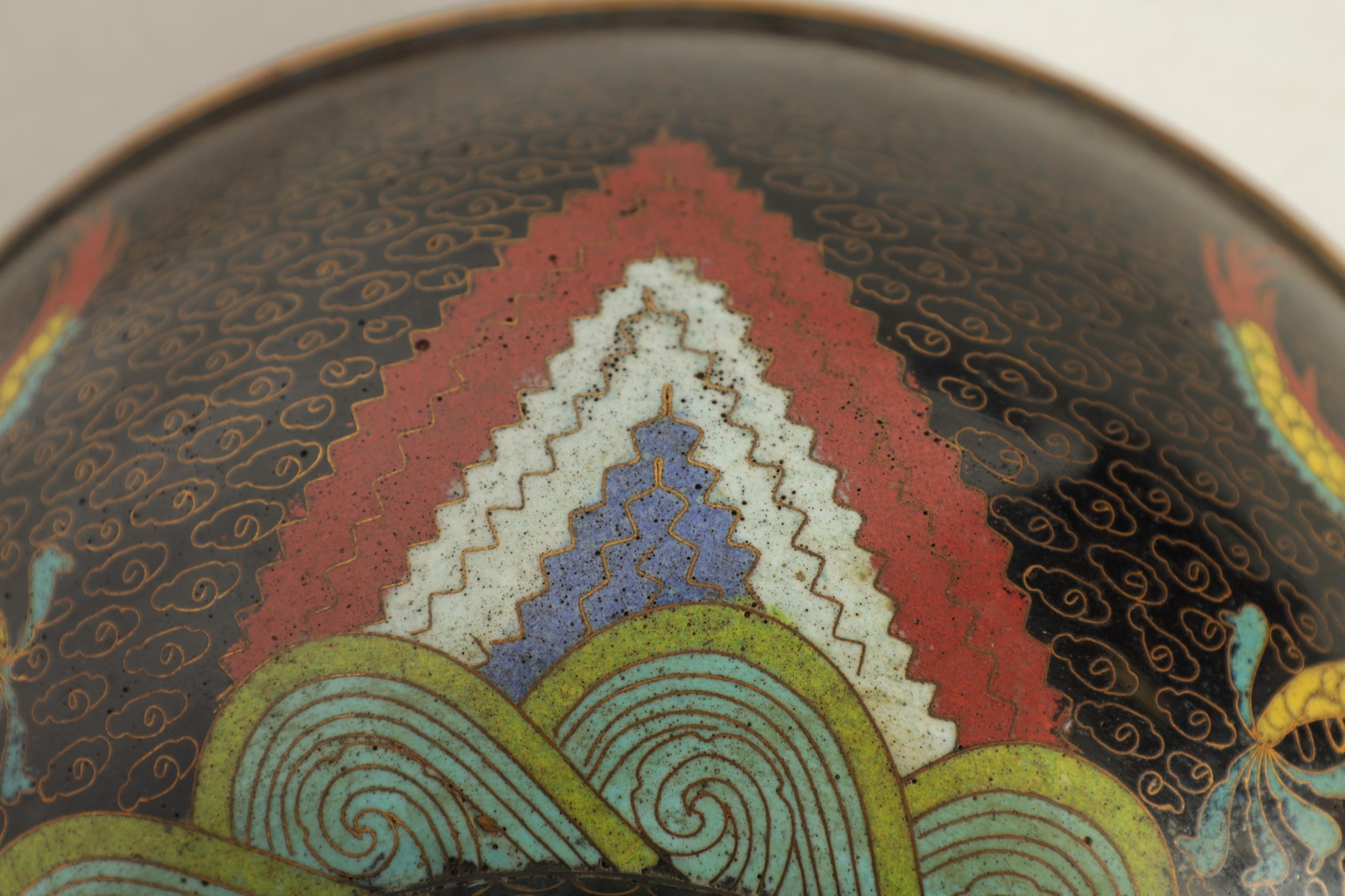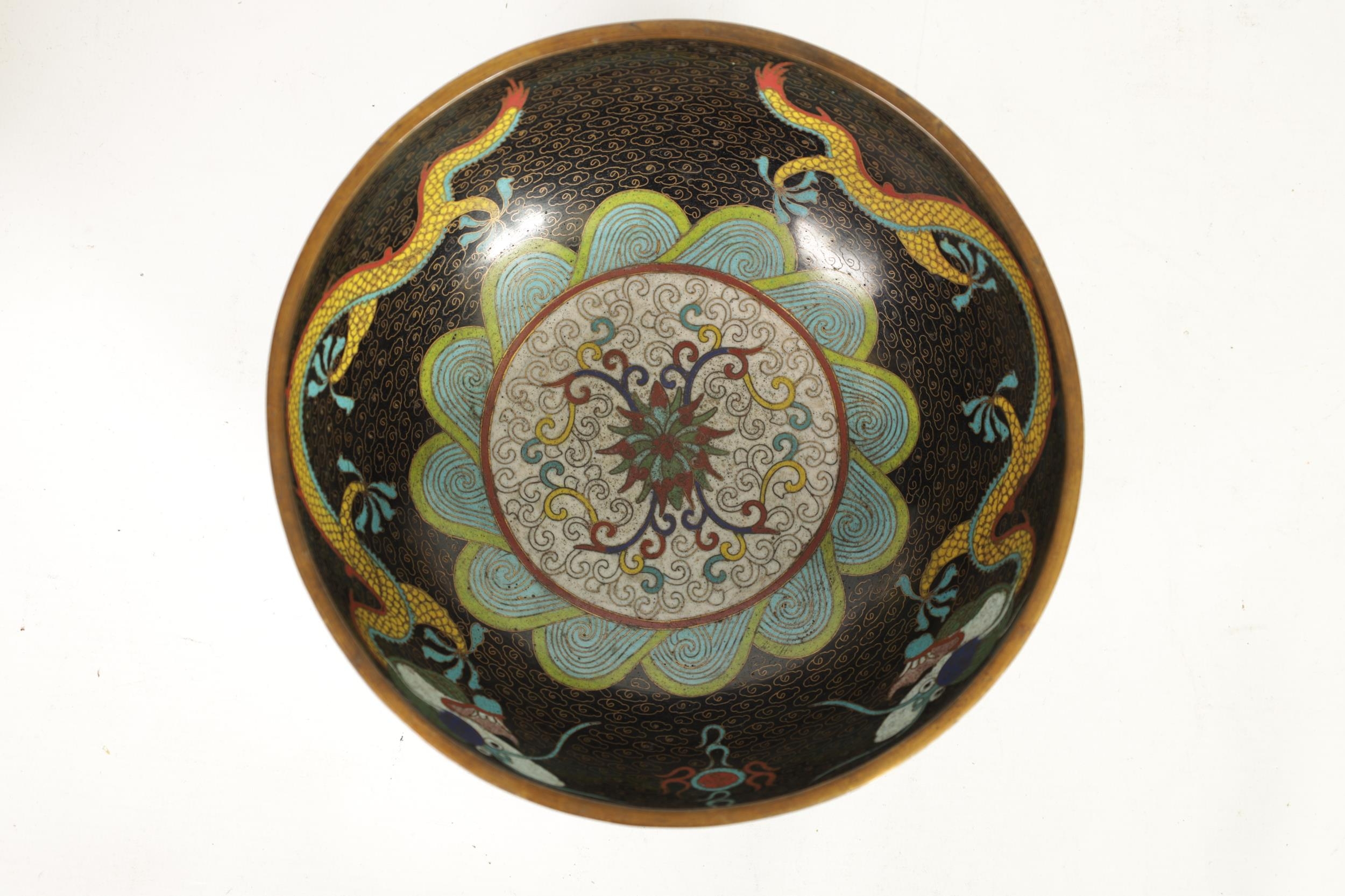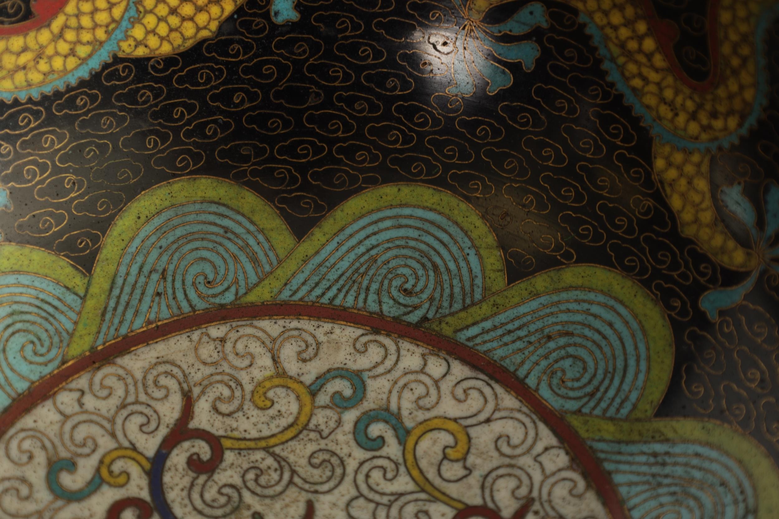 A CHINESE CLOISONNE ENAMEL DRAGON BOWL decorated with five claw dragons amongst copper inlaid clouds, the central inner panel with scrolling foliage together with A SMALL CHINESE CYLINDRICAL CLOISONNE POT with floral design (2) (Bowl 21.6cm diameter)