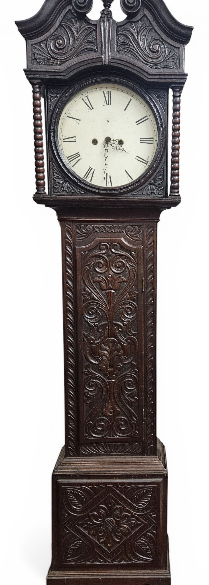 A good 19th Century white dial Oak Long Case Clock with highly carved outline. H 210 cm approx.