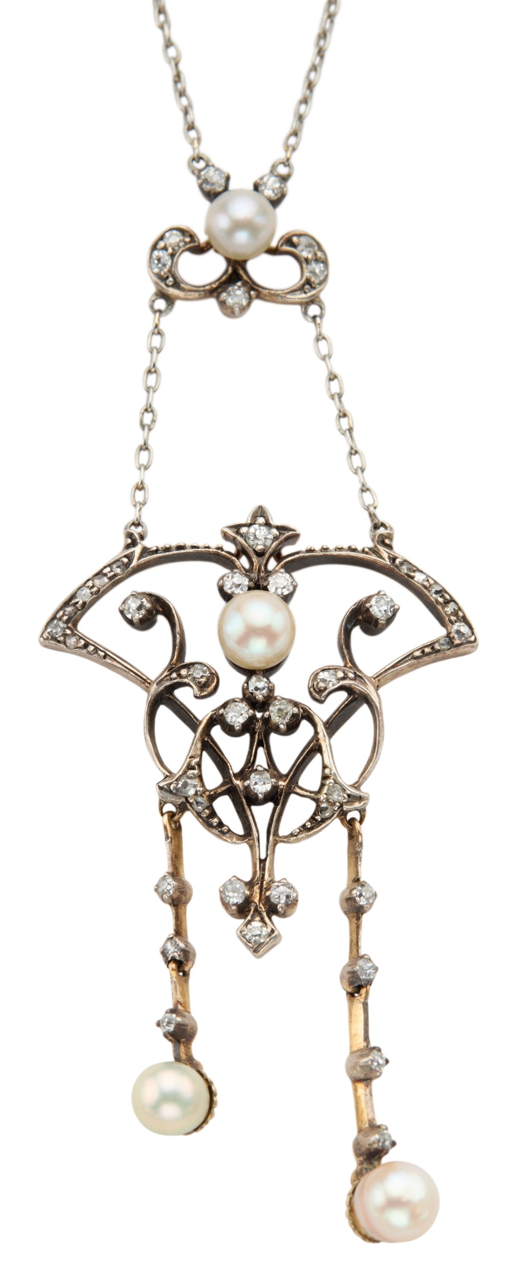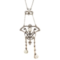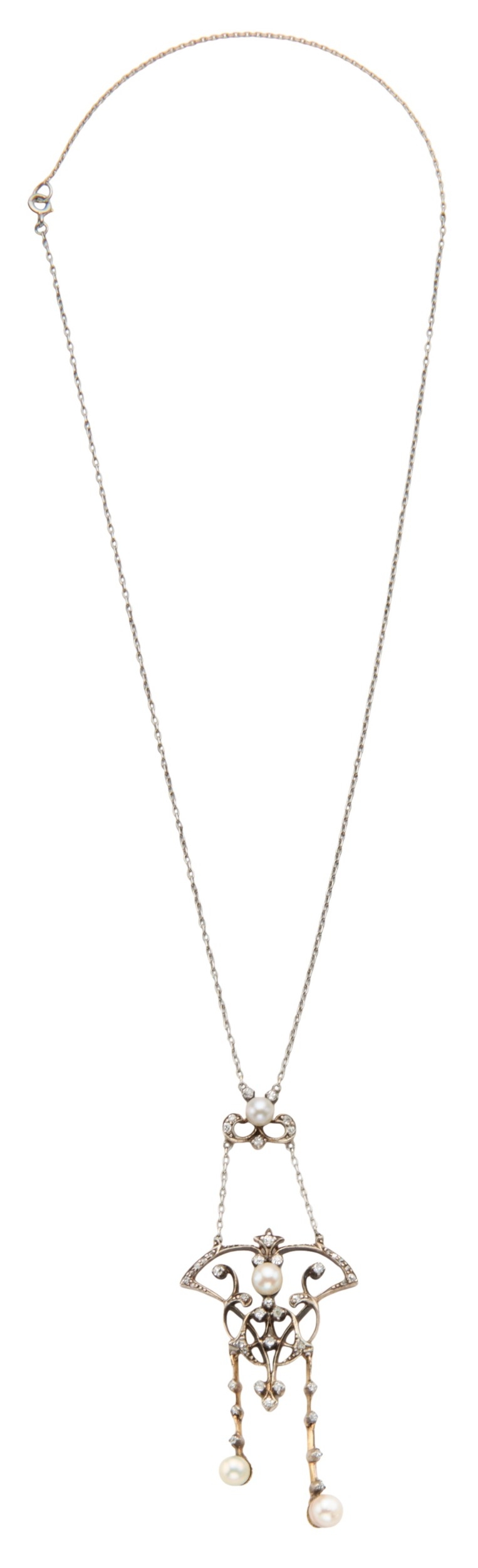 set with four pearls, approximately 5.3mm to 4.3mm diameter, within a diamond set Art Nouveau style mount, overall drop 66mm, with integral chain, 42cm long, unmarked surface testing as 15ct approximately 7.86 grams (please note the pearls have not been tested and are sold as natural or cultured pearls)