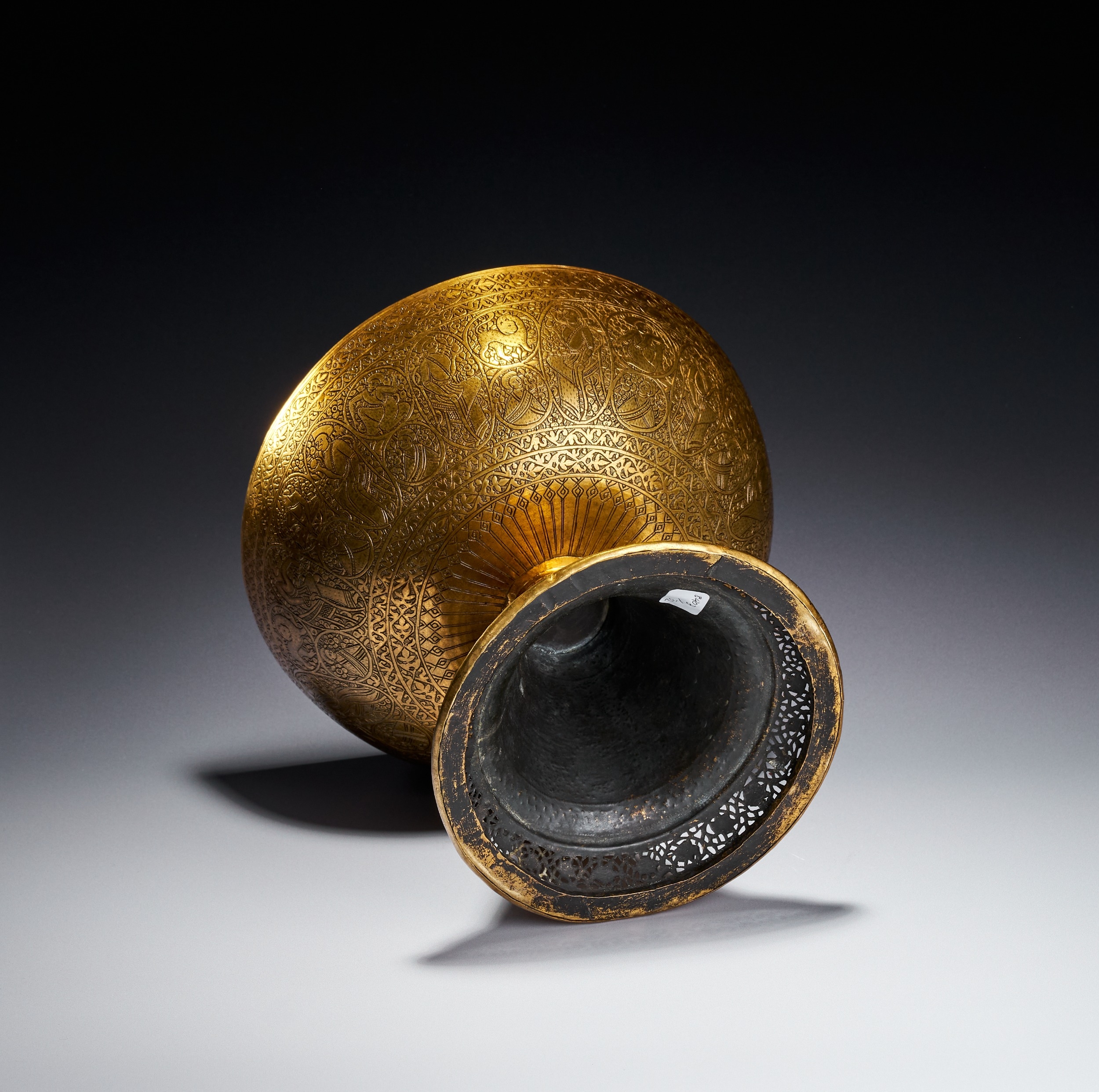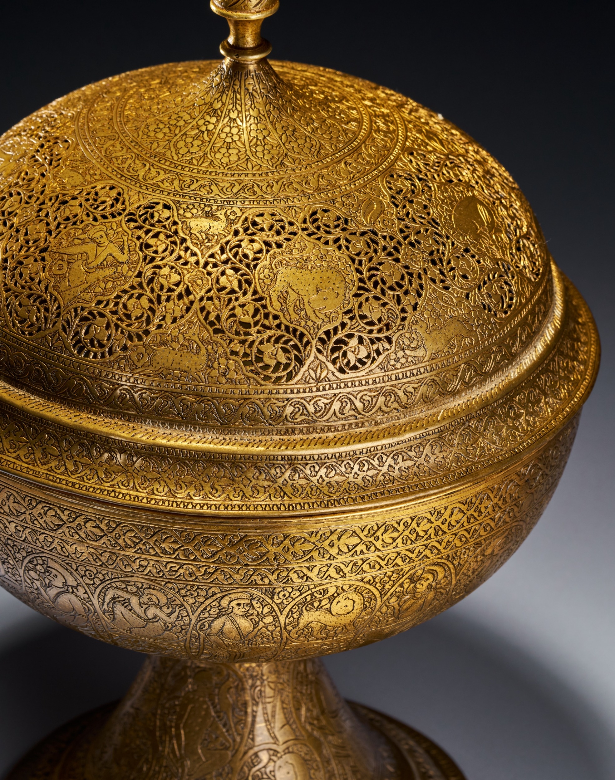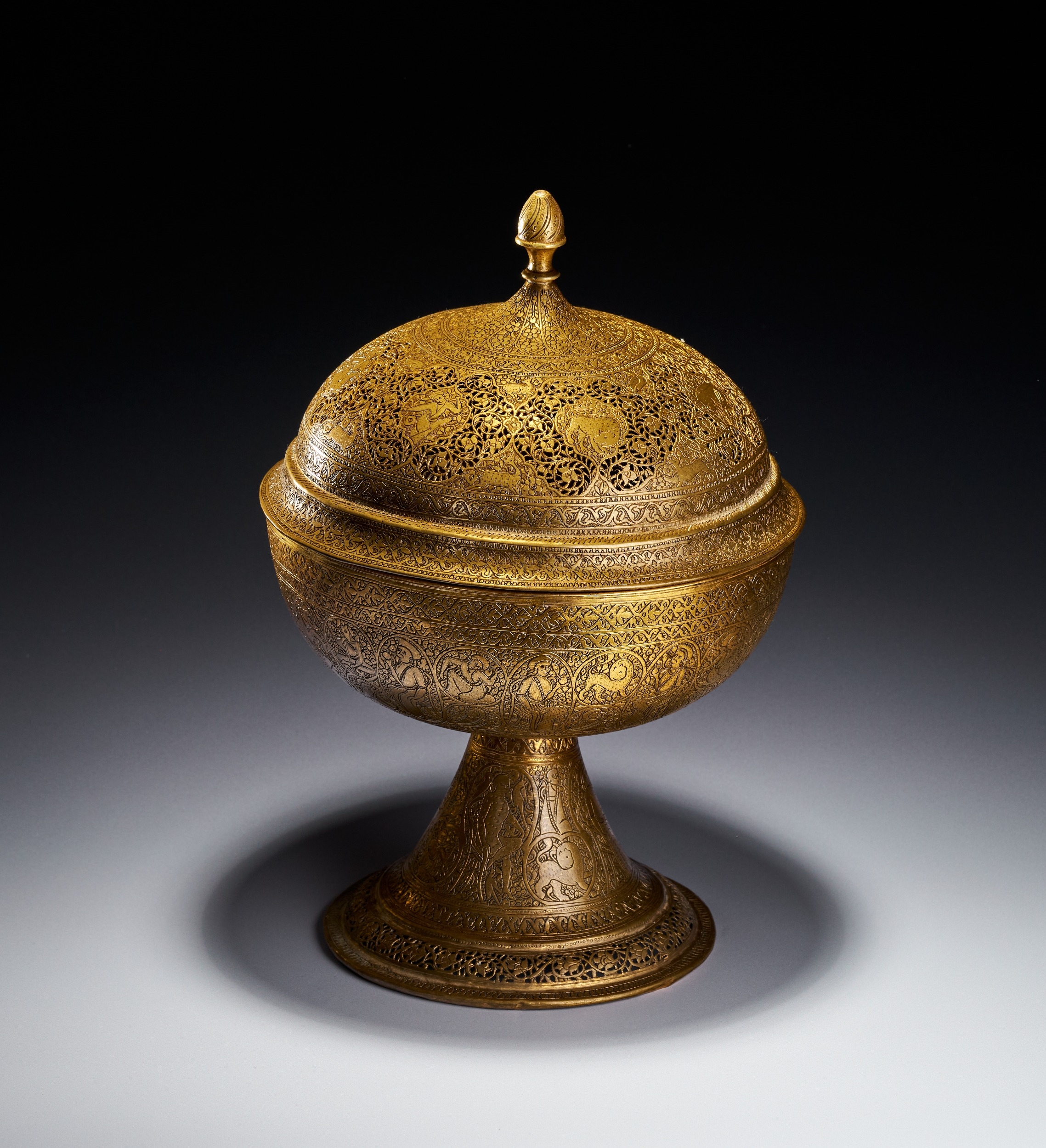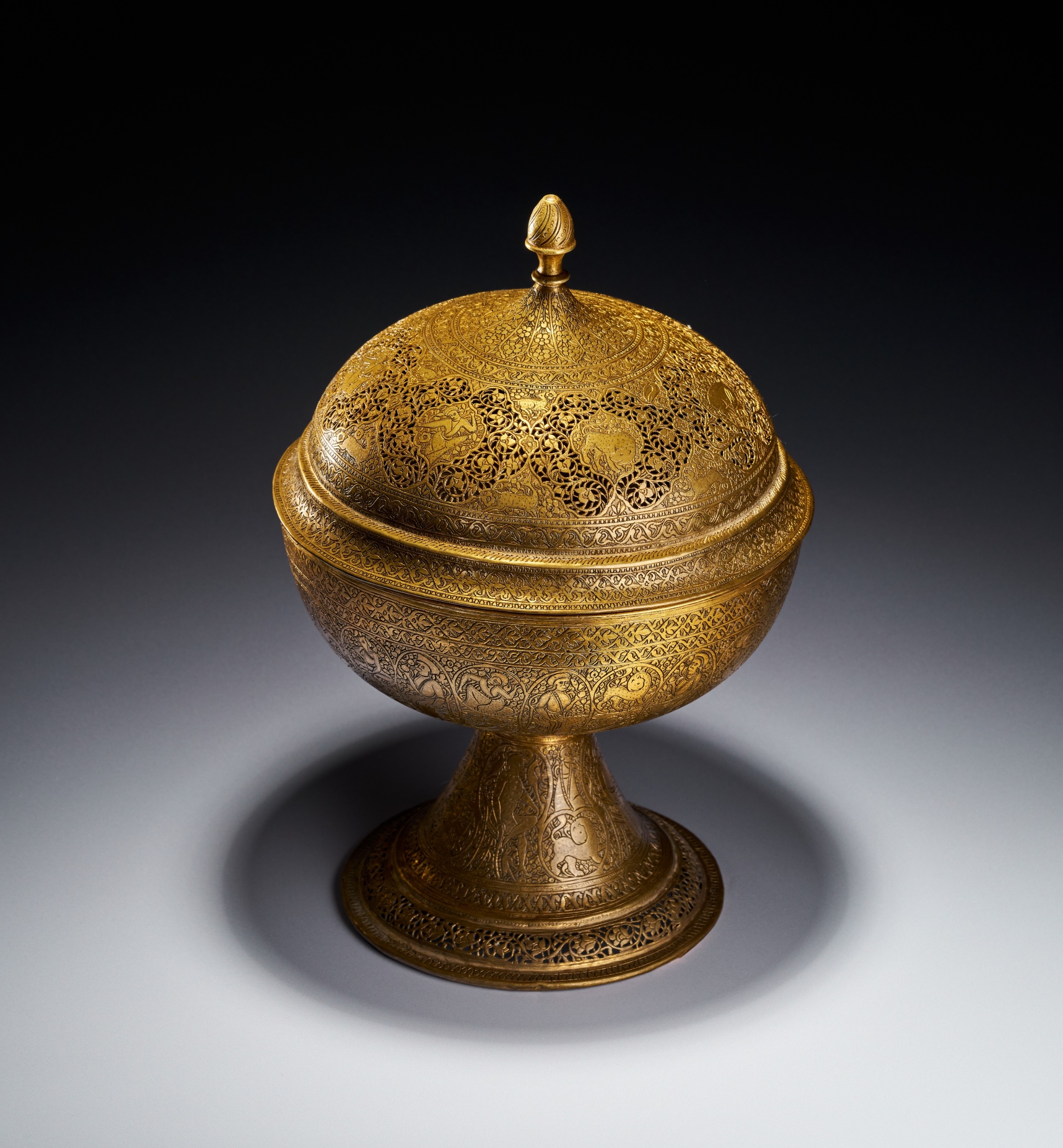 A PIERCED AND ENGRAVED BRASS PEDESTAL BOWL WITH COVER, LATE ZAND - EARLY QAJAR, 19TH CENTURY