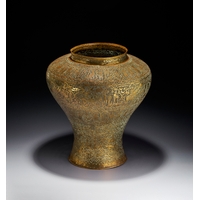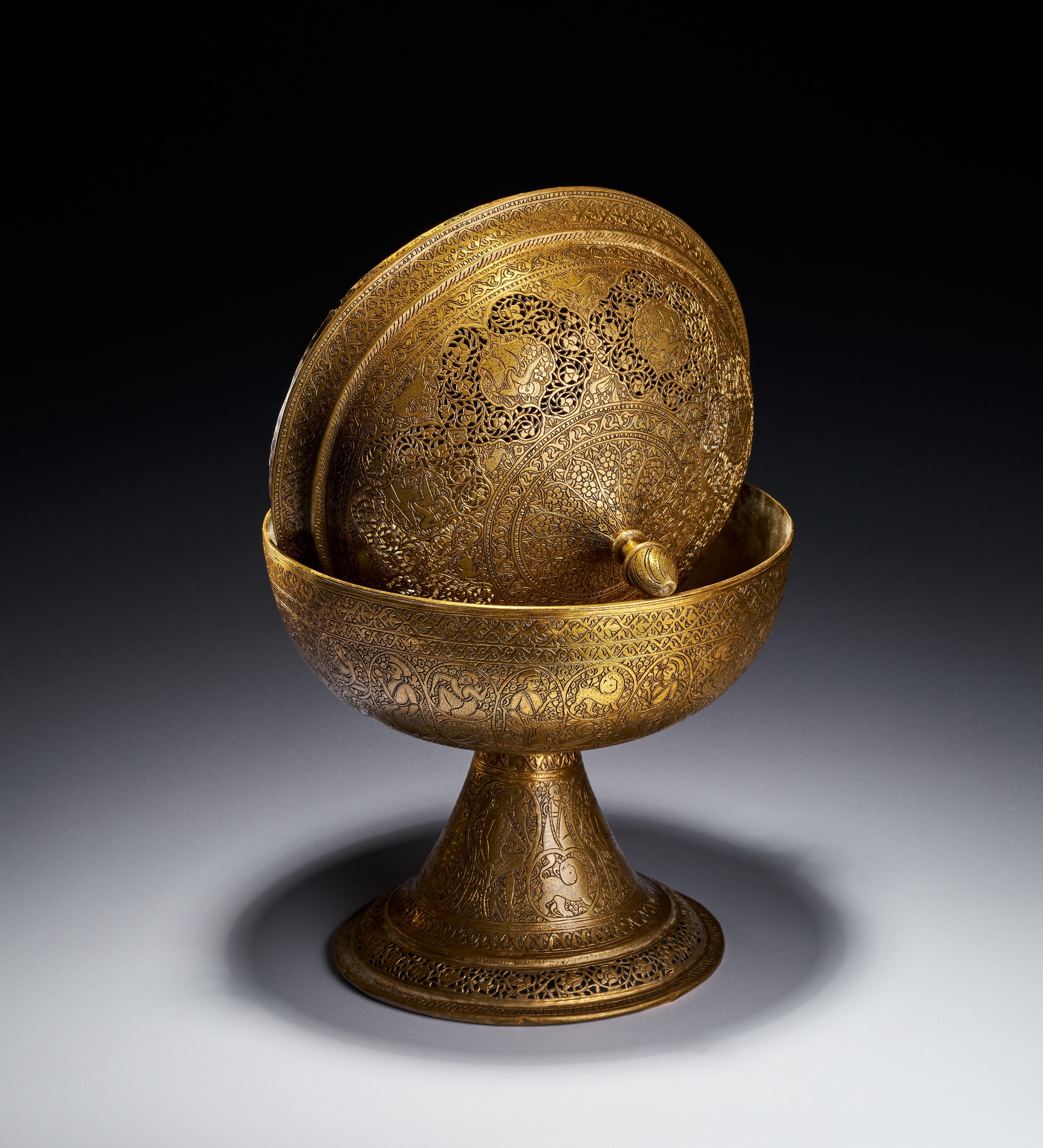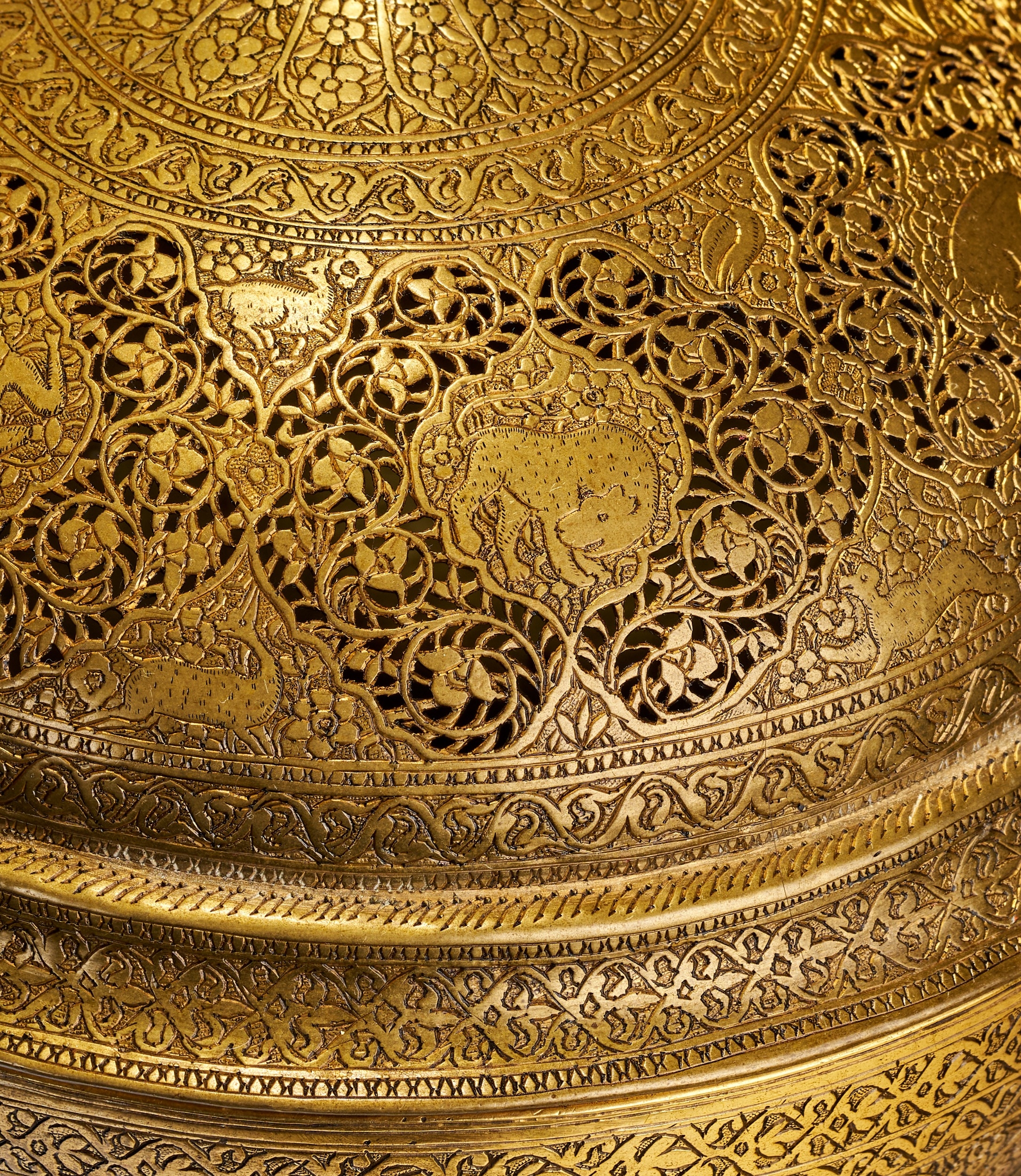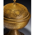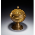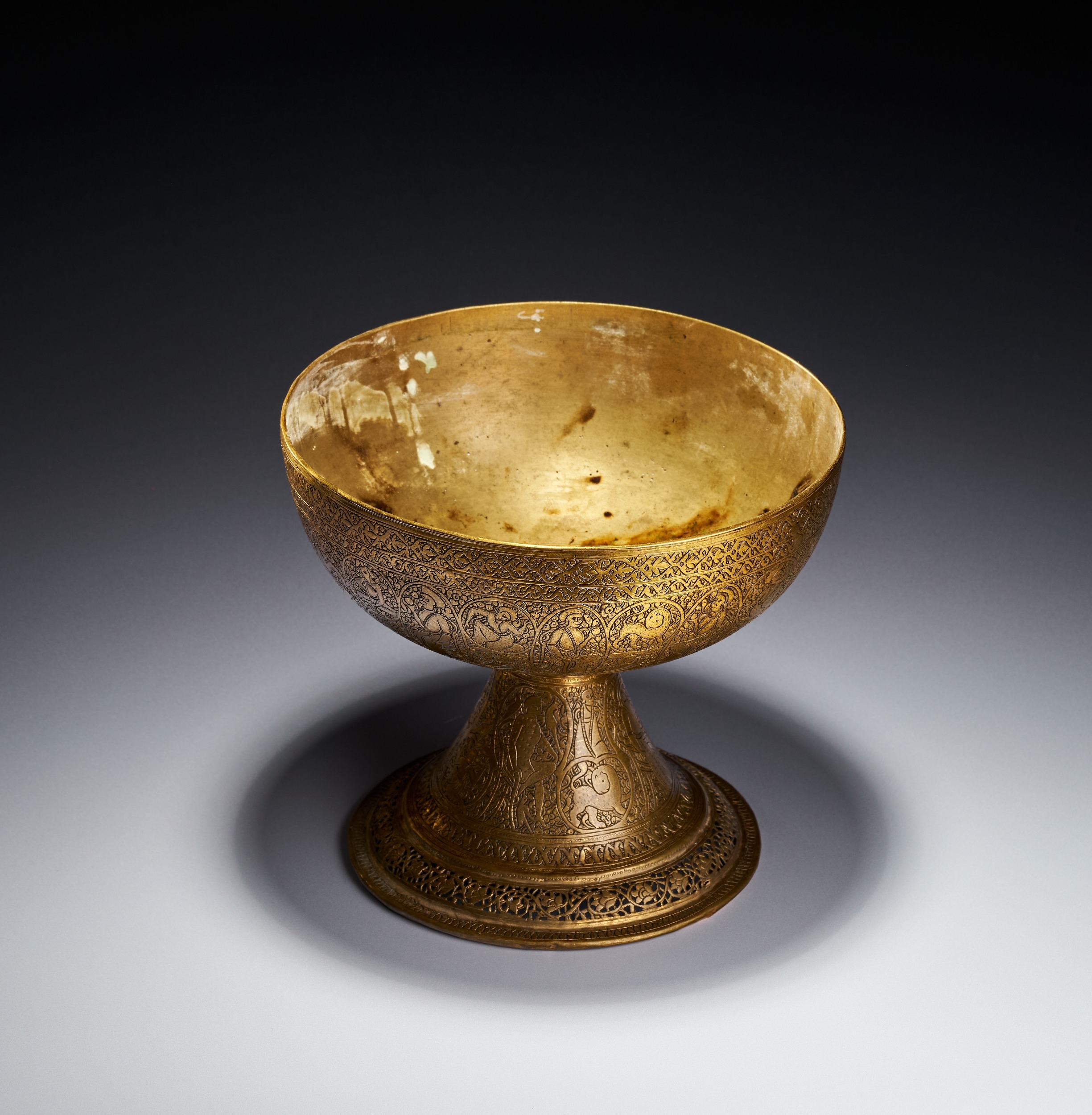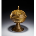 A PIERCED AND ENGRAVED BRASS PEDESTAL BOWL WITH COVER, LATE ZAND - EARLY QAJAR, 19TH CENTURY