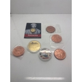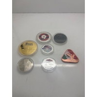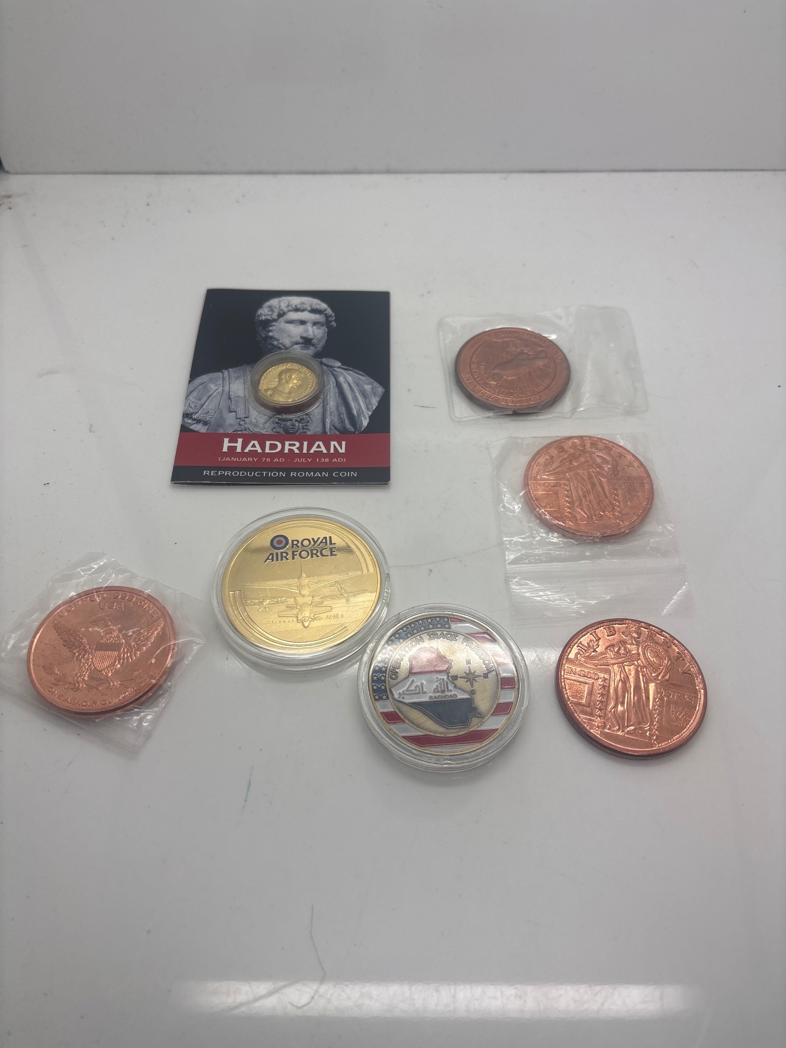 Reproduction coins including various designs and materials. Includes coins with historical thematic imagery, one packaged card labeled 'Hadrian,' and others in clear protective packaging.