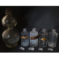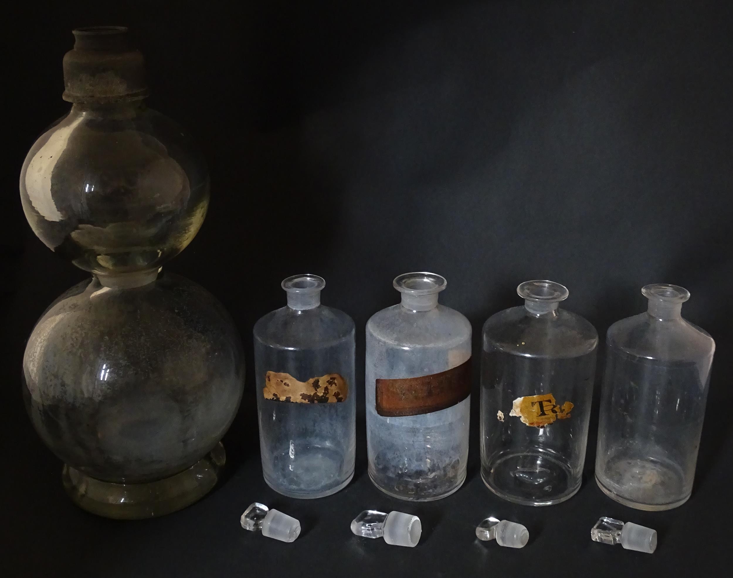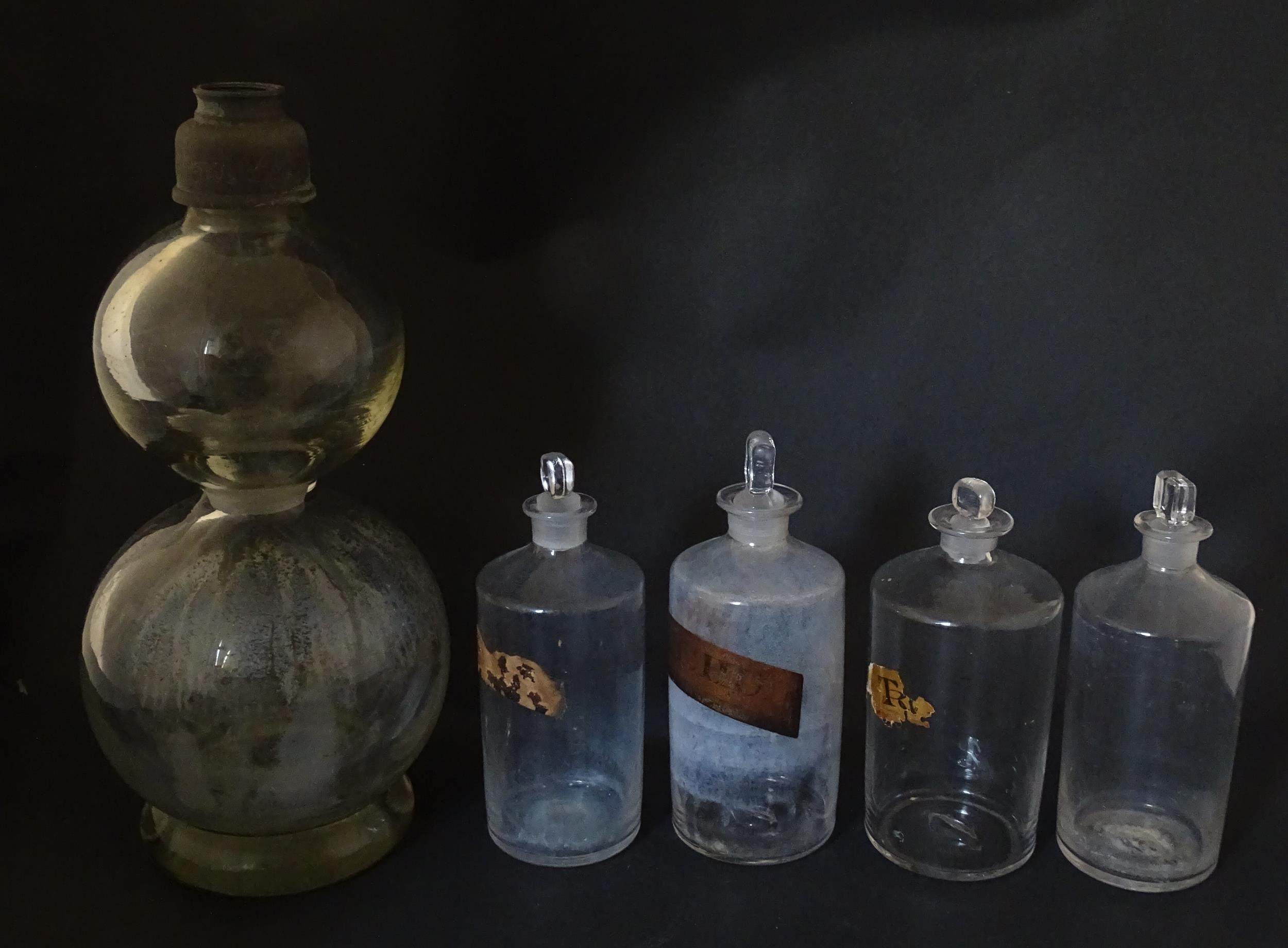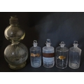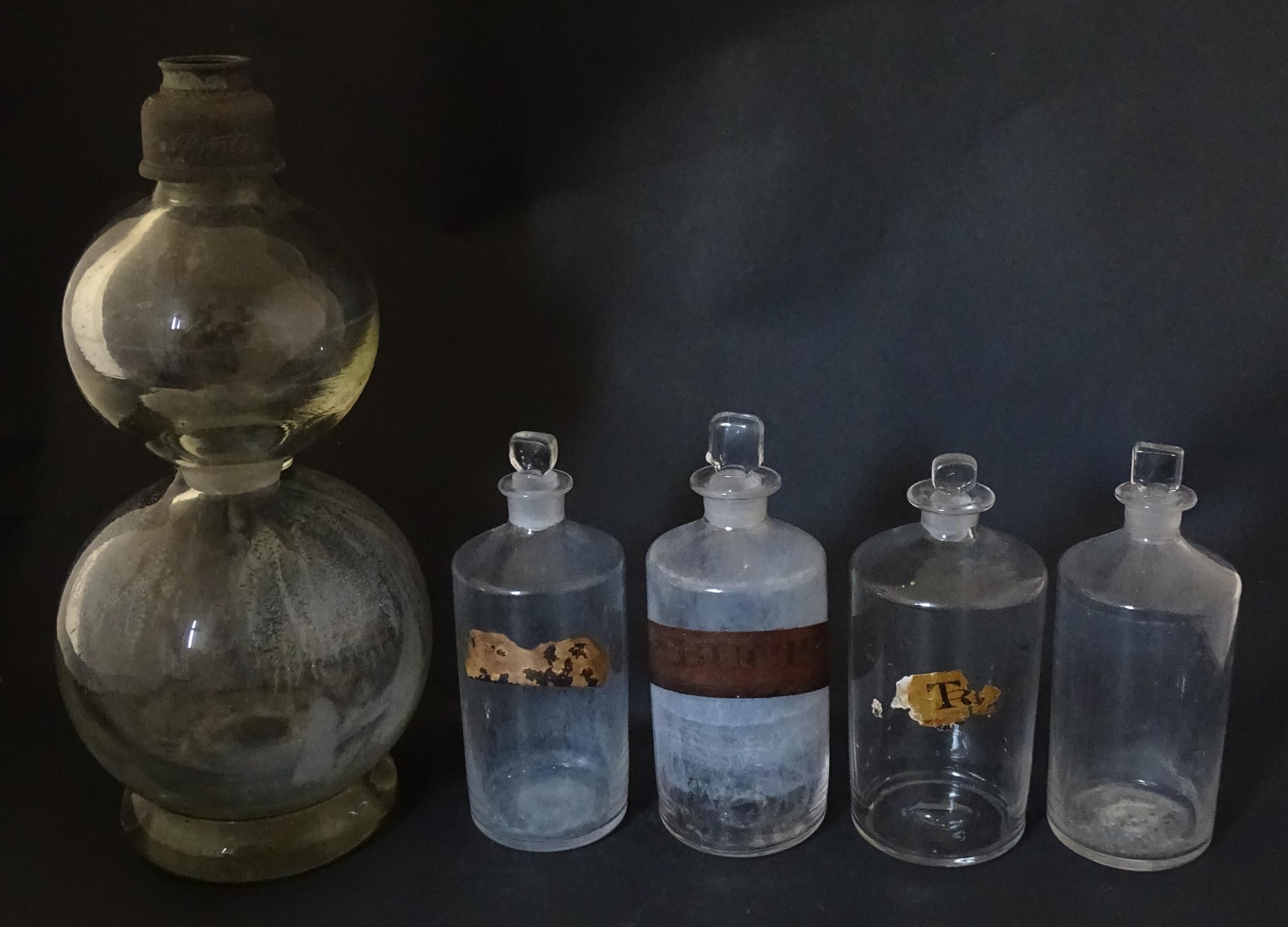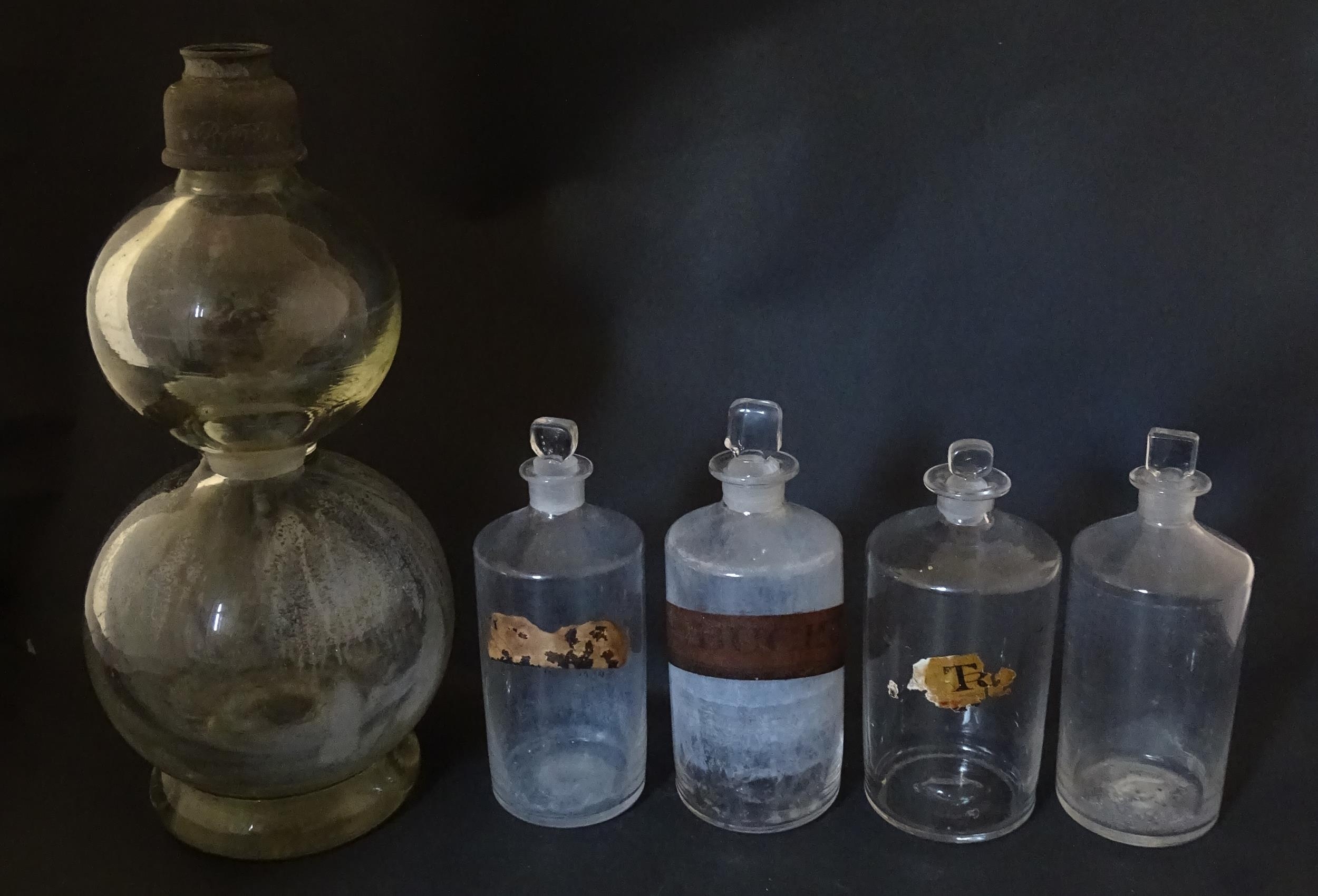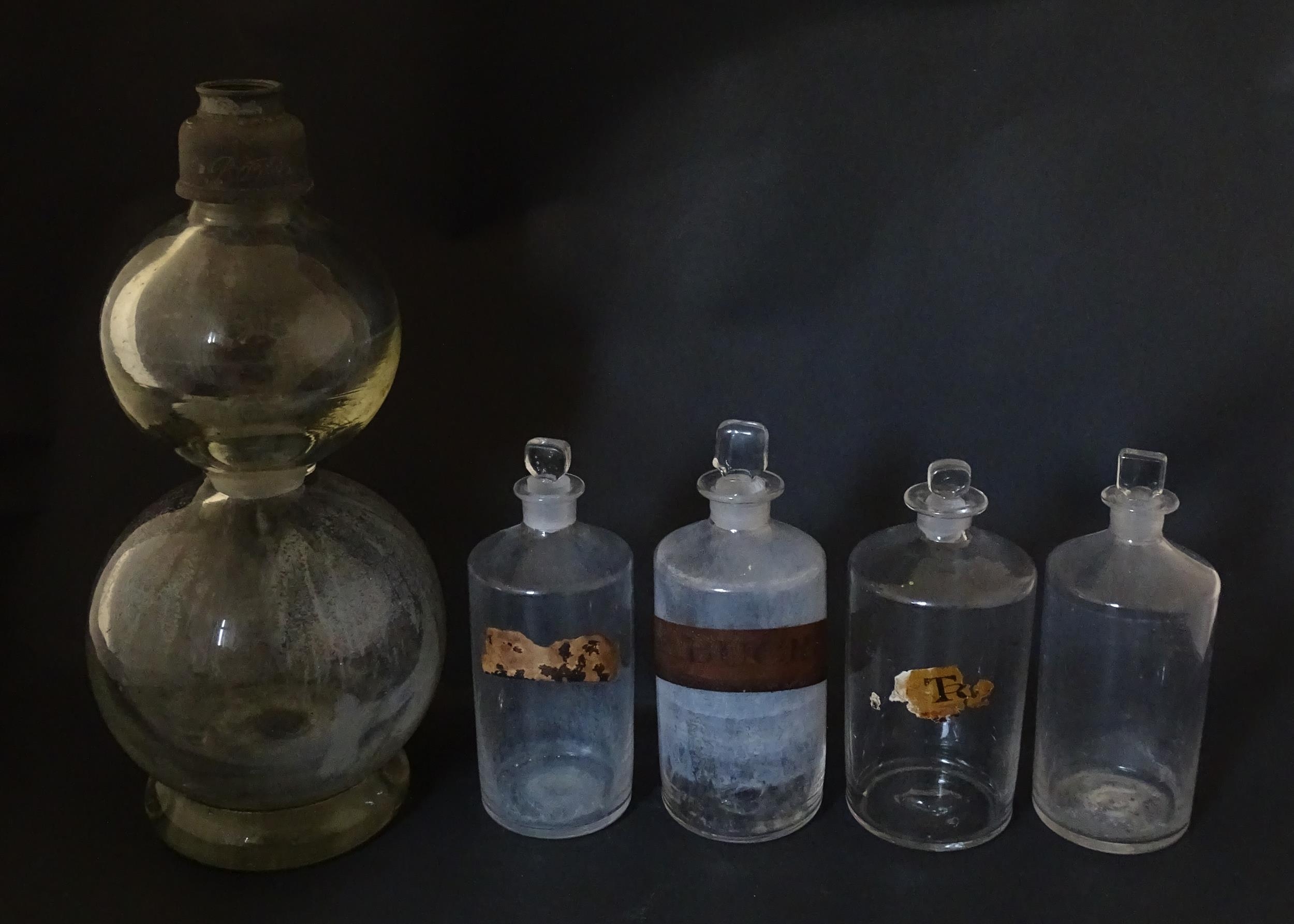 Assorted early 20thC chemist / pharmacy glassware vessels comprising a Boots Chemist double-gourd syphon, together with four storage jars, one labelled 'Tc. Buchu.' The largest approx 14 1/4" high (5)