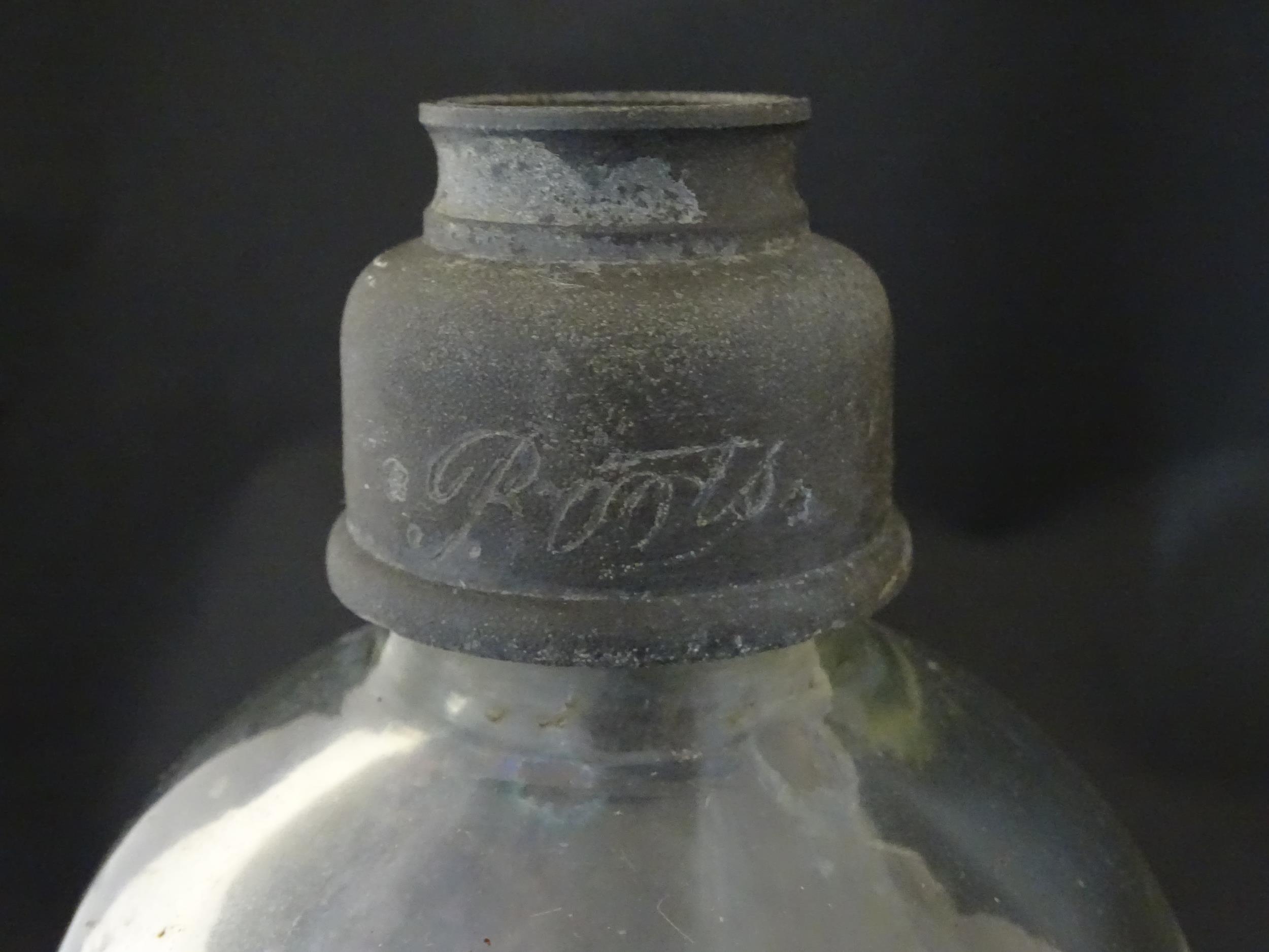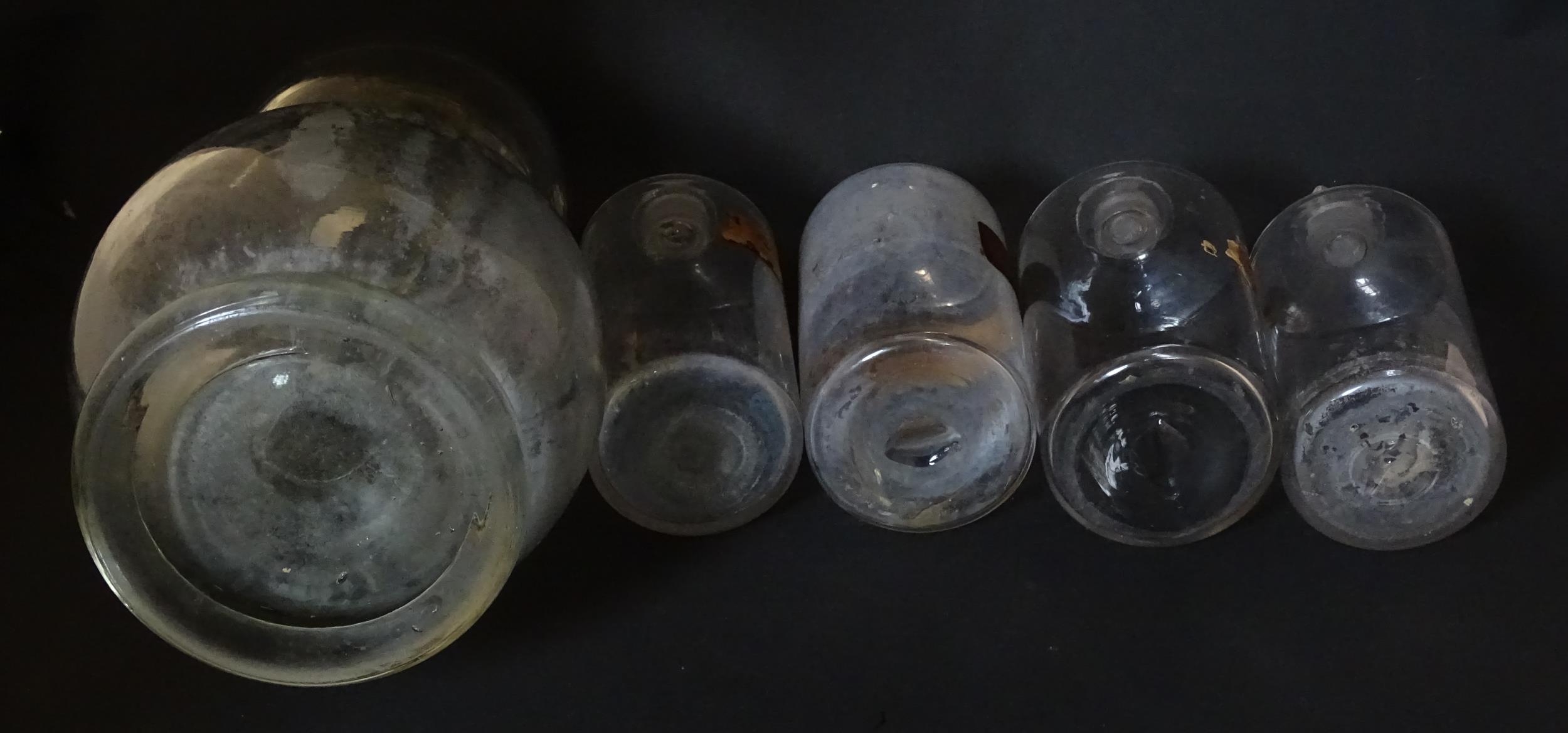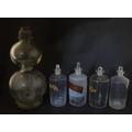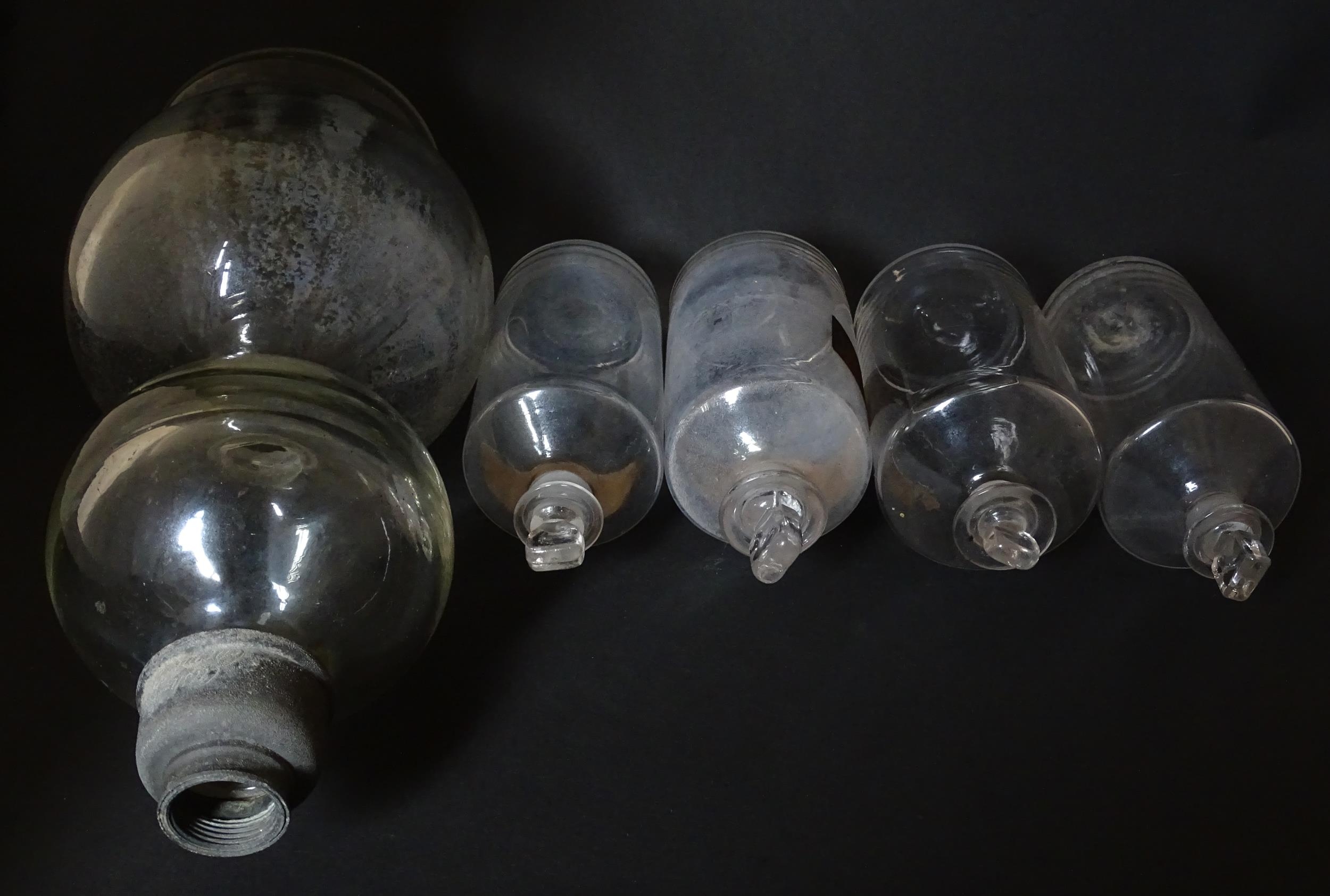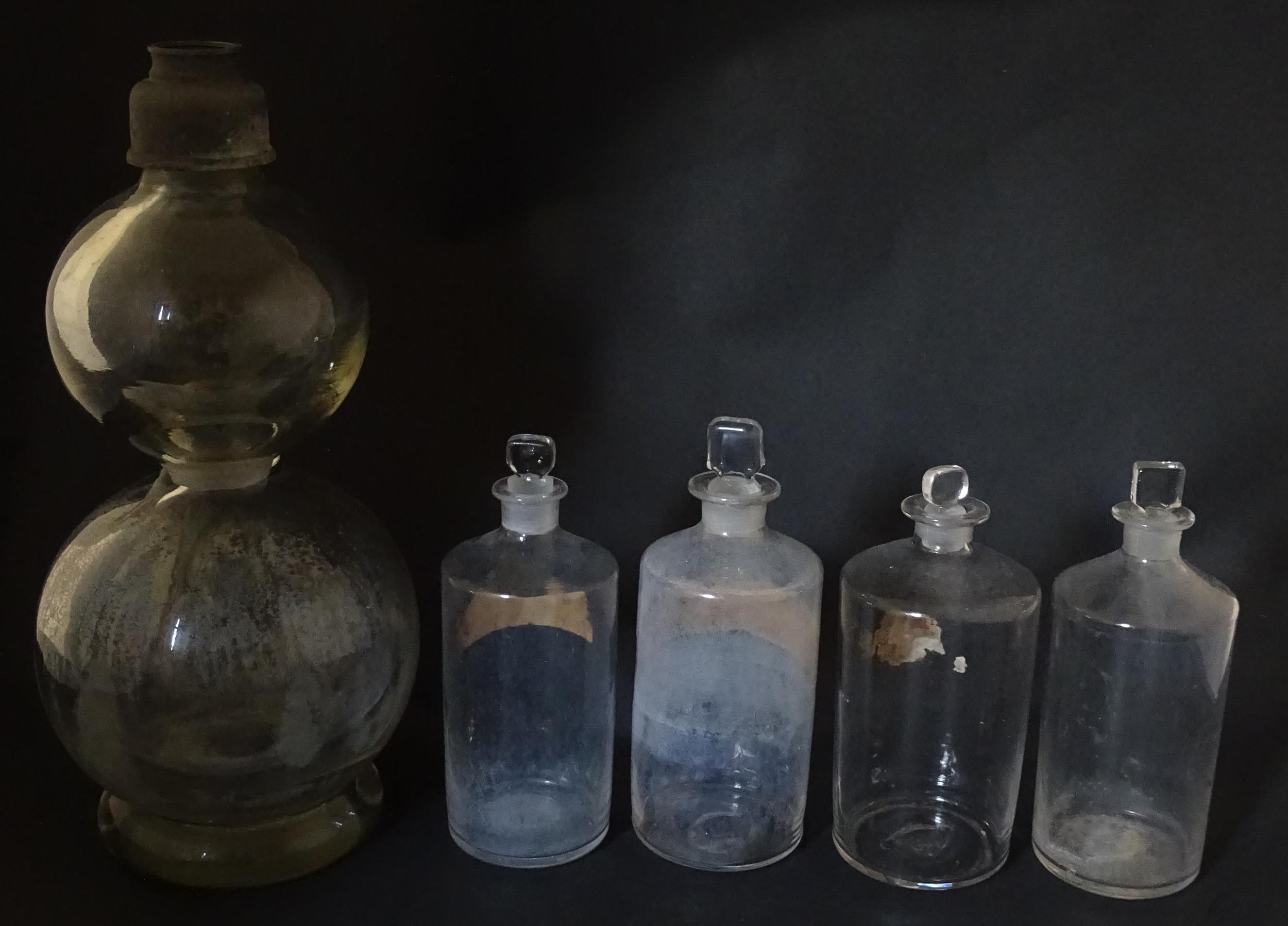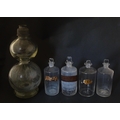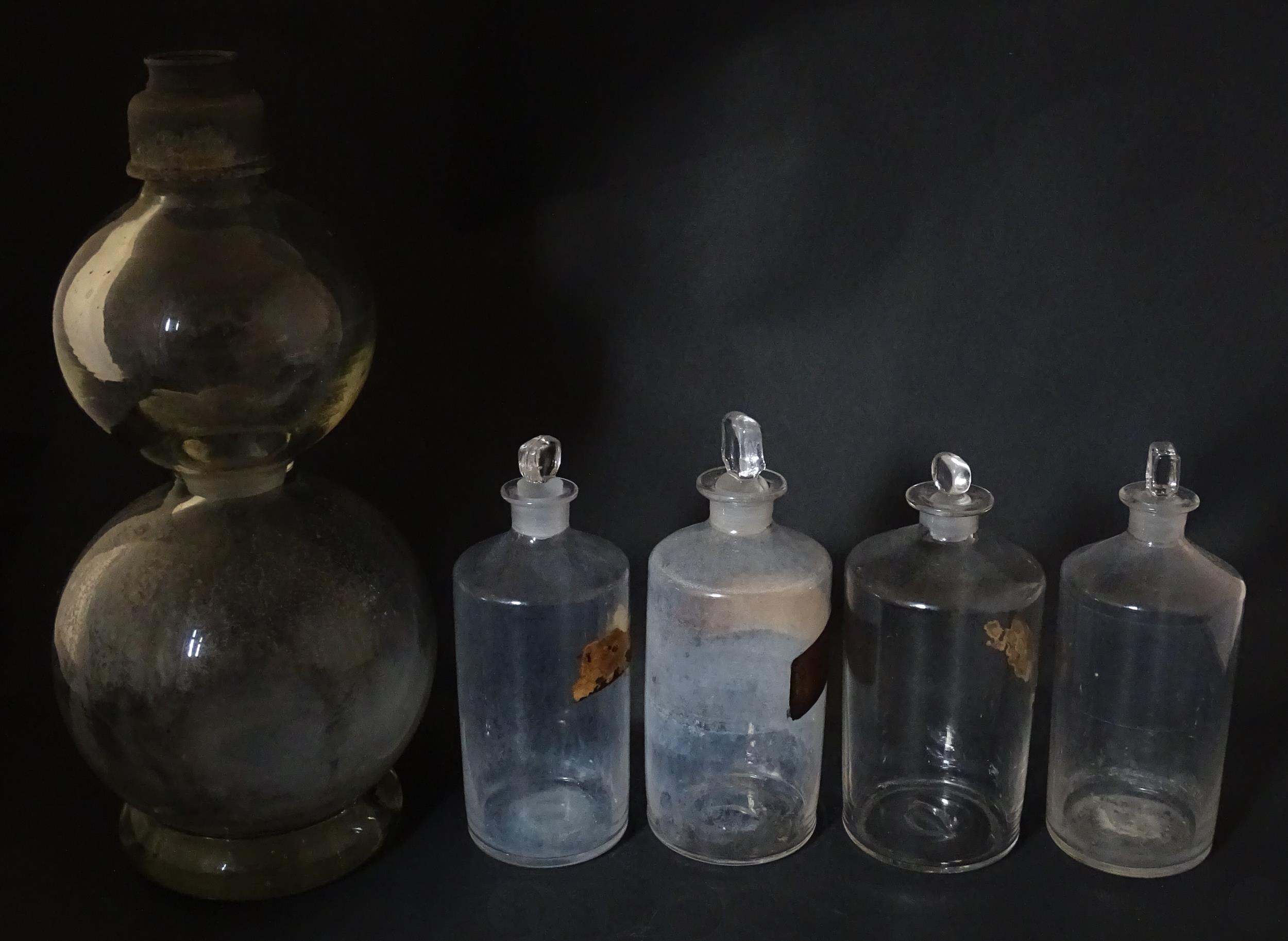 Assorted early 20thC chemist / pharmacy glassware vessels comprising a Boots Chemist double-gourd syphon, together with four storage jars, one labelled 'Tc. Buchu.' The largest approx 14 1/4" high (5)