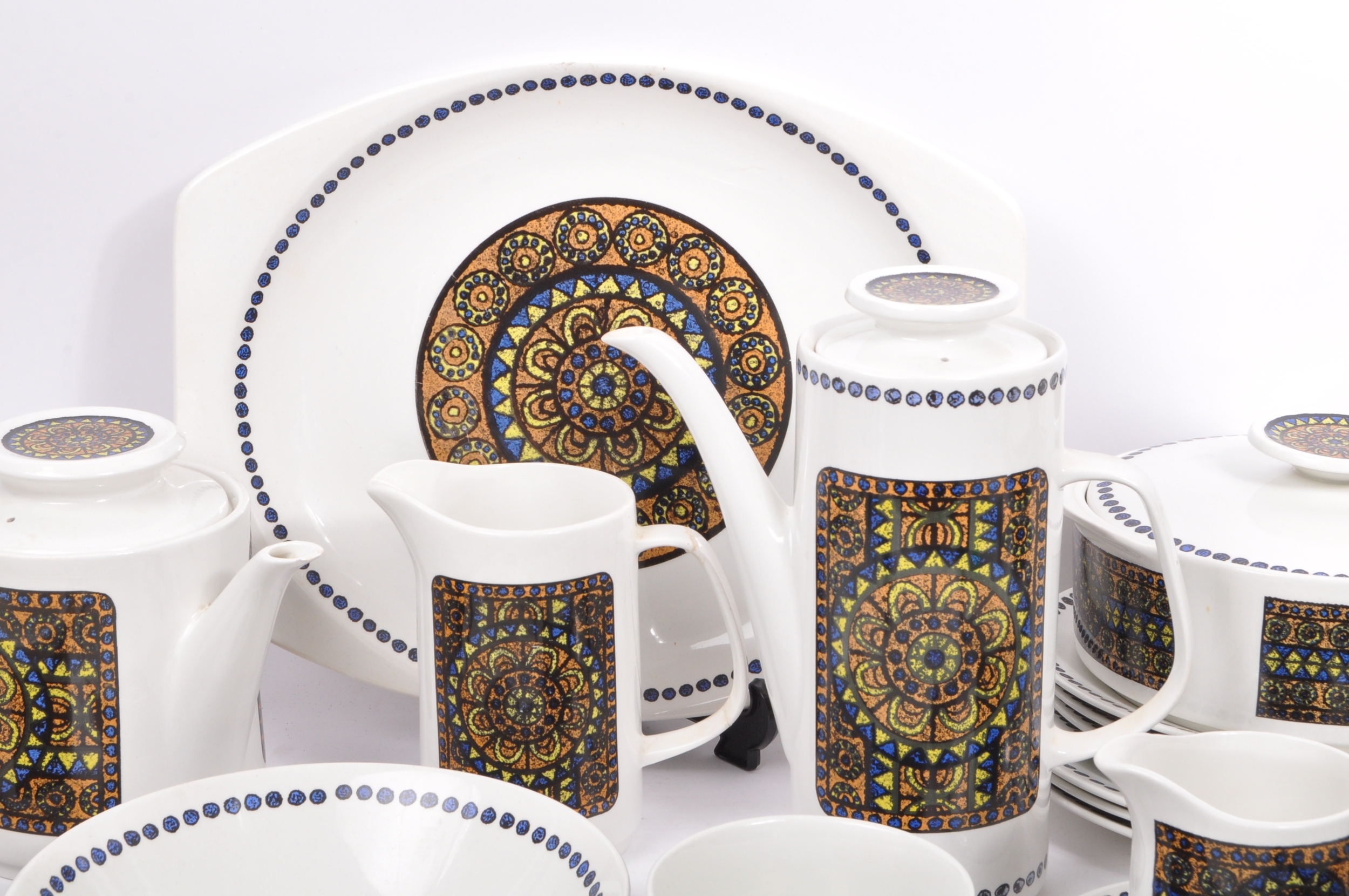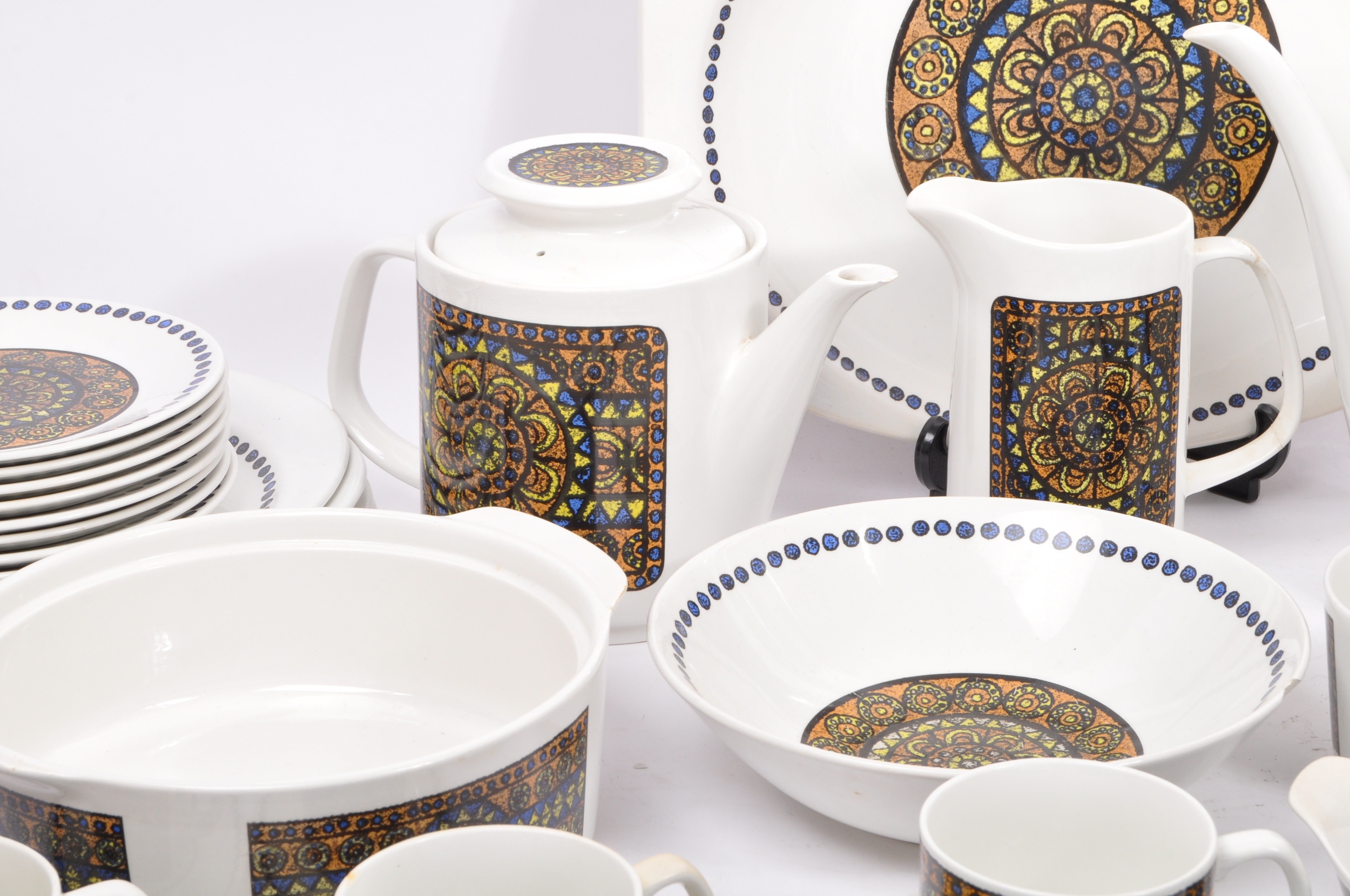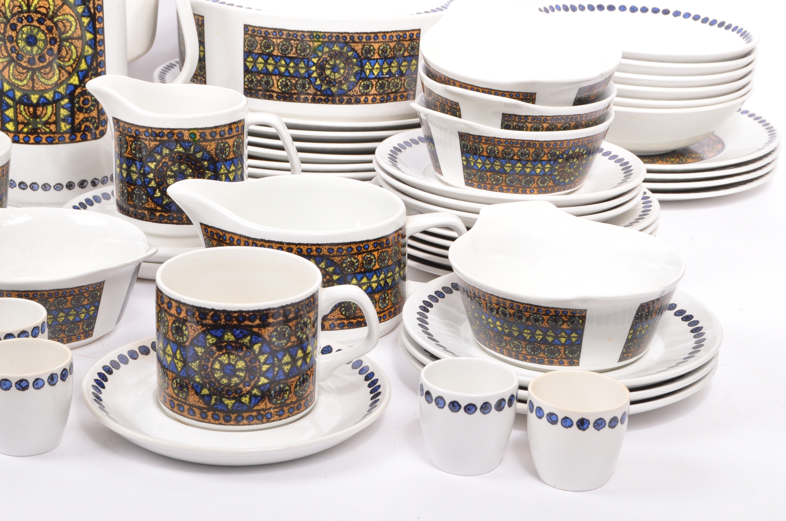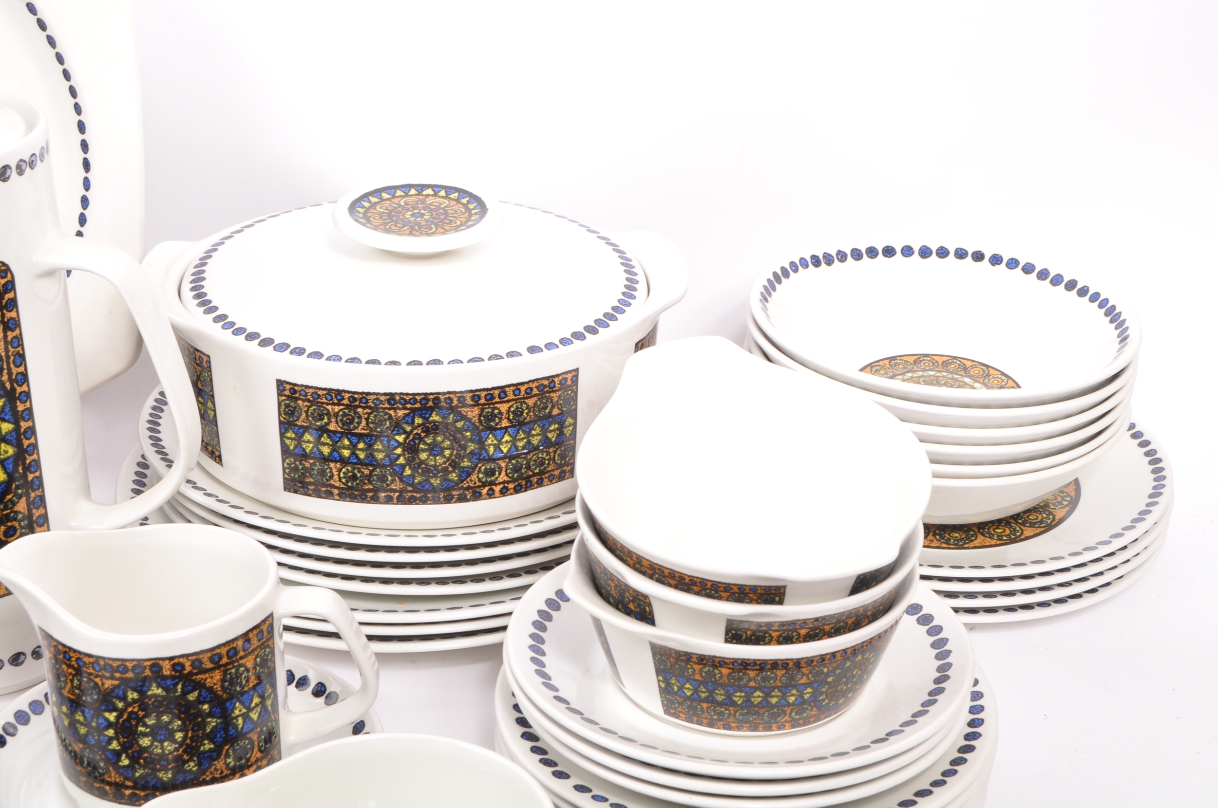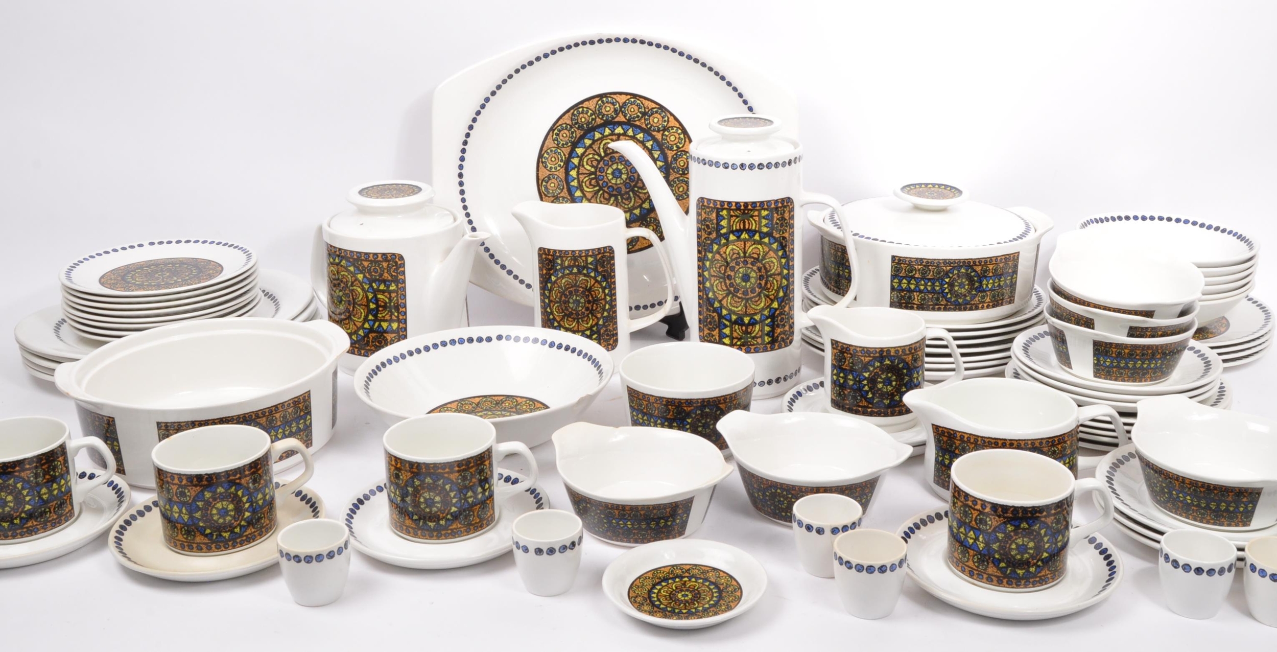 A J&G Meakin, Staffordshire, England retro dinner & tea service in the studio pattern. The set comprising, meat platters, tureens, soup bowls, cups and saucers, , jug, dinner plates, coffee pot, teapot etc