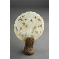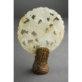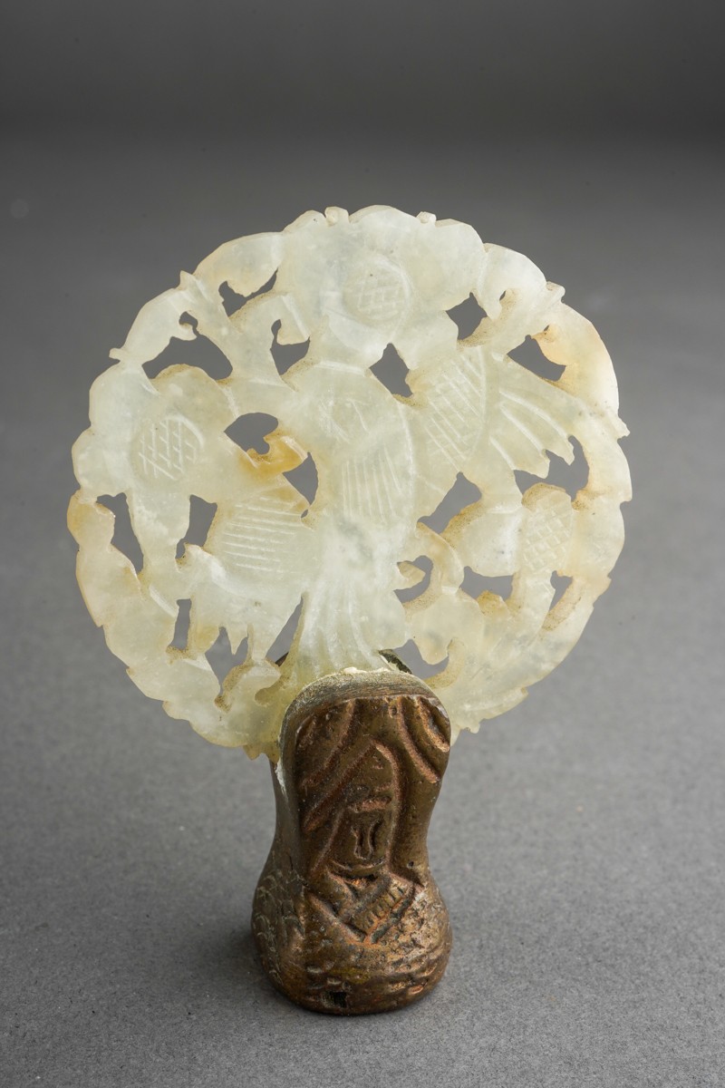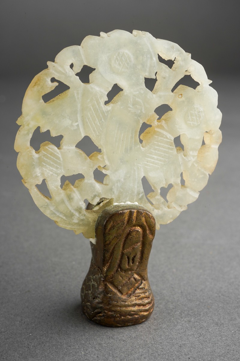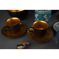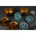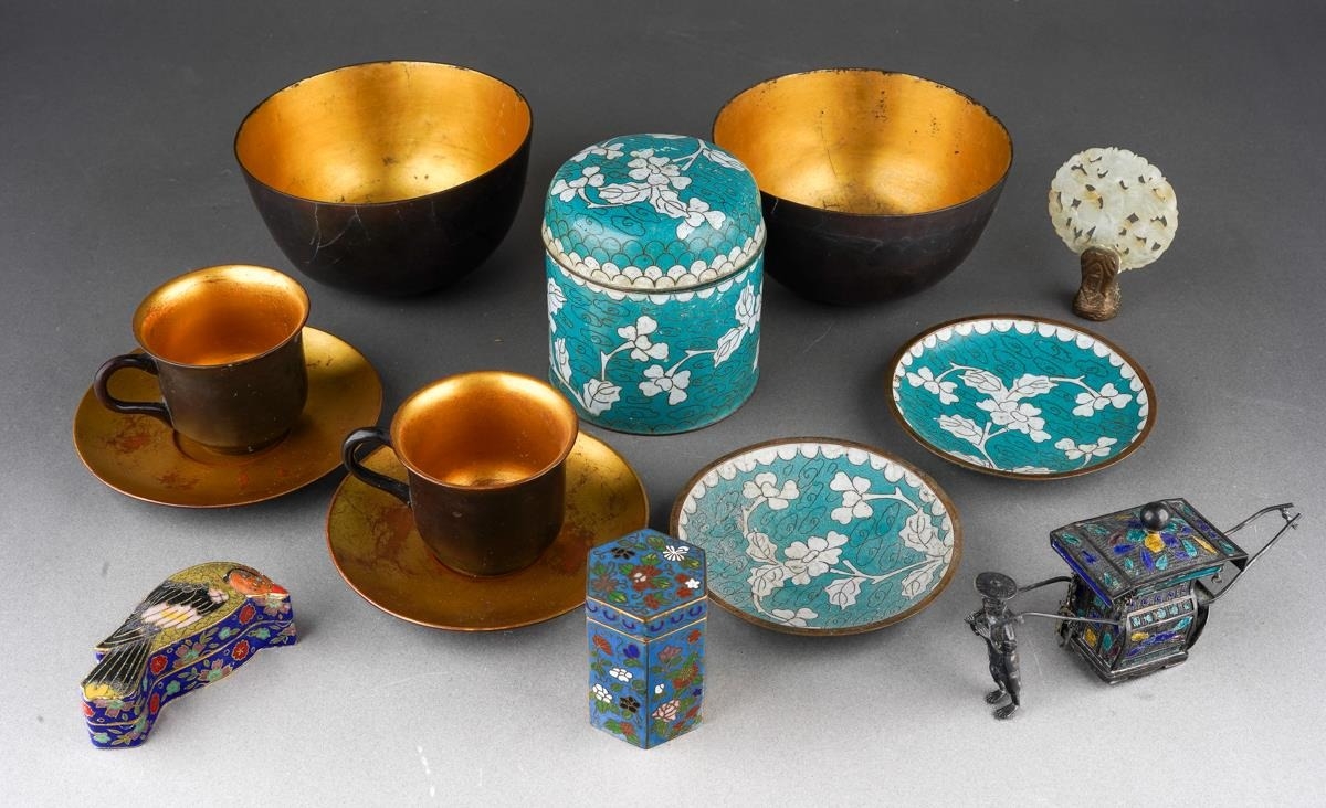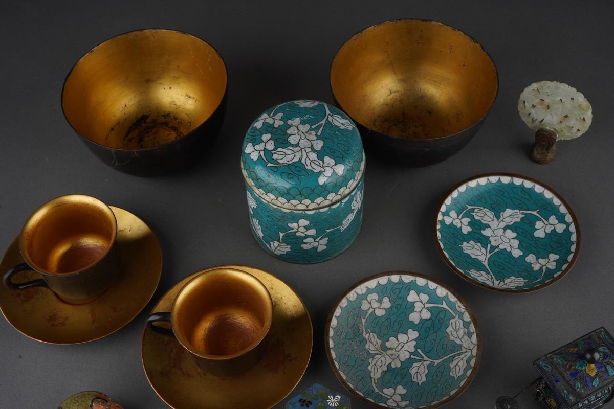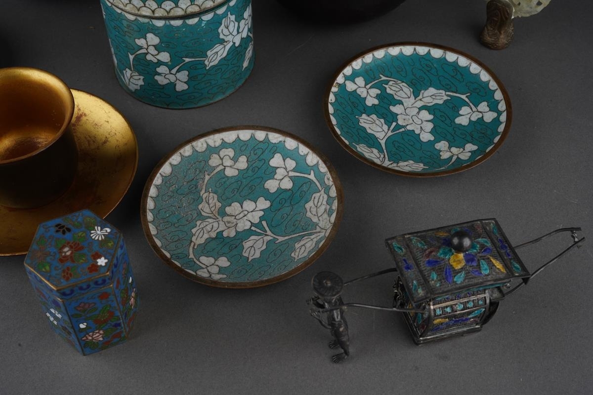 A group of Oriental metalware, jadeite and papier mache, comprising a white metal and enamel sedan chair, missing one figure, stamped WK 90 with character mark, length 12cm approx, five pieces of modern cloisonne, a carved jadeite disc set in a small gilt bronze screw thread base, height 6.8cm approx, six pieces of Foochow lacquered papier mache cups, saucers and bowls, a.f., (1 box)