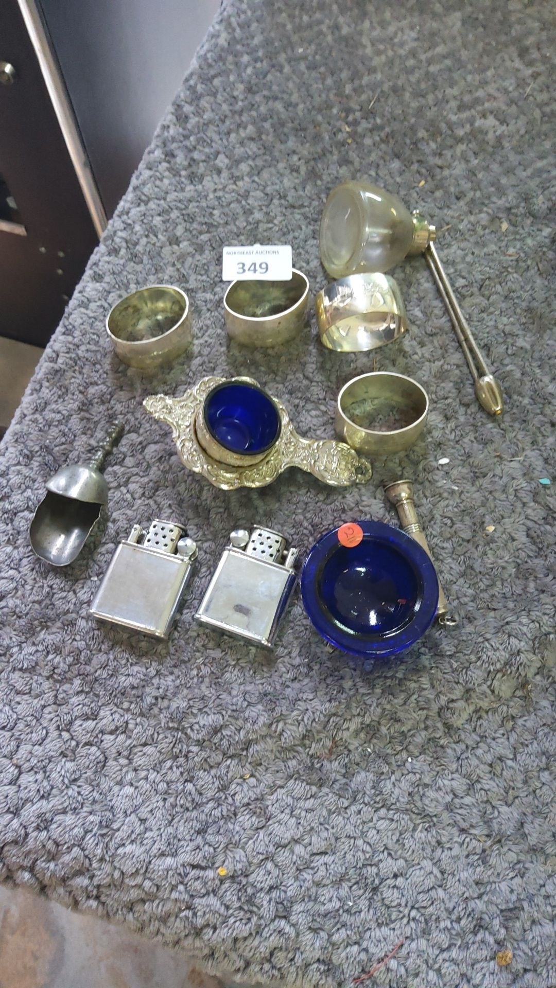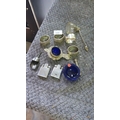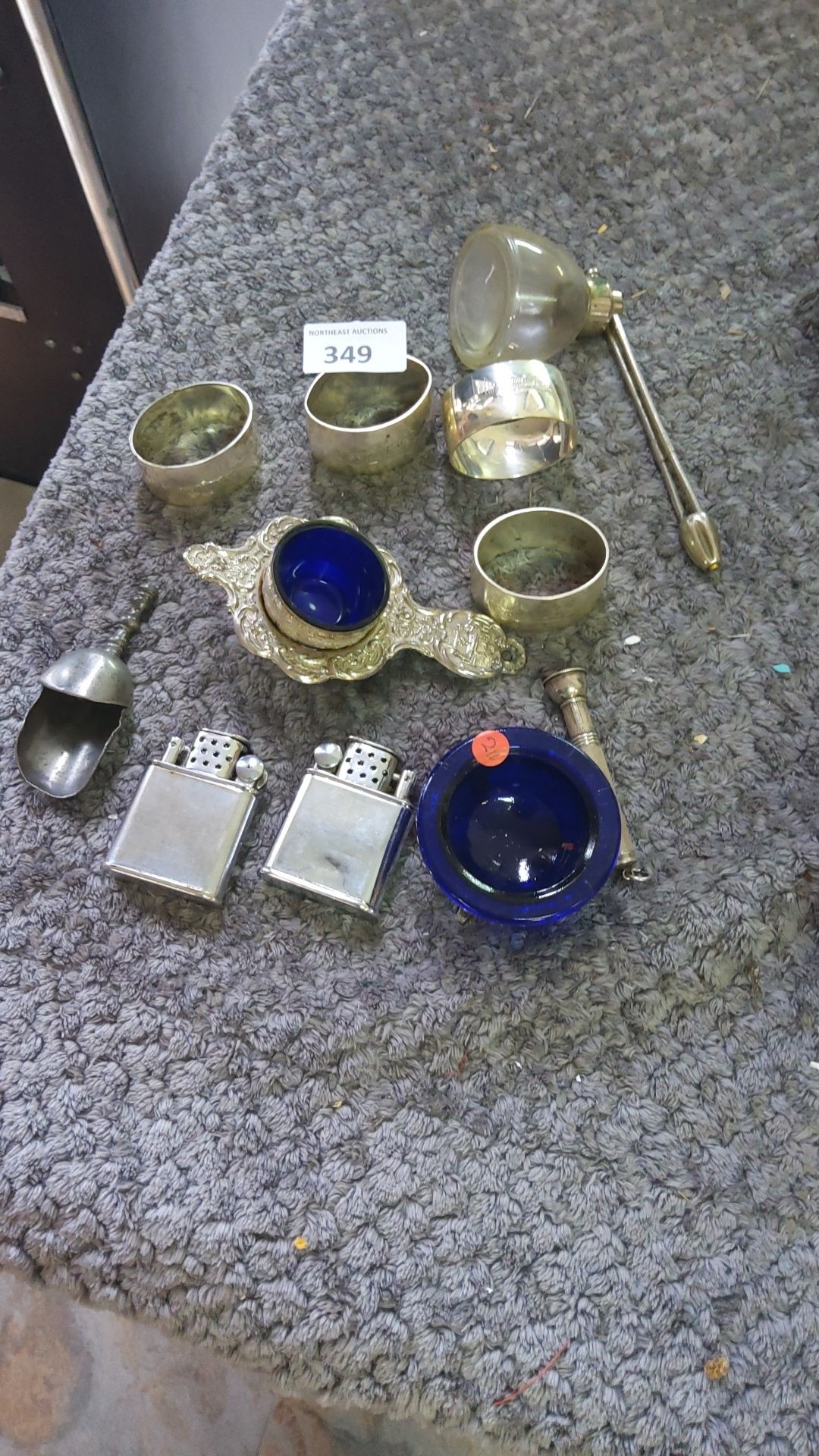 Mixed metalware collection featuring silver napkin rings, ornate salt cellars with cobalt blue liners, vintage lighters, and assorted small decorative items.
