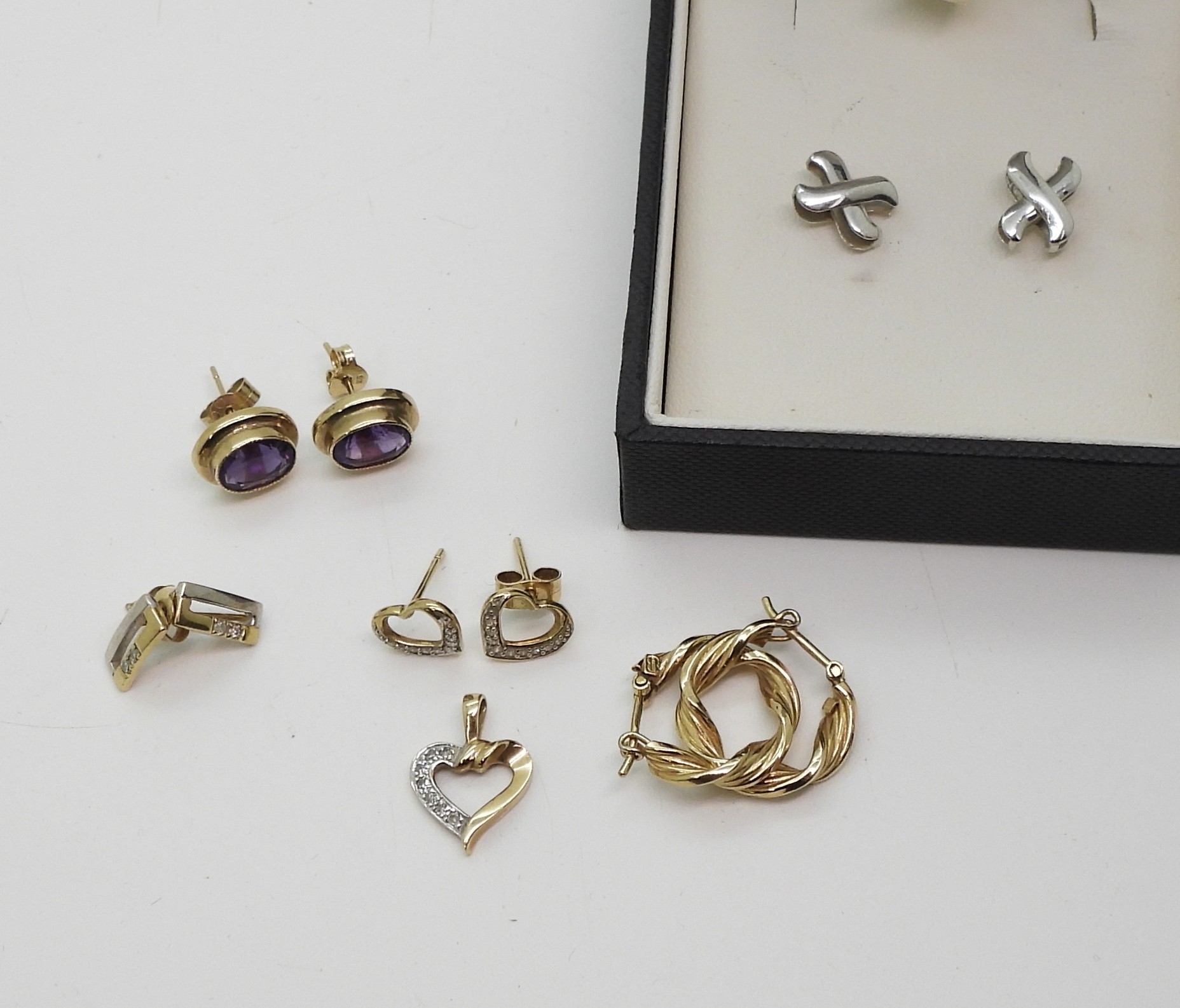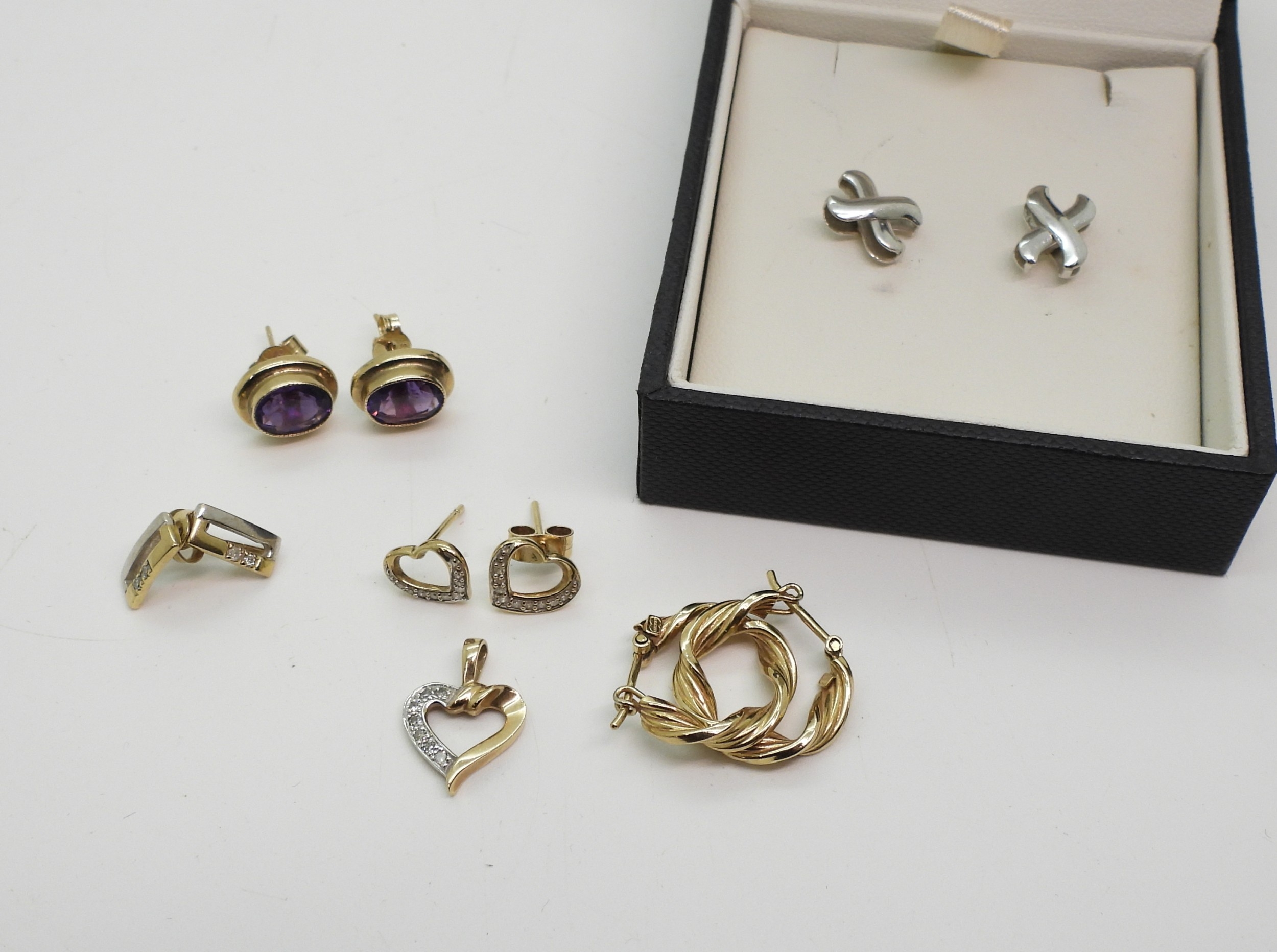 A pair of 18ct white gold cross earrings weight 1.3gms, together with a pair of 9ct gold heart shaped earrings set with diamonds and matching pendant and a further three pairs of 9ct gold earrings to include UnoAerre, weight all together 6.3gms