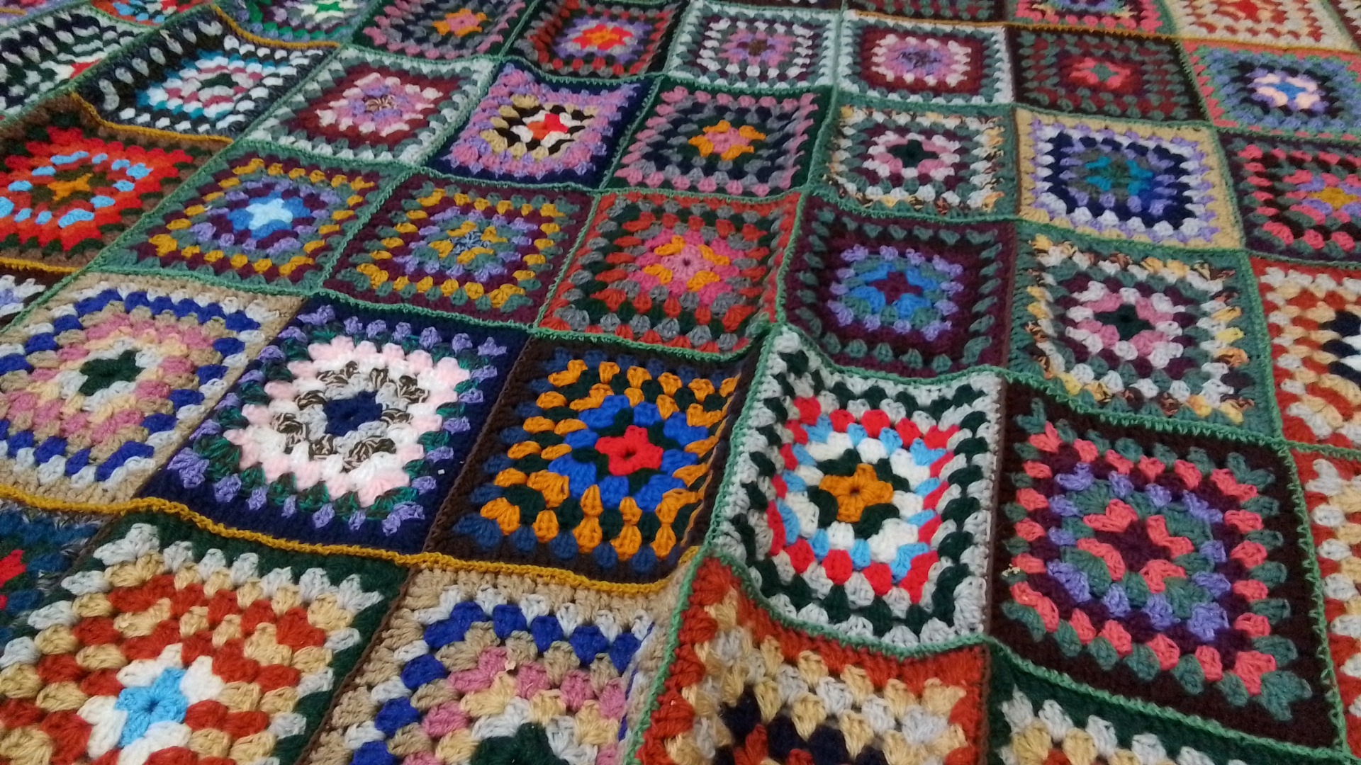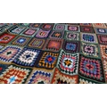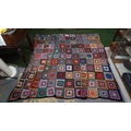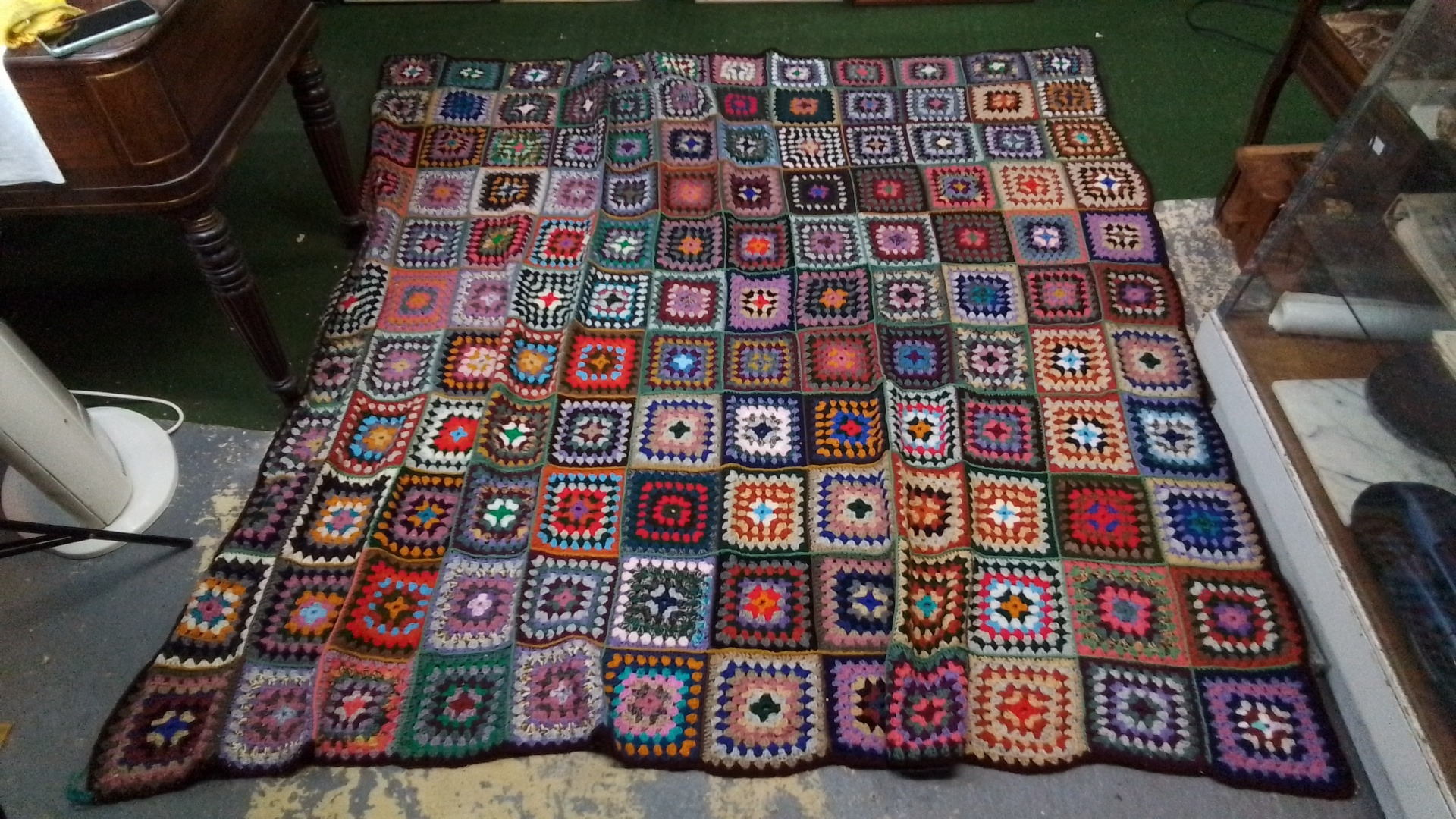 A large vintage crocheted patchwork blanket of “granny square” panels in polychrome wool, joined in a rectilinear field with a narrow border; hand-made work, 210cm x 210cm.